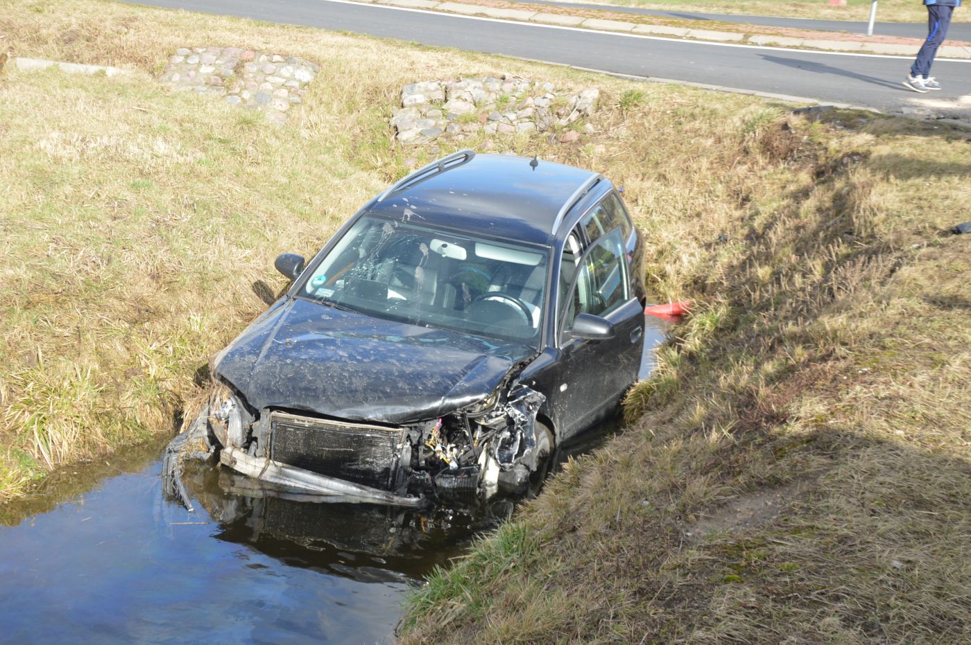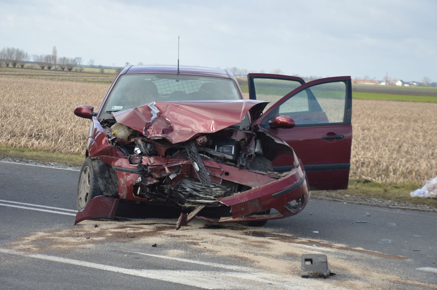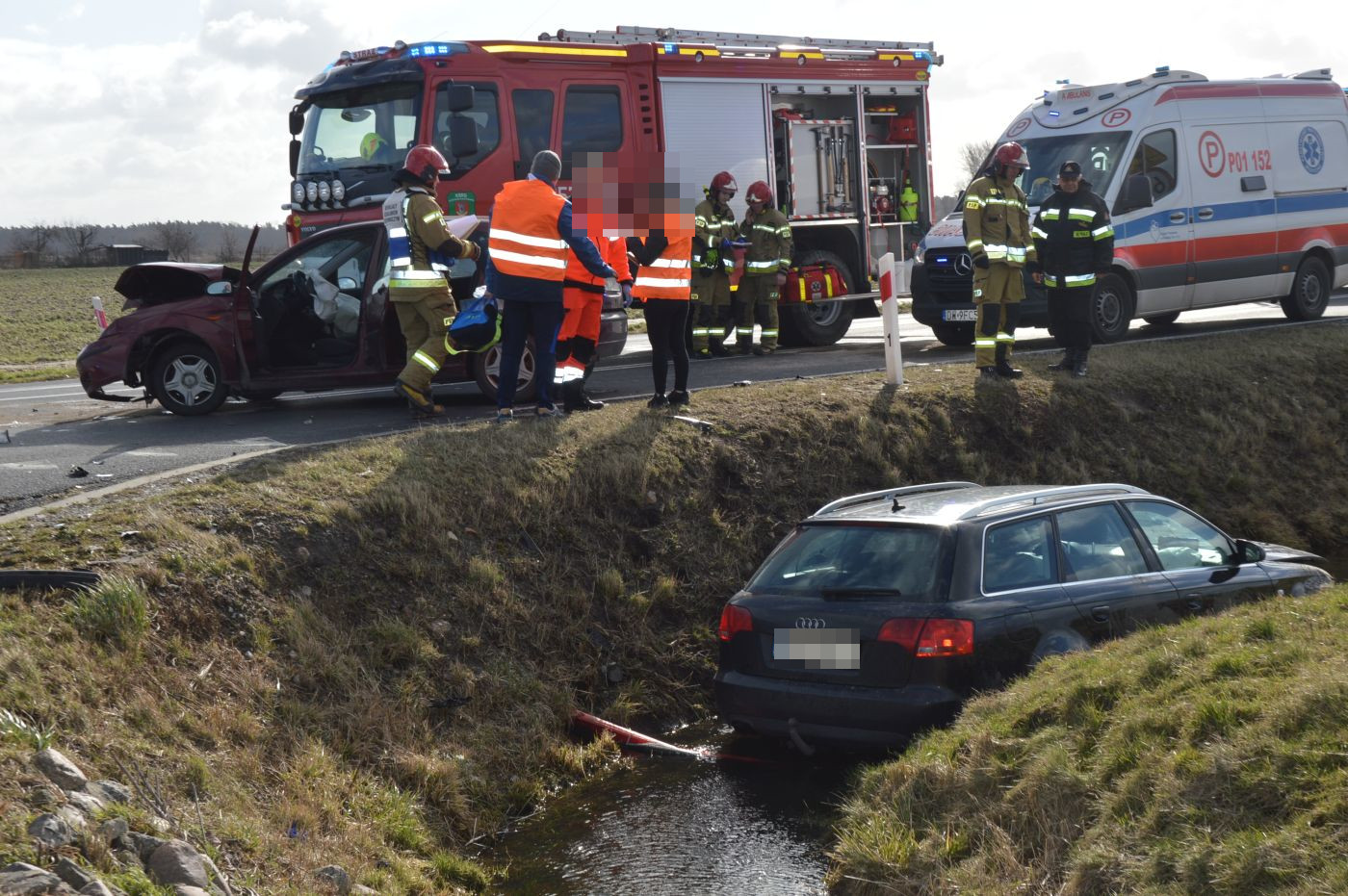 W wyniku „konfrontacji”, audi prowadzone przez ciężarną kobietę wjechało do przydrożnego rowu częściowo wypełnionego wodą, natomiast ford z mocno rozbitym przodem zablokował pas ruchu.