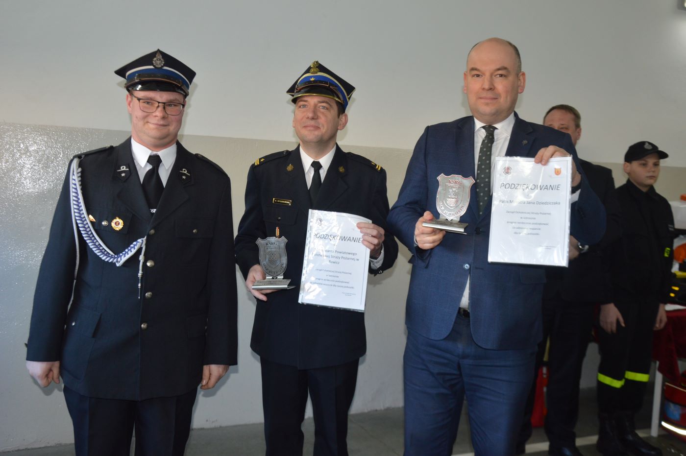 W uroczystym spotkaniu uczestniczyli także: reprezentujący Wielkopolskiego Komendanta Wojewódzkiego PSP mł.bryg. Marcin Wysokiński, komendant powiatowy PSP w Rawiczu, Romuald Krzyżosiak, burmistrz Miasta i Gminy Jutrosin, mł. bryg. Krzysztof Skrzypczak, zastępca komendanta powiatowego PSP w Rawiczu oraz dh Artur Pawlak, komendant gminny ZOSP RP w Jutrosinie.