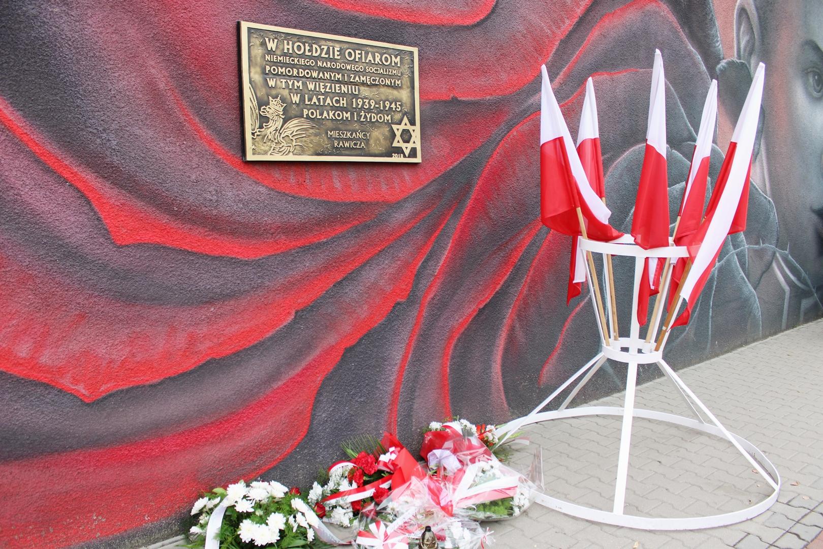 Tam, pod tablicą pamiątkową poświęconą Polakom i Żydom, ofiarom niemieckiego narodowego socjalizmu, pomordowanym i zamęczonym w rawickim więzieniu w latach 1933-1945, złożono wiązanki kwiatów.