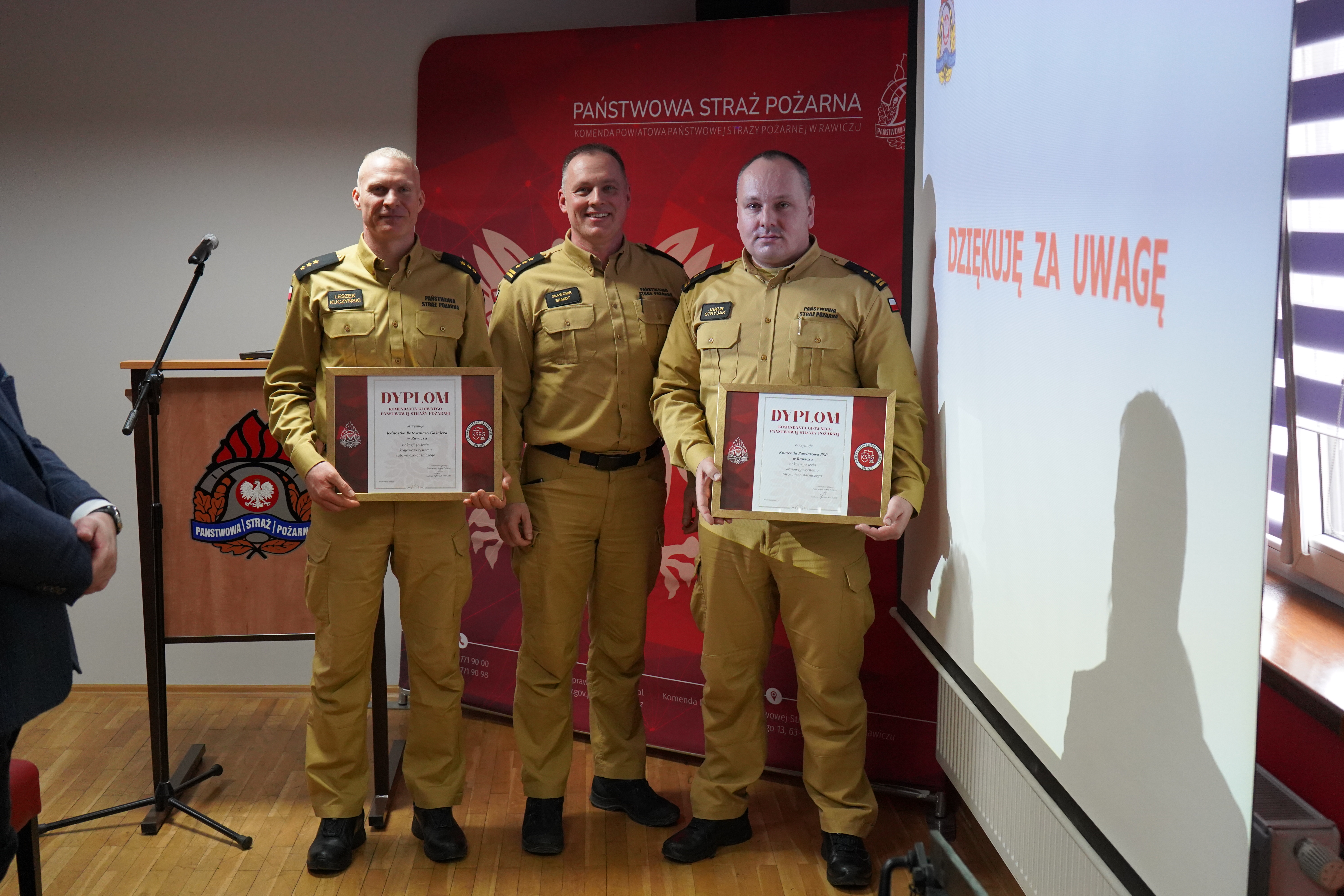 Podczas uroczystości wręczono Dyplomy Komendanta Głównego PSP dla Komendy Powiatowej PSP w Rawiczu oraz Jednostki Ratowniczo-Gaśniczej w Rawiczu z okazji 30-lecia krajowego systemu ratowniczo-gaśniczego.