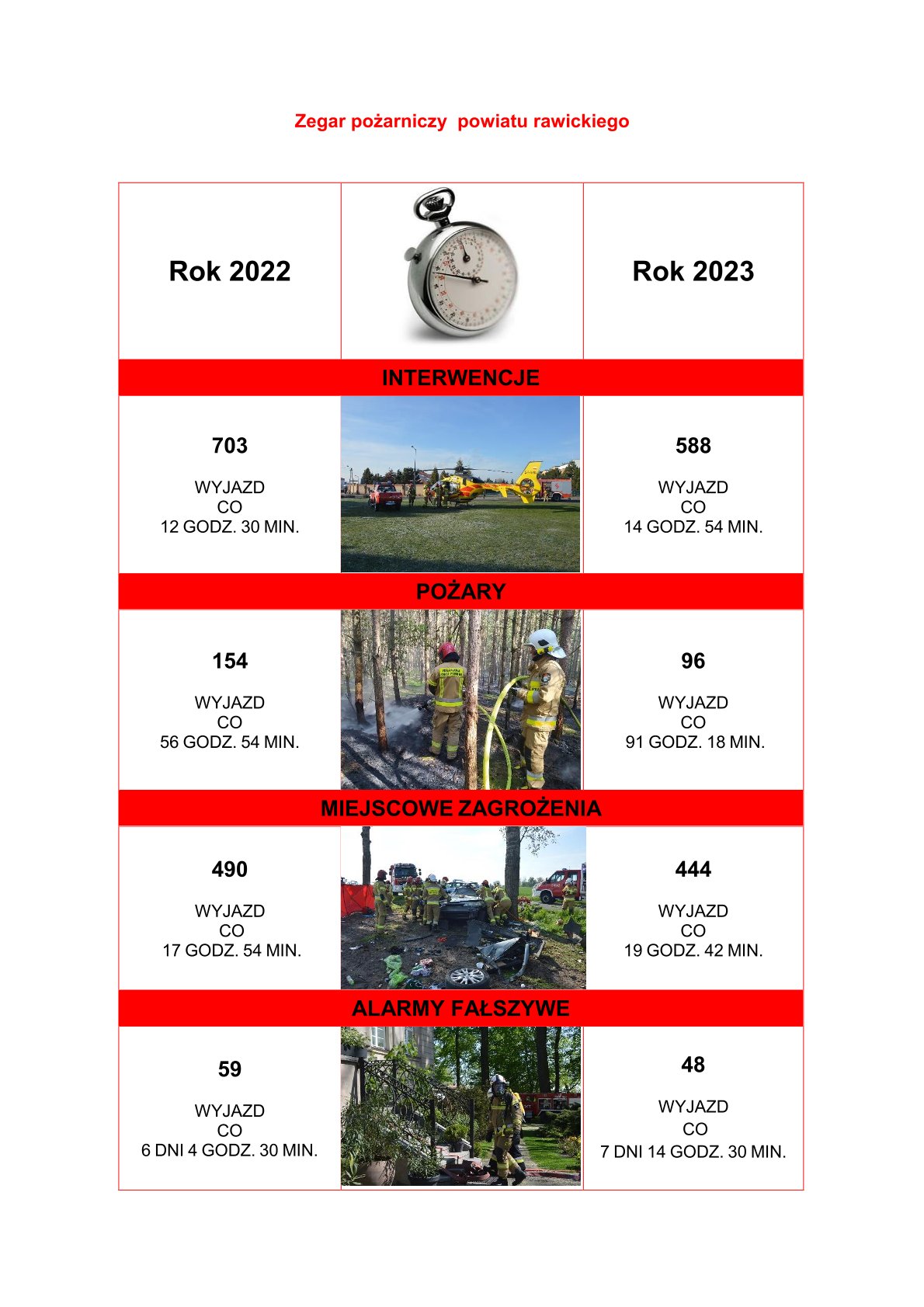 W 2023 roku rawiccy strażacy odnotowali 588 interwencji. Jest to o 115 interwencji mniej niż w 2022 roku. W gaszeniu pożarów i usuwaniu skutków miejscowych zagrożeń uczestniczyło łącznie 4654 strażaków Państwowej Straży Pożarnej i ochotniczych straży pożarnych, którzy podczas akcji wykorzystali 1121 pojazdów ratowniczo-gaśniczych.