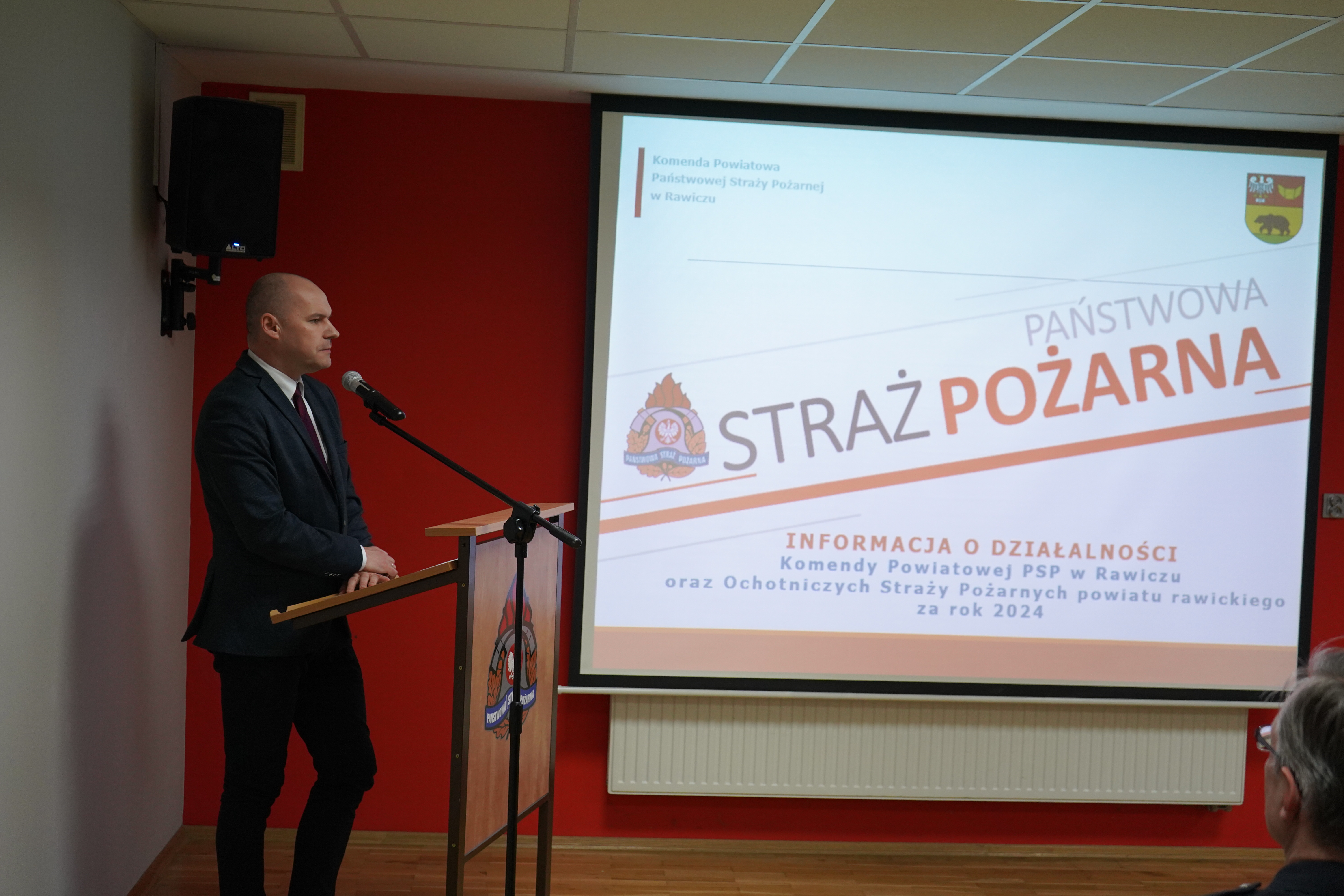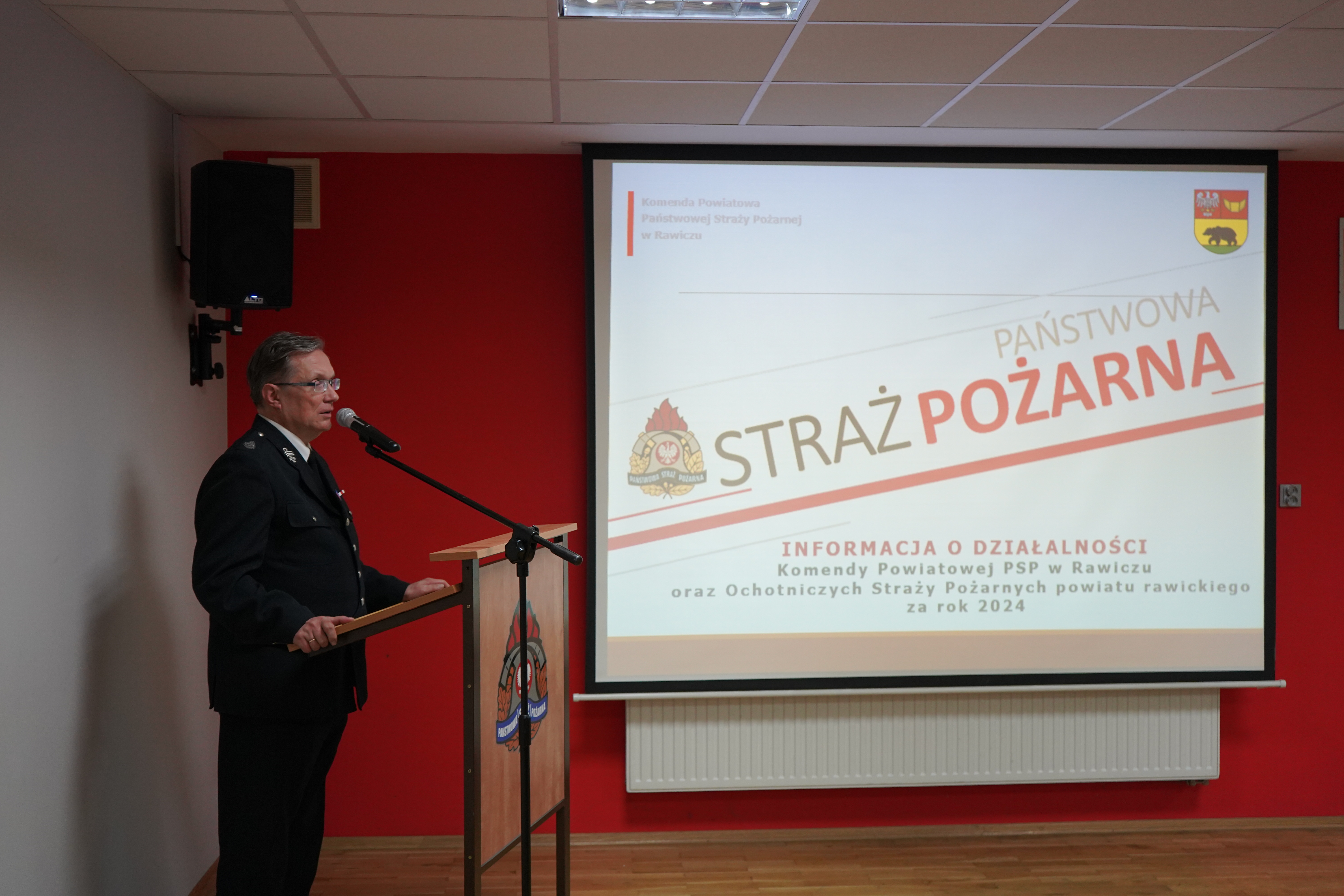 Sprawozdanie z zadań zrealizowanych w roku 2024 oraz aktualne plany komendy przedstawił bryg. Jakub Stryjak, komendant powiatowy PSP w Rawiczu.