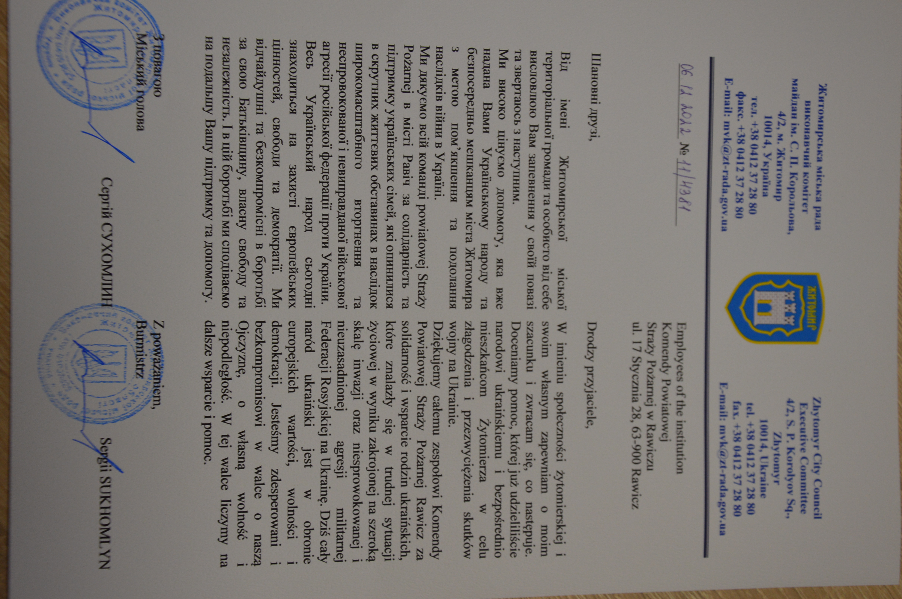 Specjalny list z podziękowaniami za solidarność i wsparcie rodzin ukraińskich, które w wyniku konfliktu zbrojnego znalazły się w bardzo trudnej sytuacji życiowej, przesłał do Komendy Powiatowej Państwowej Straży Pożarnej w Rawiczu Burmistrz Żytomierza Sergii Sukhomlyn.
