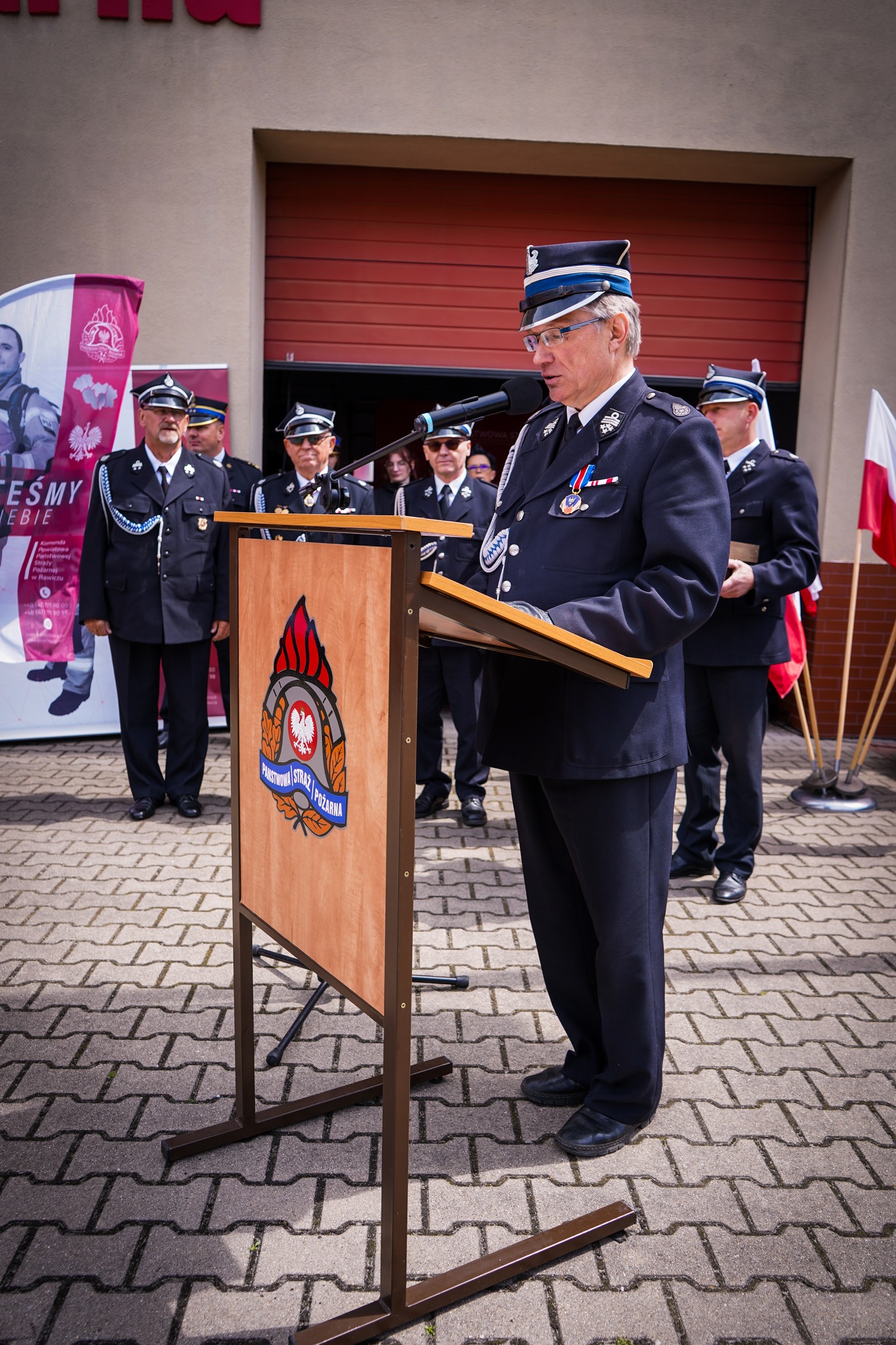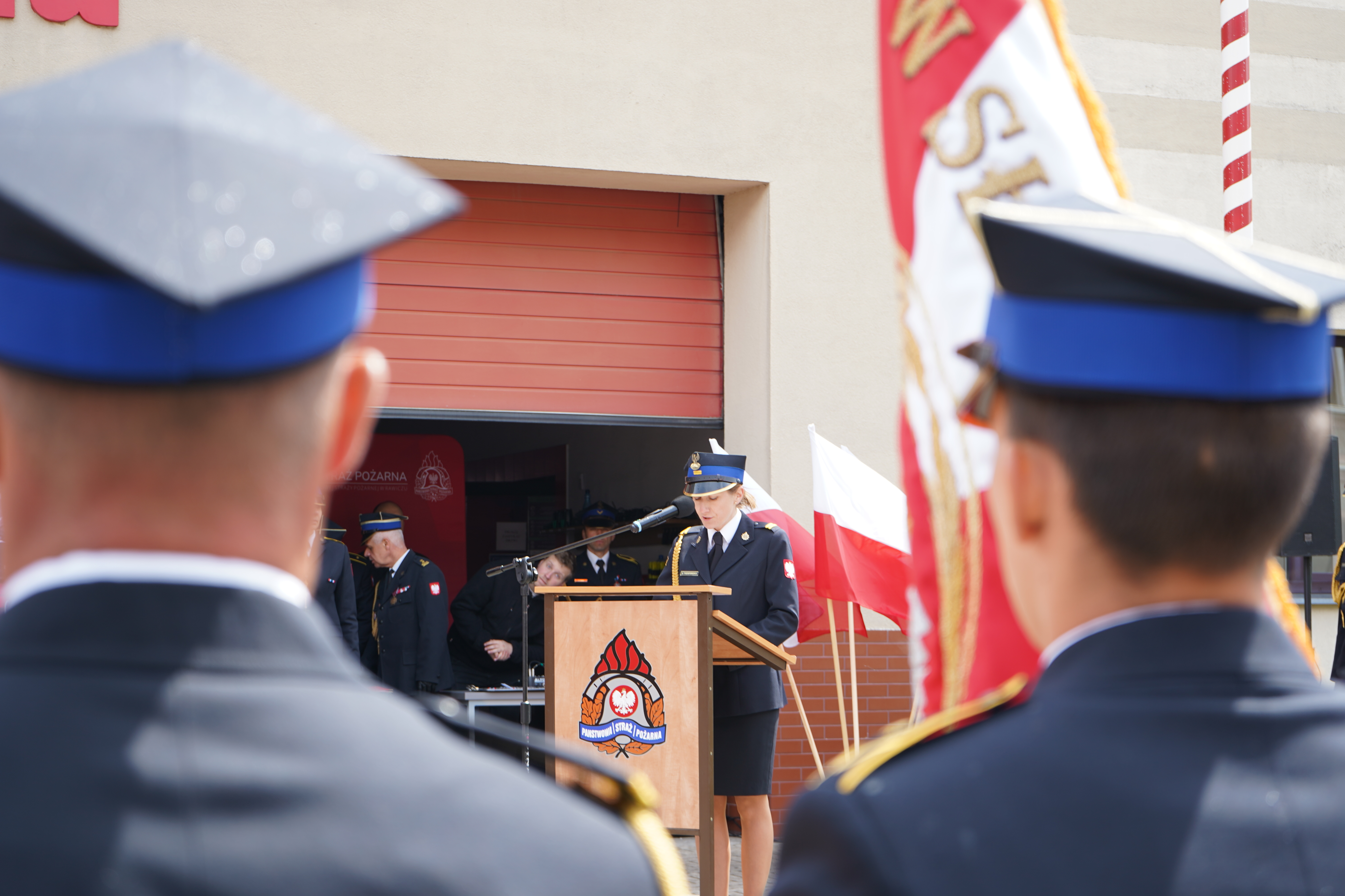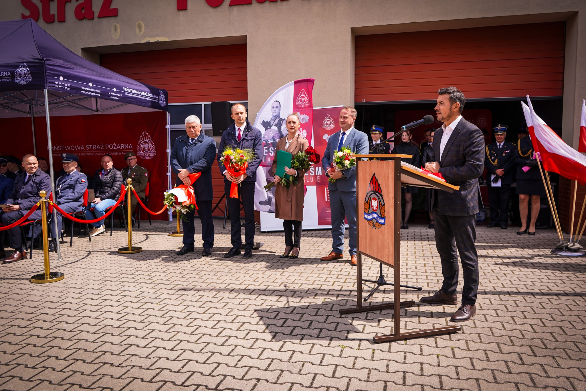 Następnie poczet flagowy w składzie st. sekc. Michał Stećko, sekc. Krystian Kosiuba i st. sekc. Jakub Klima, przy dźwiękach Mazurka Dąbrowskiego dokonał podniesienia flagi państwowej na maszt, po czym okolicznościowe przemówienie bryg. Jakub Stryjak, komendant powiatowy PSP w Rawiczu.