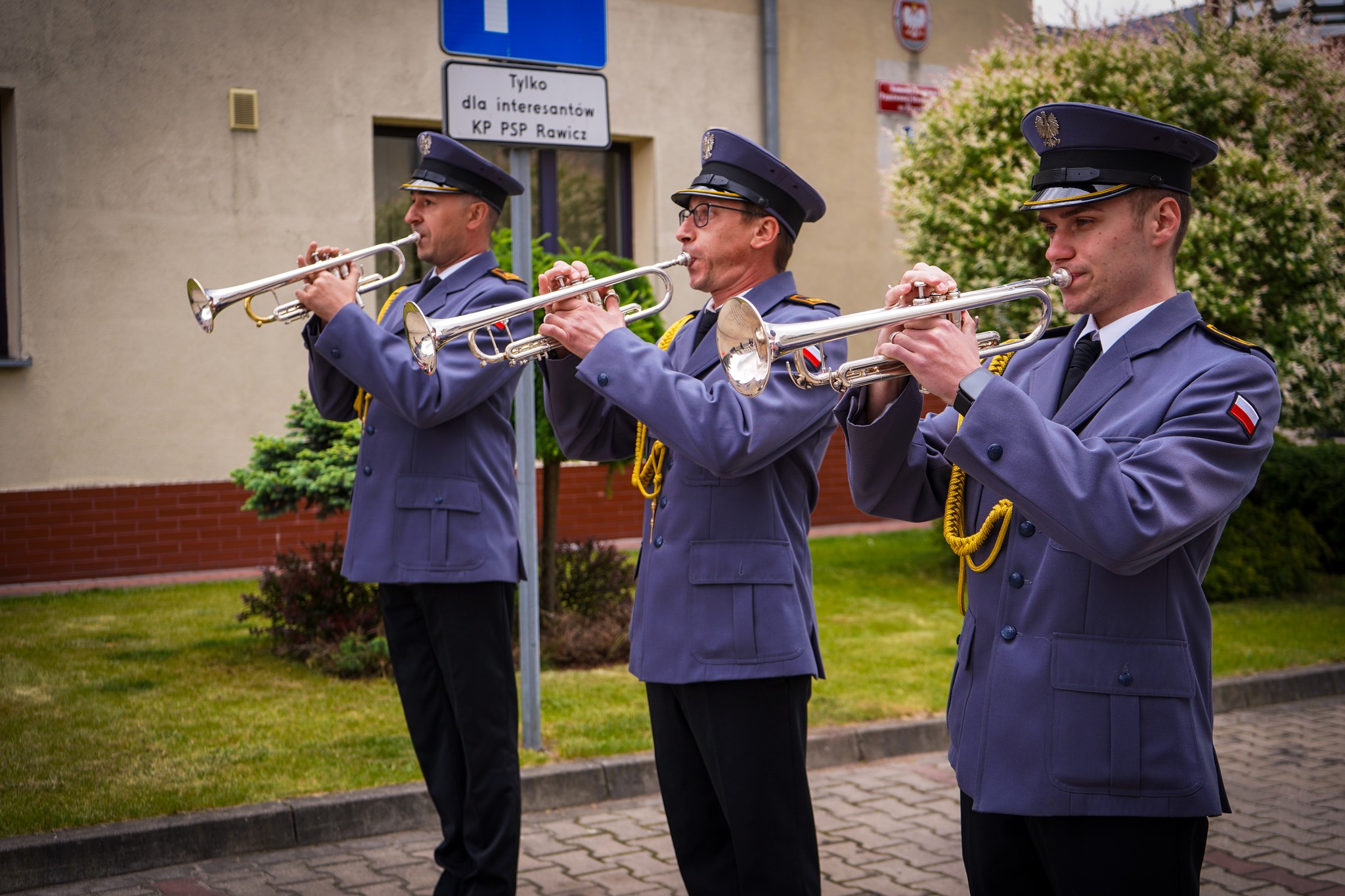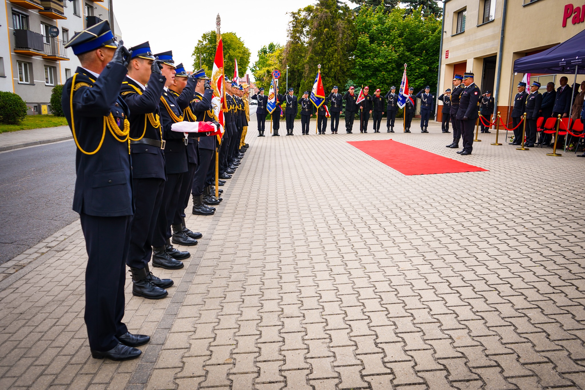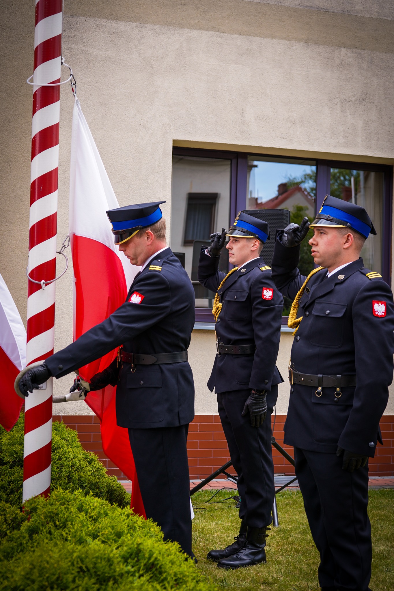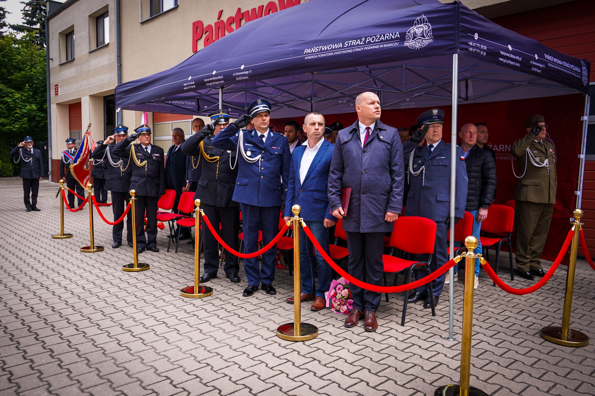 Następnie poczet flagowy w składzie st. sekc. Michał Stećko, sekc. Krystian Kosiuba i st. sekc. Jakub Klima, przy dźwiękach Mazurka Dąbrowskiego dokonał podniesienia flagi państwowej na maszt, po czym okolicznościowe przemówienie bryg. Jakub Stryjak, komendant powiatowy PSP w Rawiczu.
