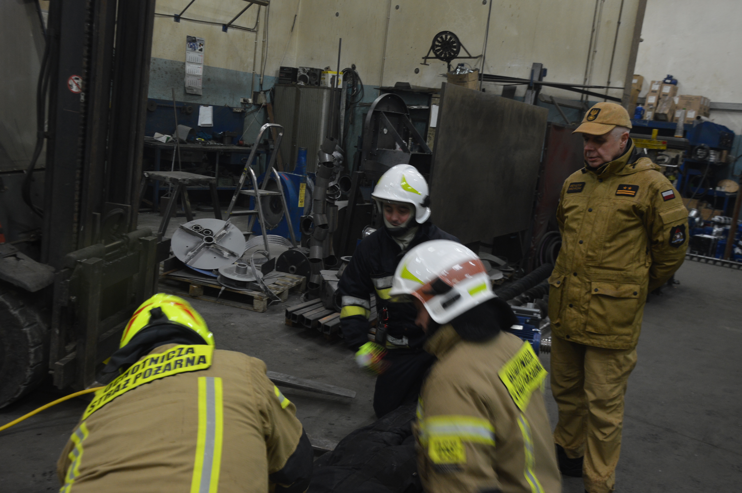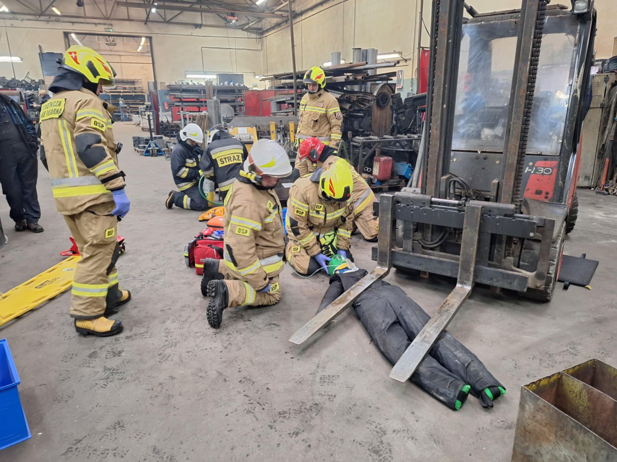 W trakcie ewakuacji doszło do nieszczęśliwego wypadku. Jeden z pracowników został przygnieciony elementami wózka widłowego.