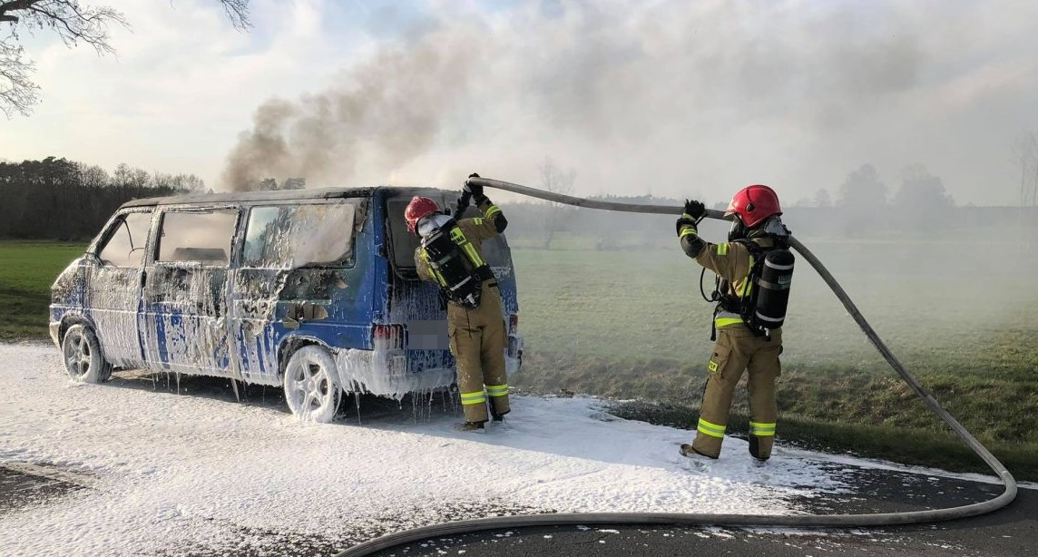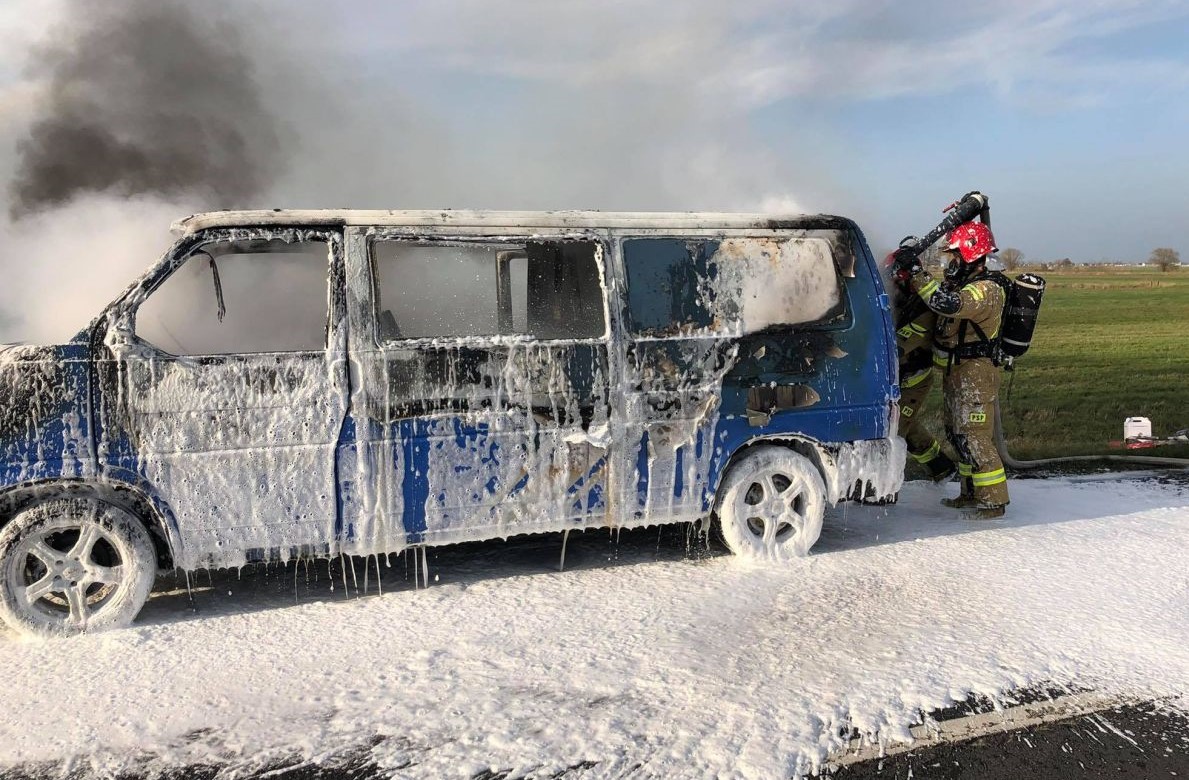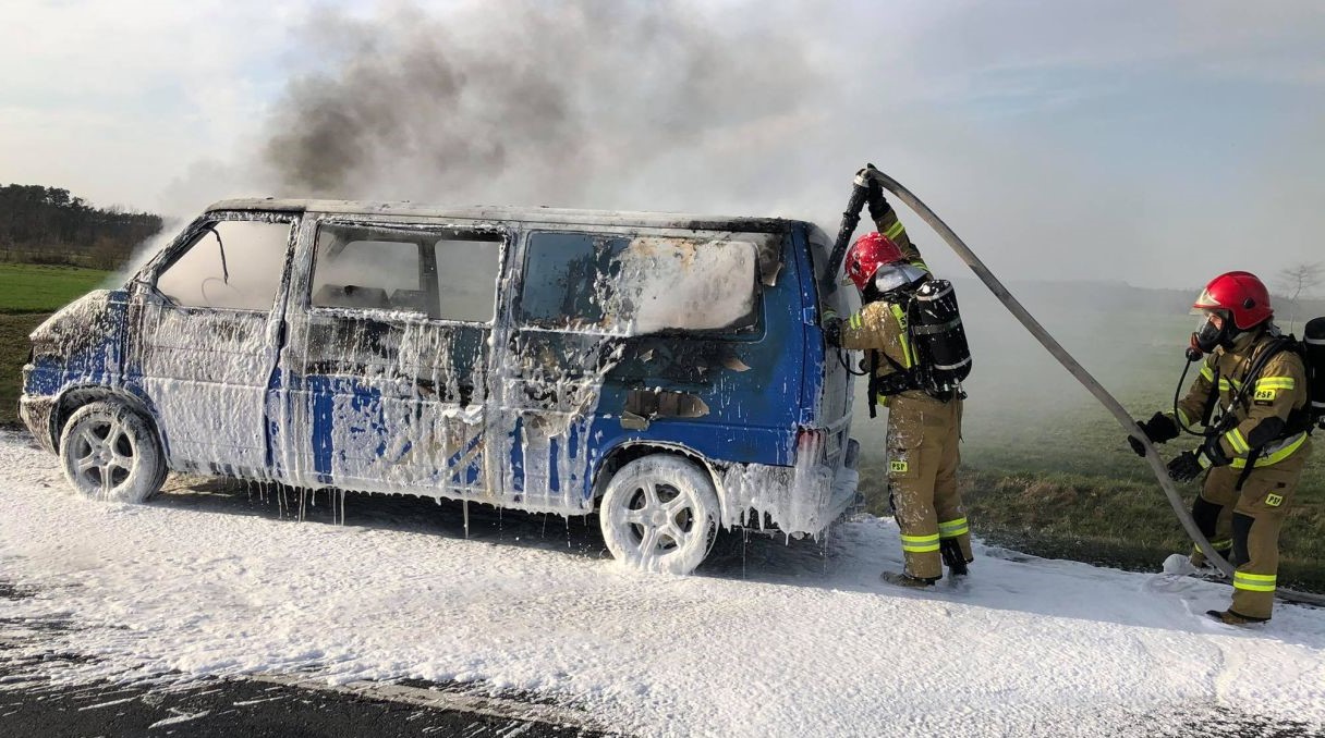 Volkswagen transporter, którego prowadził mieszkaniec województwa śląskiego, stanął w płomieniach około godz. 17.30 na drodze powiatowej pomiędzy Słupią Kapitulną a Szymanowem (gm. Rawicz). Kierujcemu nic się nie stało, natomiast auto niemalże spłonęło doszczętnie.