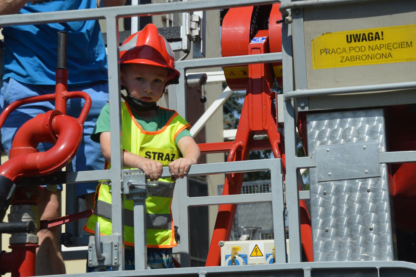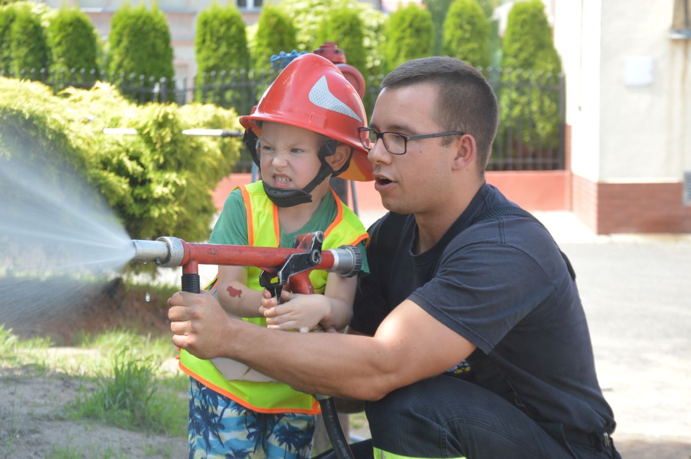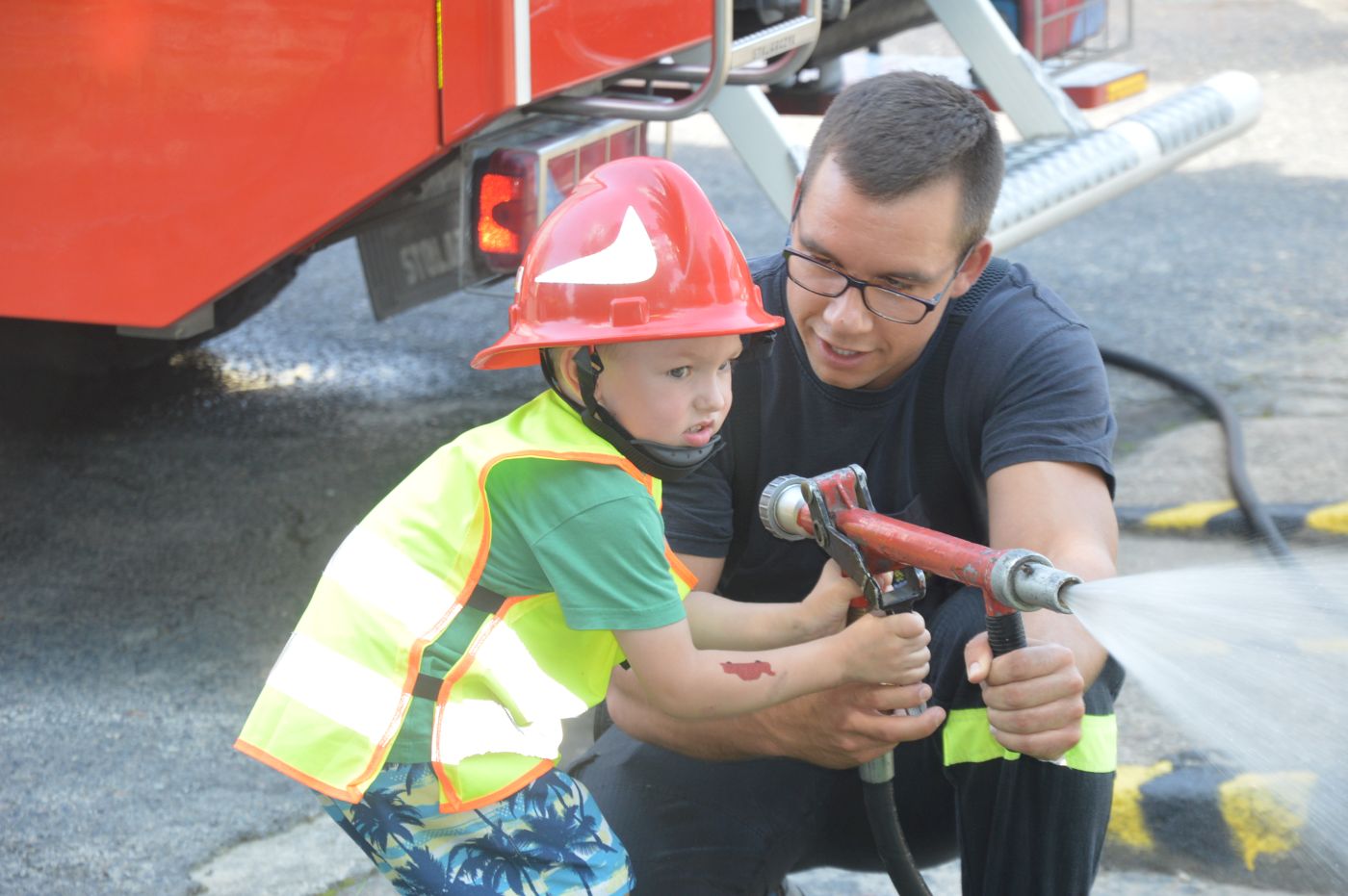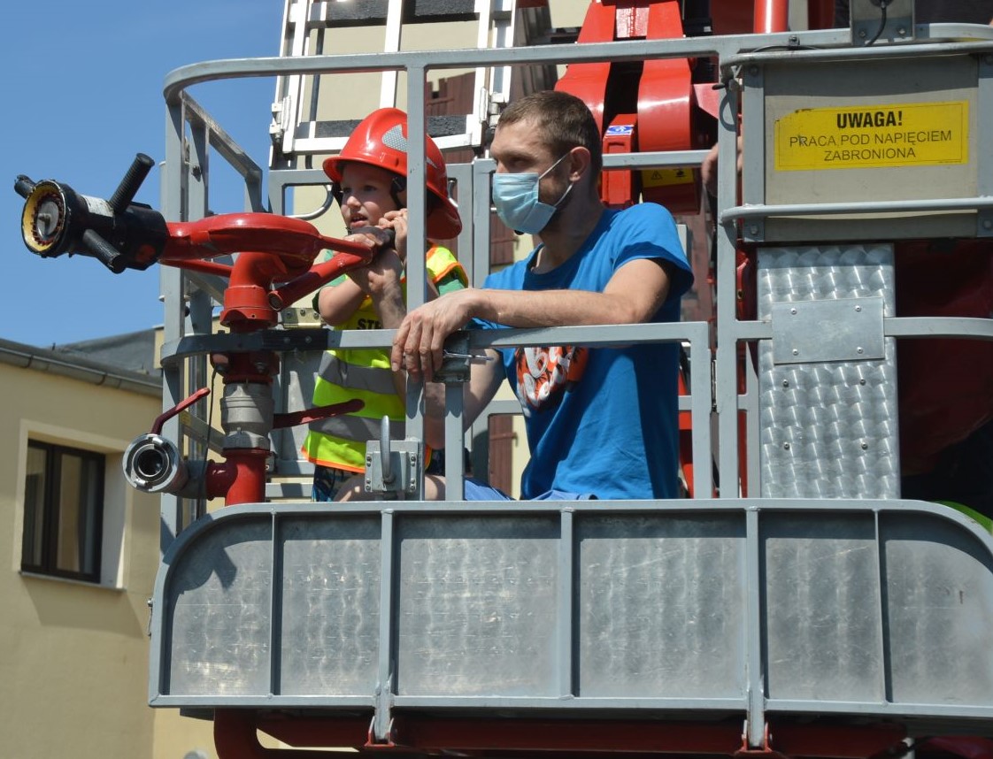Nie mogło oczywiście zabraknąć prezentacji wozów bojowych i sprzętu ratowniczego, szybkiego zjazdu strażaków do garażu za pomocą ześlizgu, jak również alarmowego przejazdu Bogumiła w charakterze dowódcy samochodu rozpoznawczo-ratowniczego i ... gaszenia "pożaru".