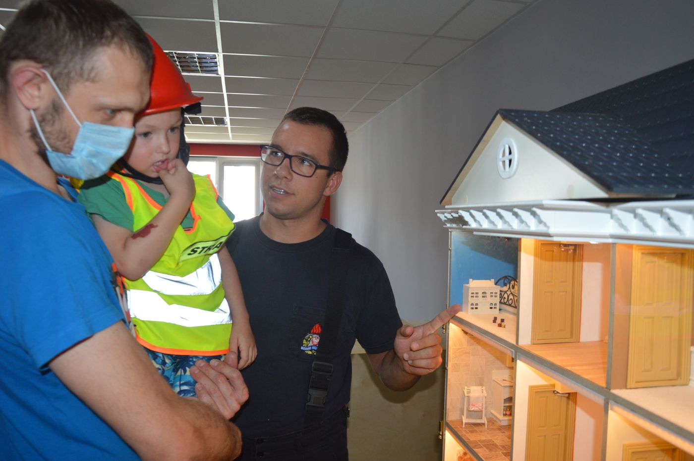Kolejnym etapem wizyty mieszkańców Leszna był udział w zajęciach edukacyjnych o tematyce związanej z bezpieczeństwem, podczas których strażacy wykorzystali mobilny symulator zagrożeń – model budynku mieszkalnego oraz moduł jezioro-las.