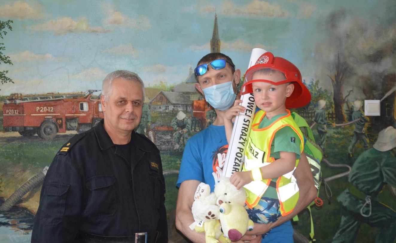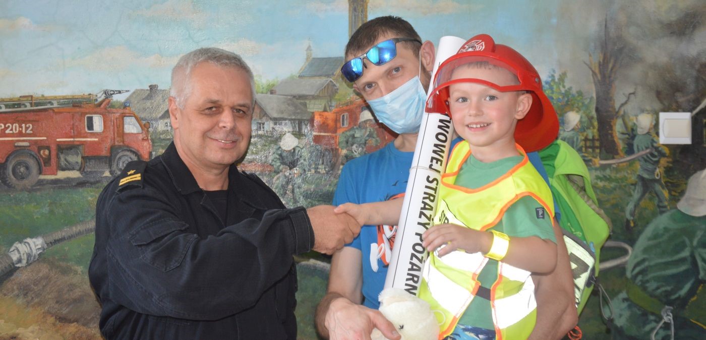 Na zakończenie pobytu w Rawiczu mały strażak został obdarowany maskotkami, kalendarzem strażackim oraz strażacką opaską odblaskową.