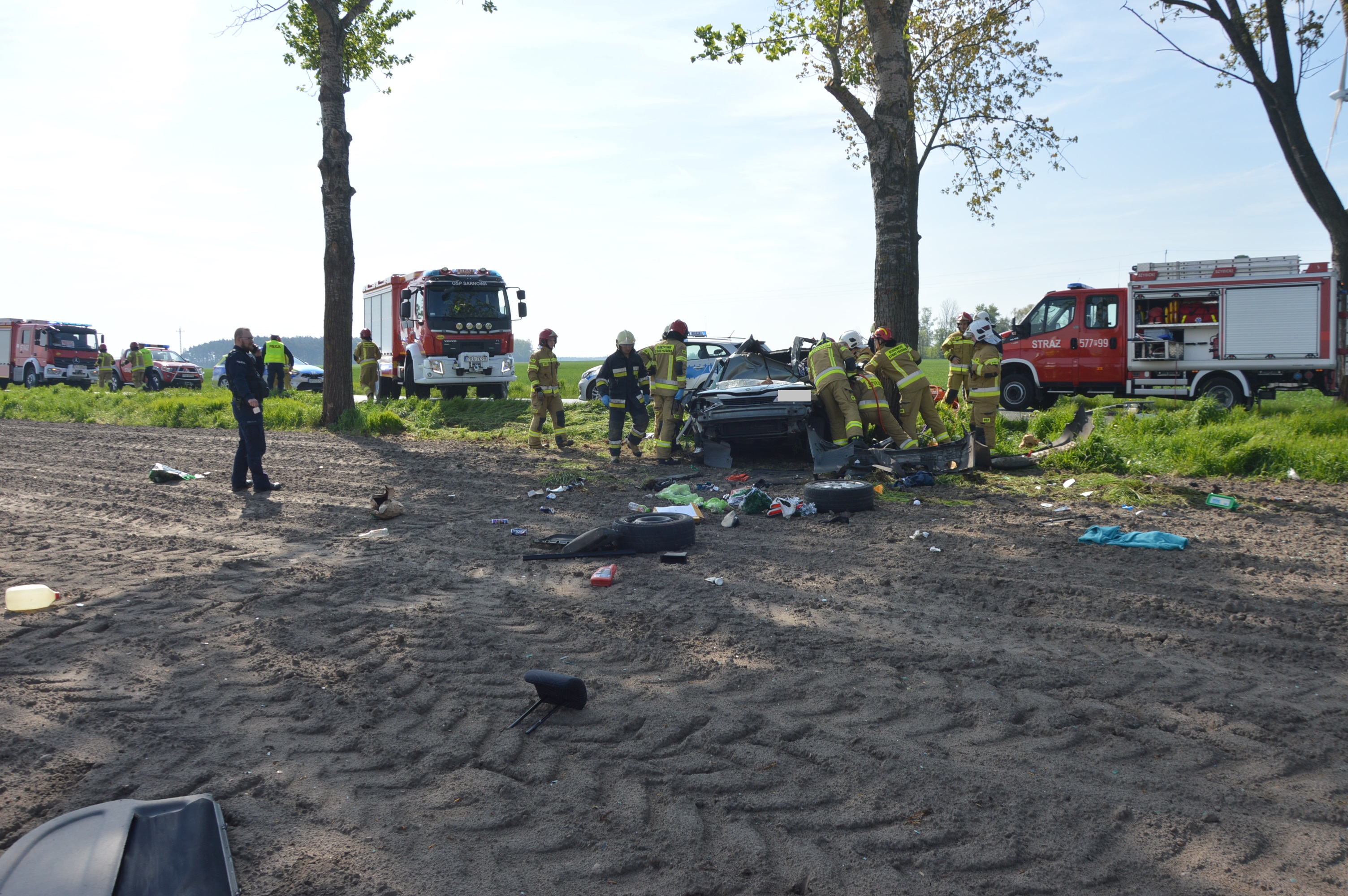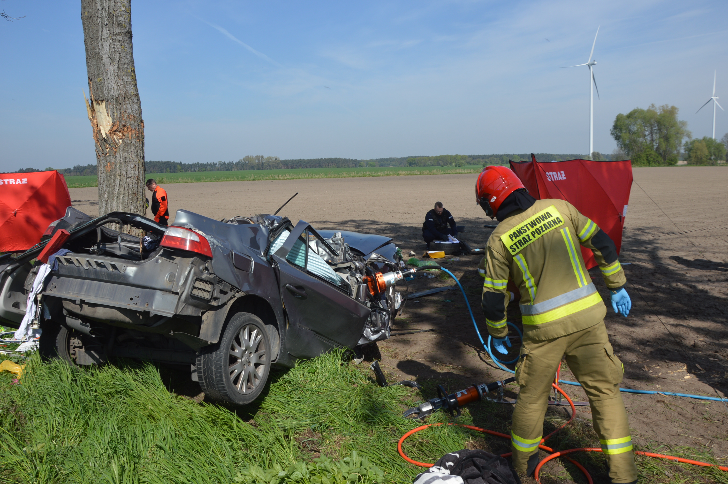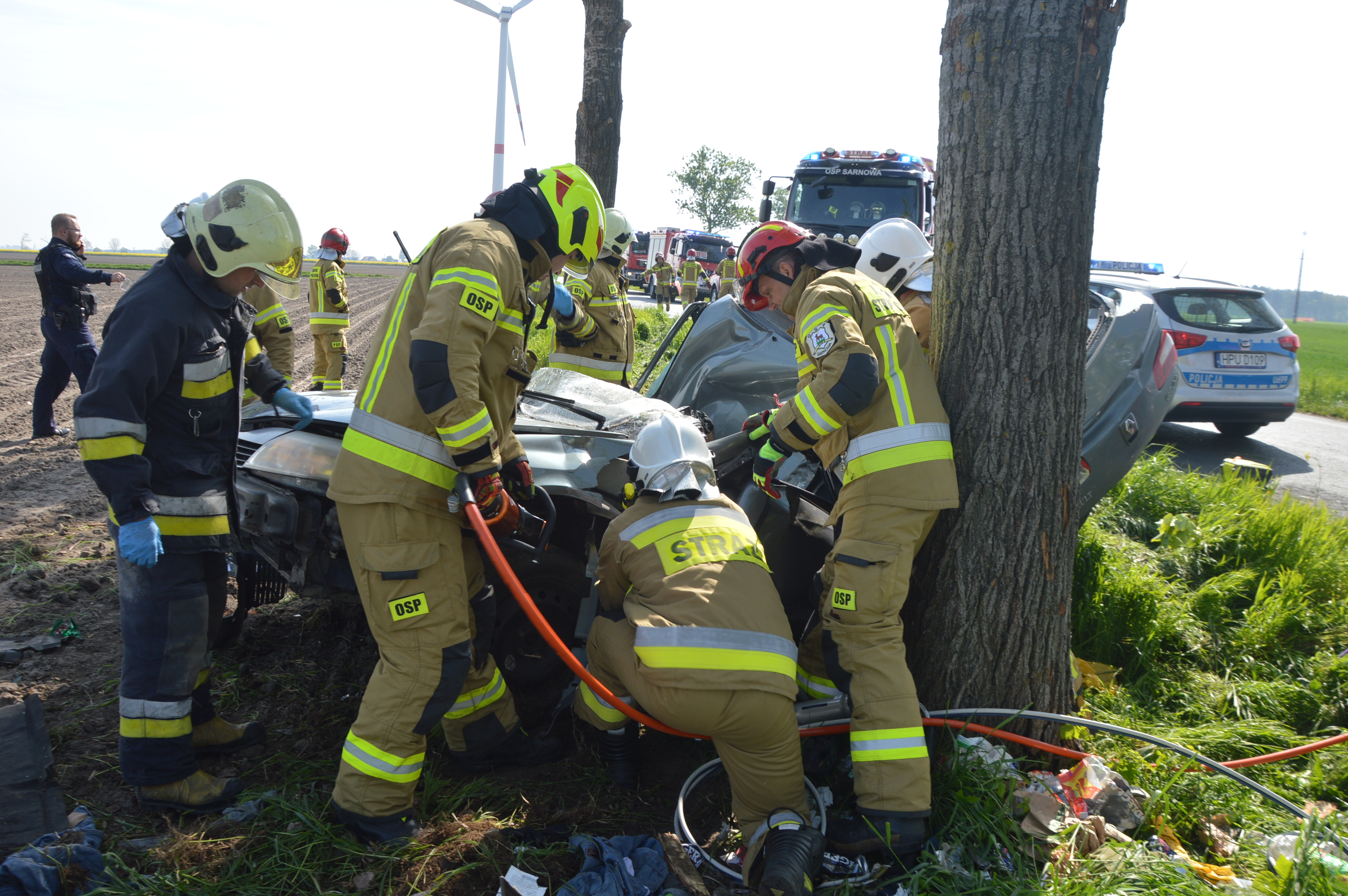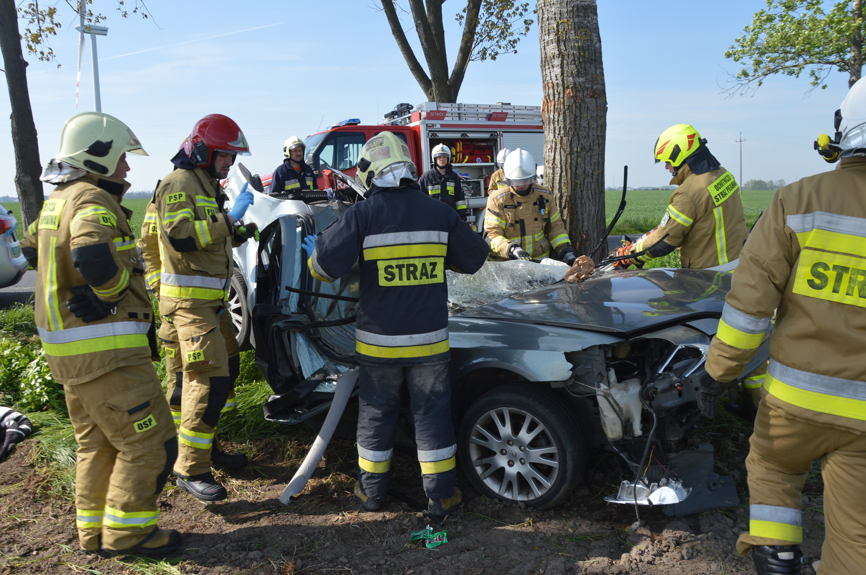 W wyniku uderzenia w przydrożne drzewo śmierć na miejscu poniósł młody mieszkaniec powiatu rawickiego. Aby wykonać do niego dostęp strażacy musieli użyć specjalnych nożyc i rozpieraczy hydraulicznych.