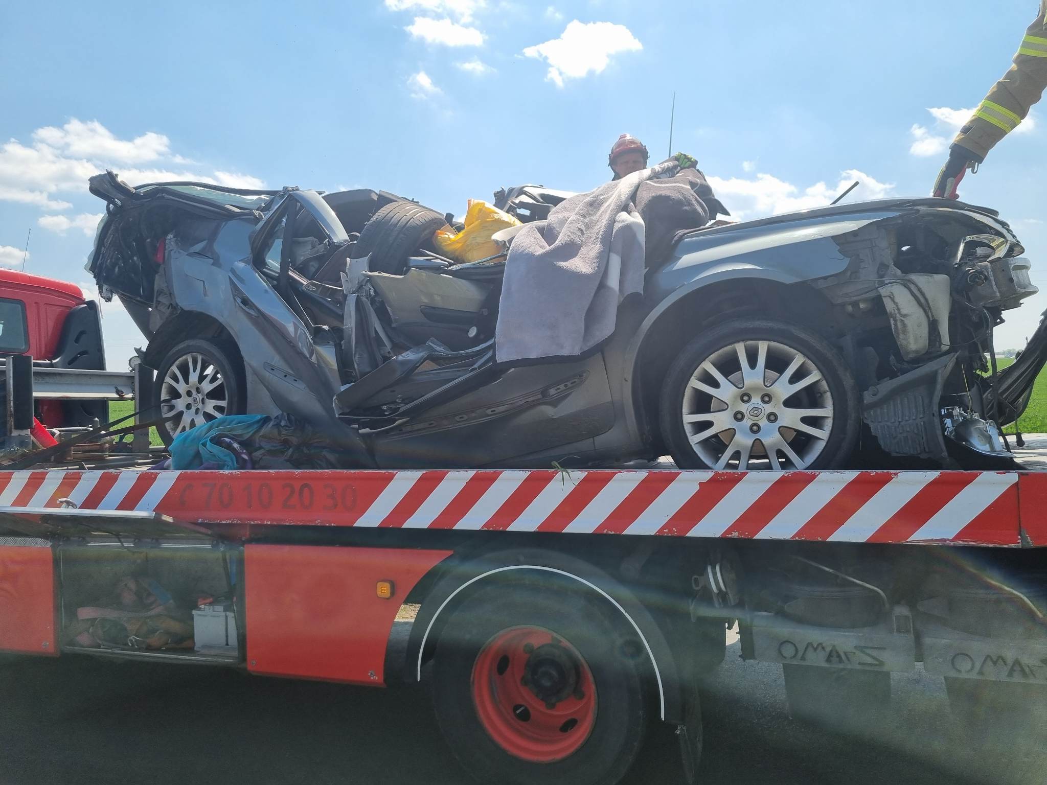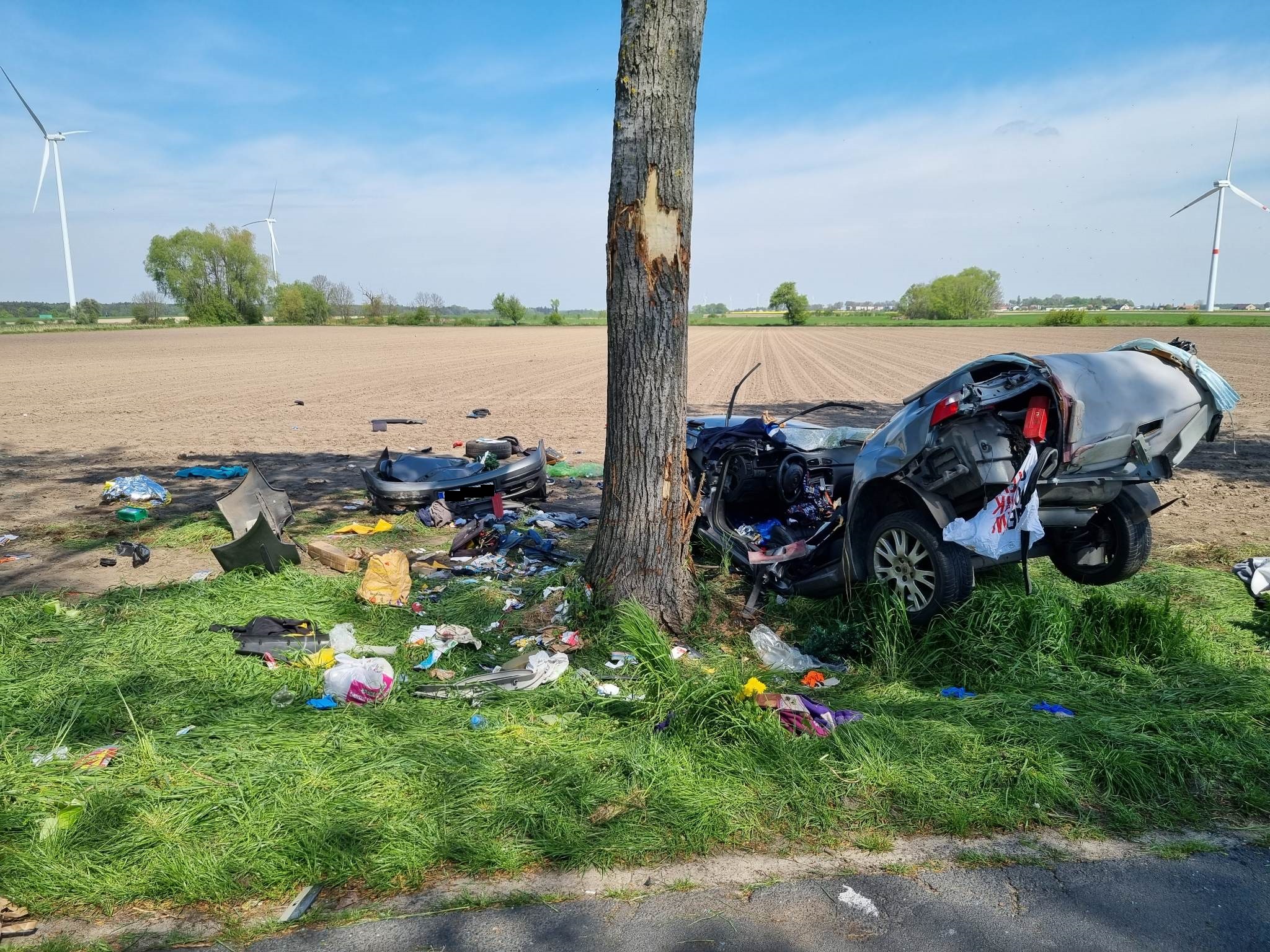 Po ich zakończeniu, strażacy pomogli załadować wrak na pojazd pomocy drogowej oraz usunęli z pobliskiego pola porozrzucane elementy auta i przewożonych w nim przedmiotów.