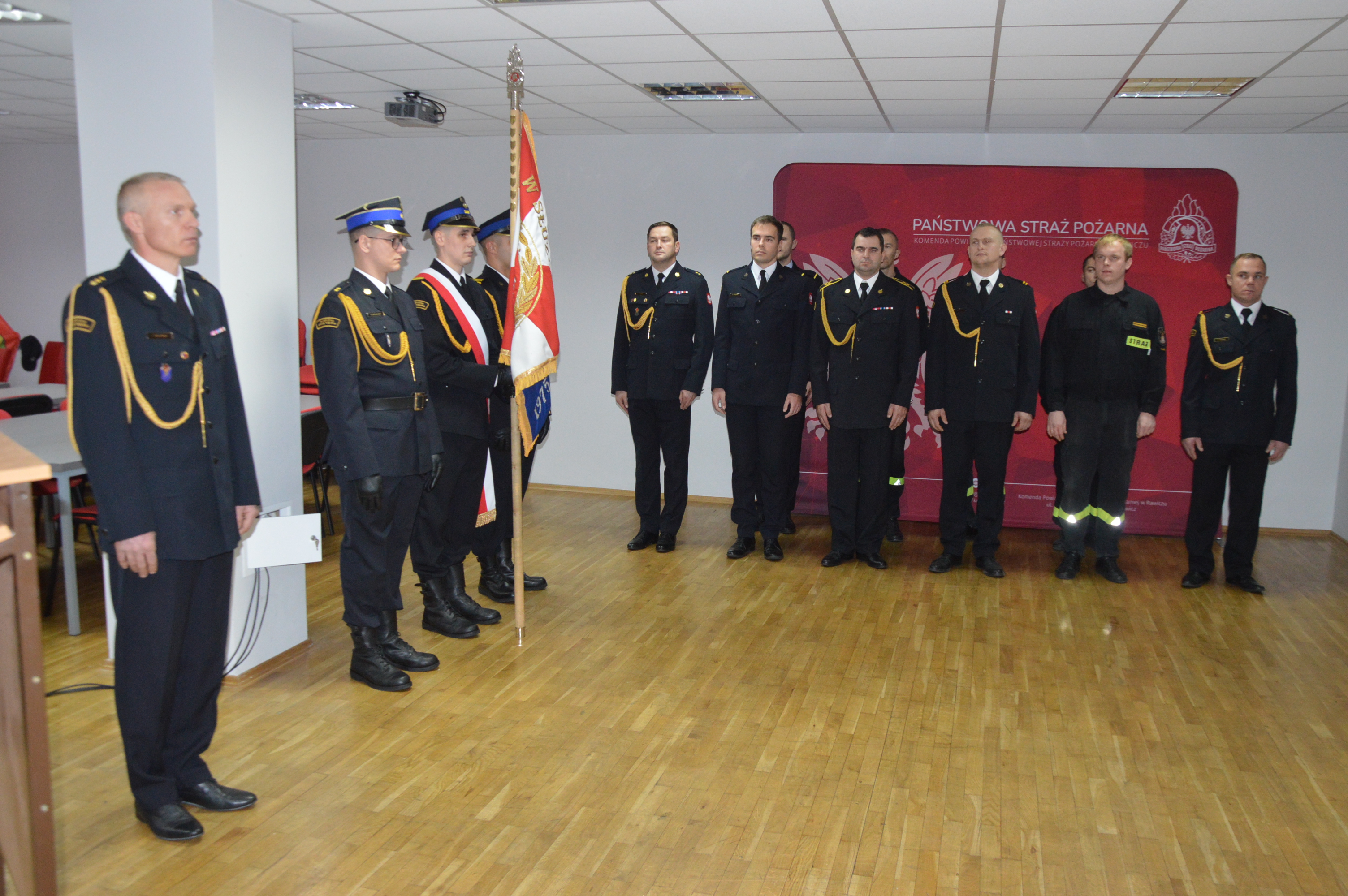 Zbiórka rozpoczęła się od złożenia meldunku Komendantowi Powiatowemu PSP w Rawiczu mł. bryg. Marcinowi Wysokińskiemu przez dowódcę uroczystości, kpt. Leszka Kuczyńskiego. Następnie wprowadzono sztandar i odegrany został został hymn państwowy.