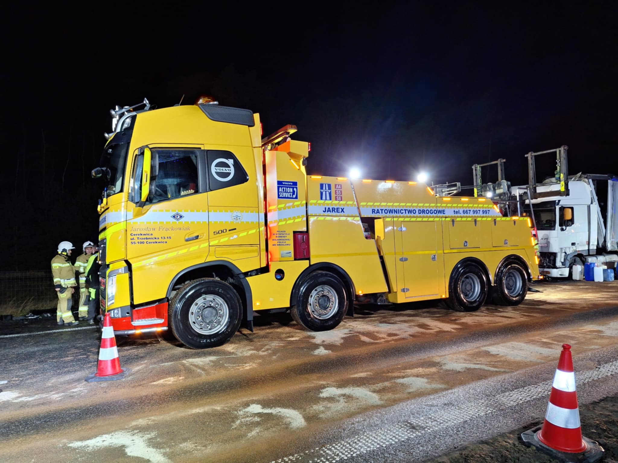 Informacja o zderzeniu dwóch „ciężarówek” na 95 km ekspresowej „piątki” w kierunku Wrocławia, z których jedna leży w rowie, a druga stoi w poprzek jezdni blokując pas ruchu, wpłynęła do stanowiska kierowania komendanta powiatowego PSP w Rawiczu w czwartek, 9 stycznia 2025 r. o godz. 19.43.