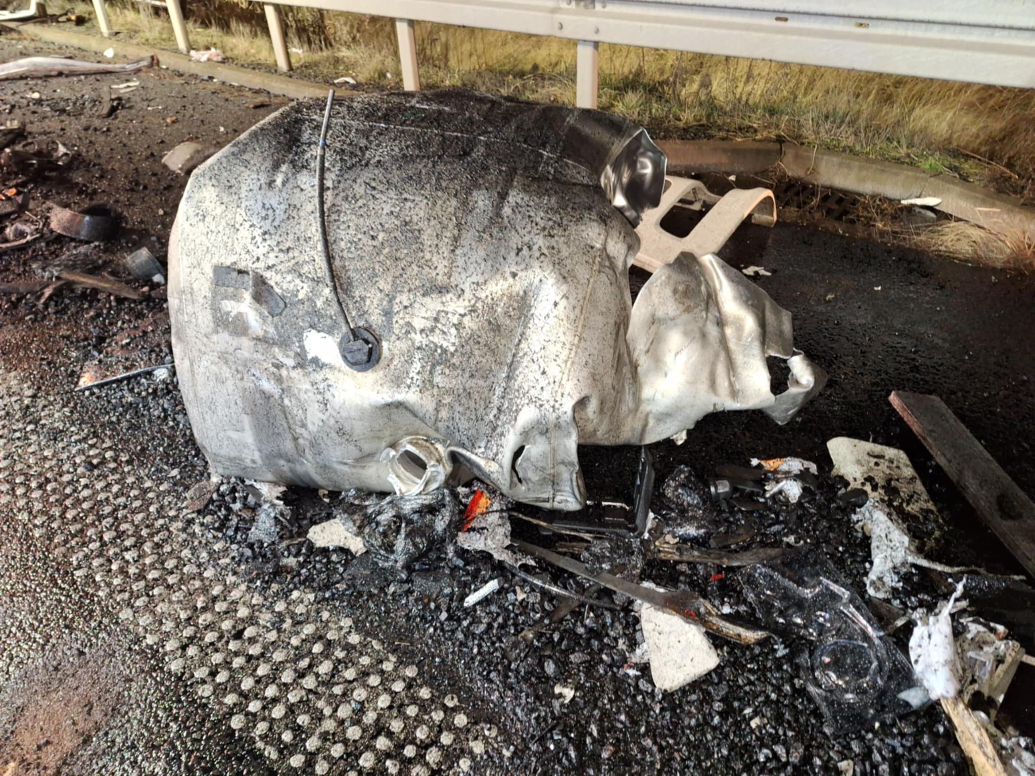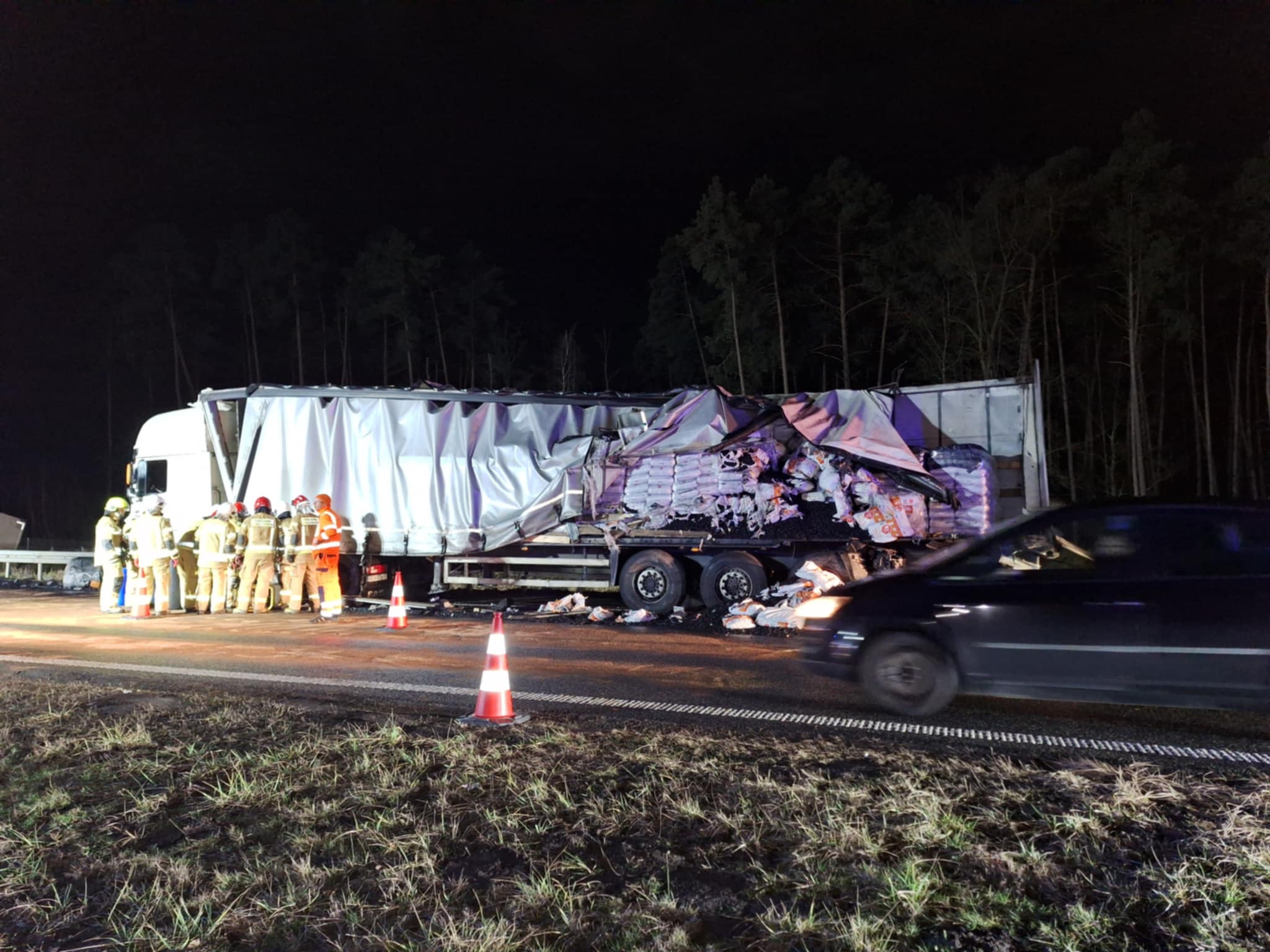 Po dotarciu ustalili, że jeden z uszkodzonych zestawów, którego naczepa jest załadowana ekogroszkiem, stoi na pasie awaryjnym, natomiast drugi (przewożący czekoladę) przebił bariery ochronne, znajduje się w rowie, a część naczepy blokuje jeden pas ruchu. Na jezdni rozlane jest paliwo i płyny eksploatacyjne, a także są porozrzucane elementy uszkodzonych pojazdów i rozsypana część przewożonego opału. Kierujący nie zgłaszają żadnych dolegliwości.