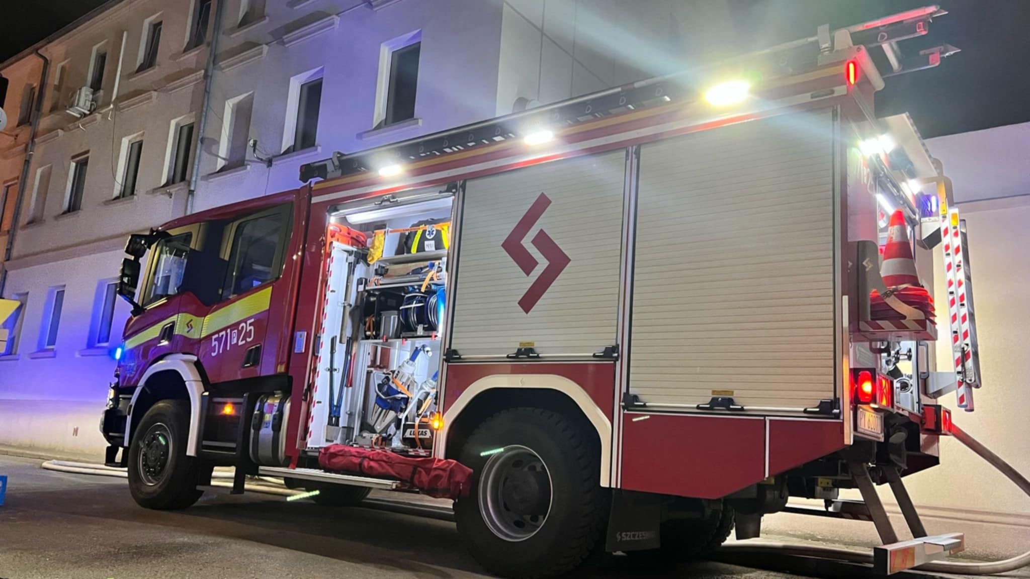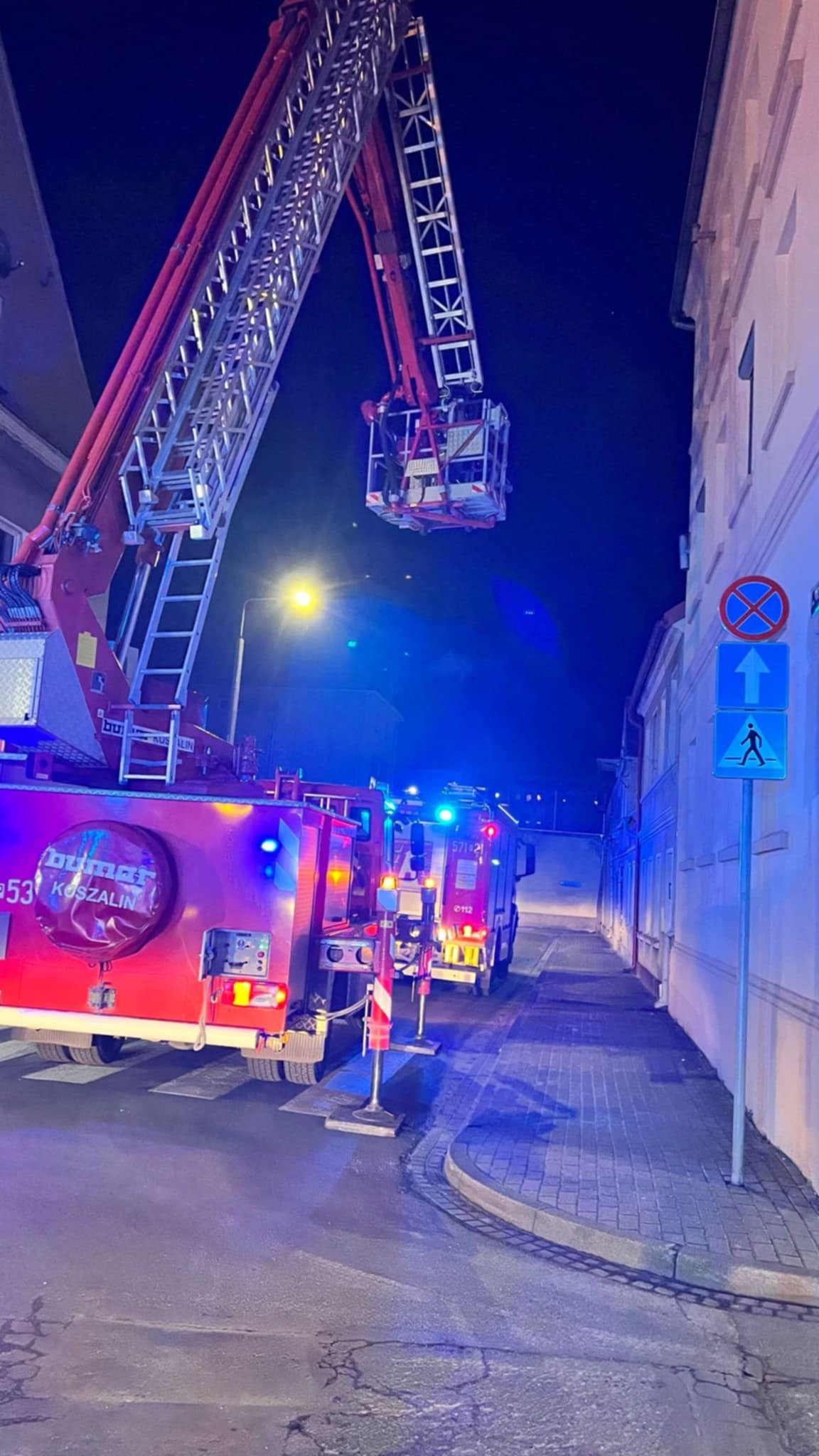 Użyto również samochodu specjalnego z podnośnikiem hydraulicznym w celu wykluczenia rozprzestrzeniania się ognia po dachu kamienicy.