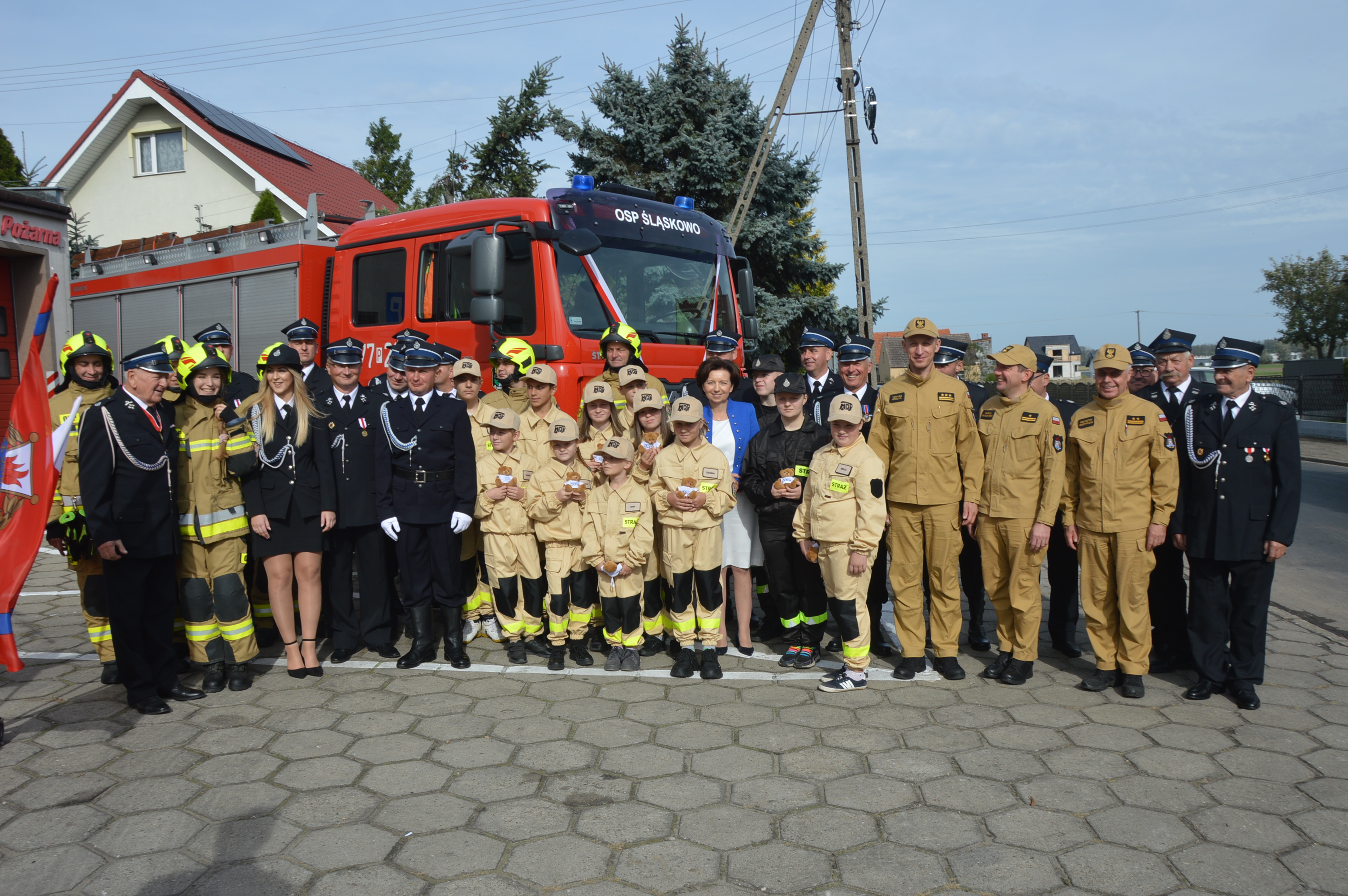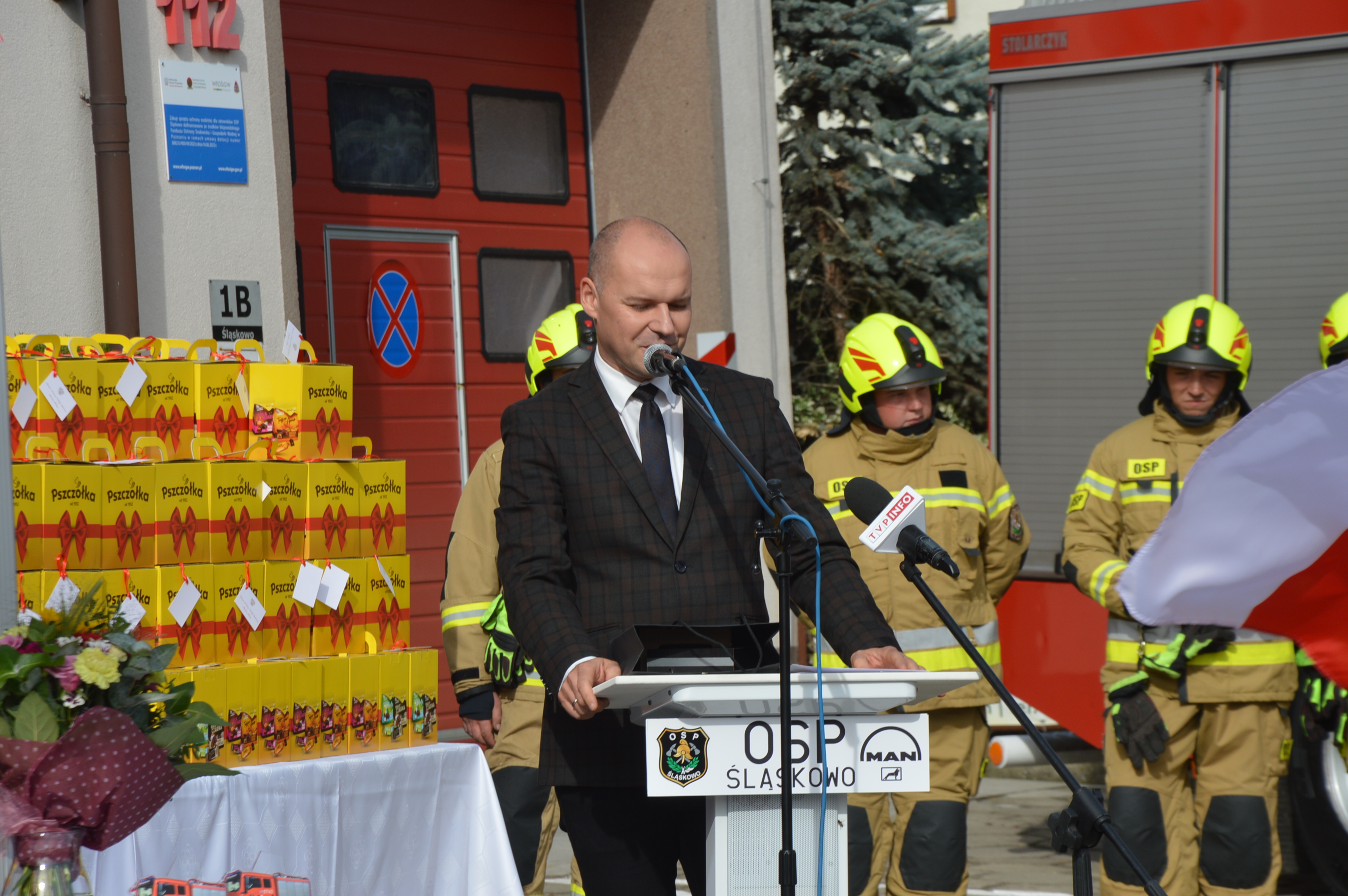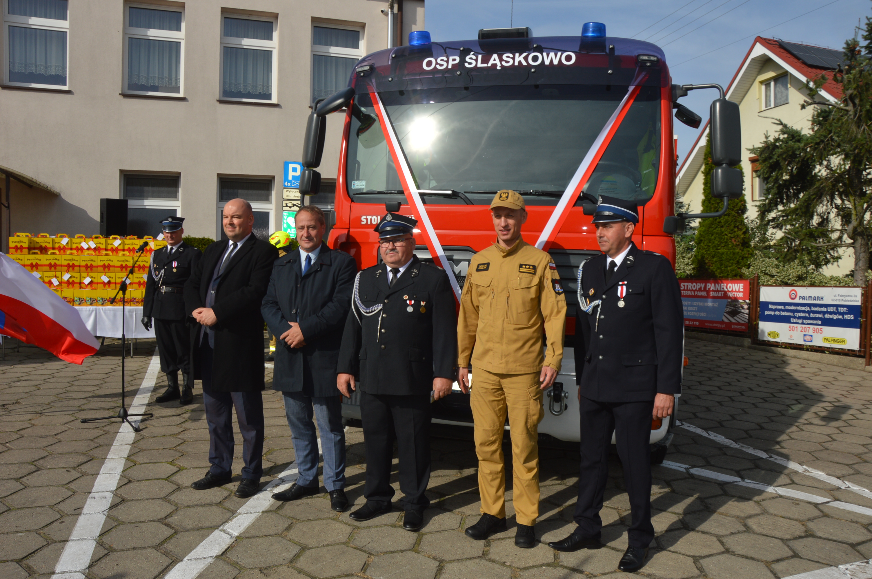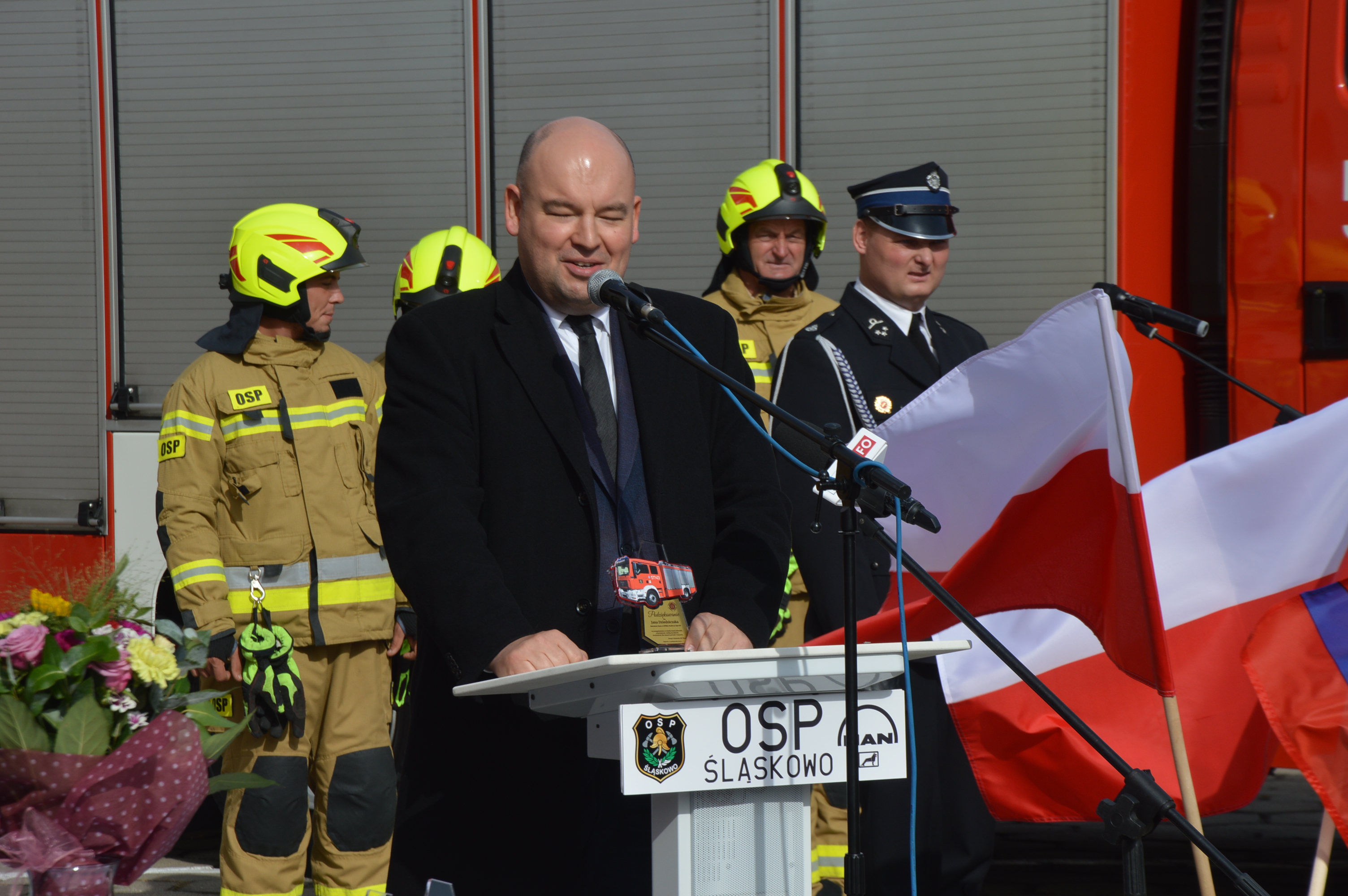 Minister Jan Dziedziczak, Zastępca Wielkopolskiego Komendanta Wojewódzkiego PSP st.bryg. Tomasz Grelak oraz Burmistrz Miasta i Gminy Jutrosin Romuald Krzyżosiak, dokonali symbolicznego przekazania Ochotniczej Straży Pożarnej w Śląskowie ciężkiego pojazdu ratowniczo-gaśniczego, pochodzącego z zasobów Państwowej Straży Pożarnej.