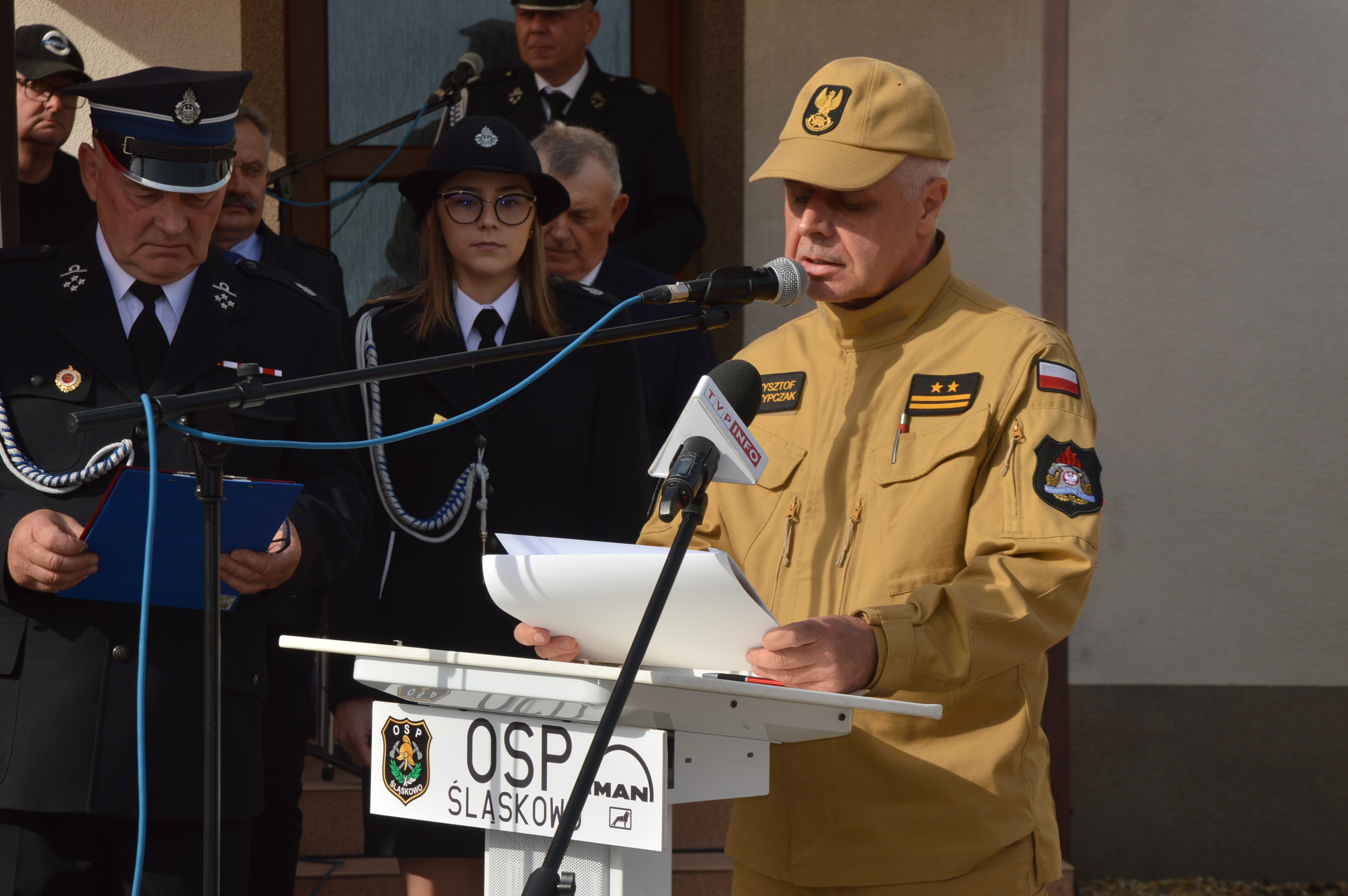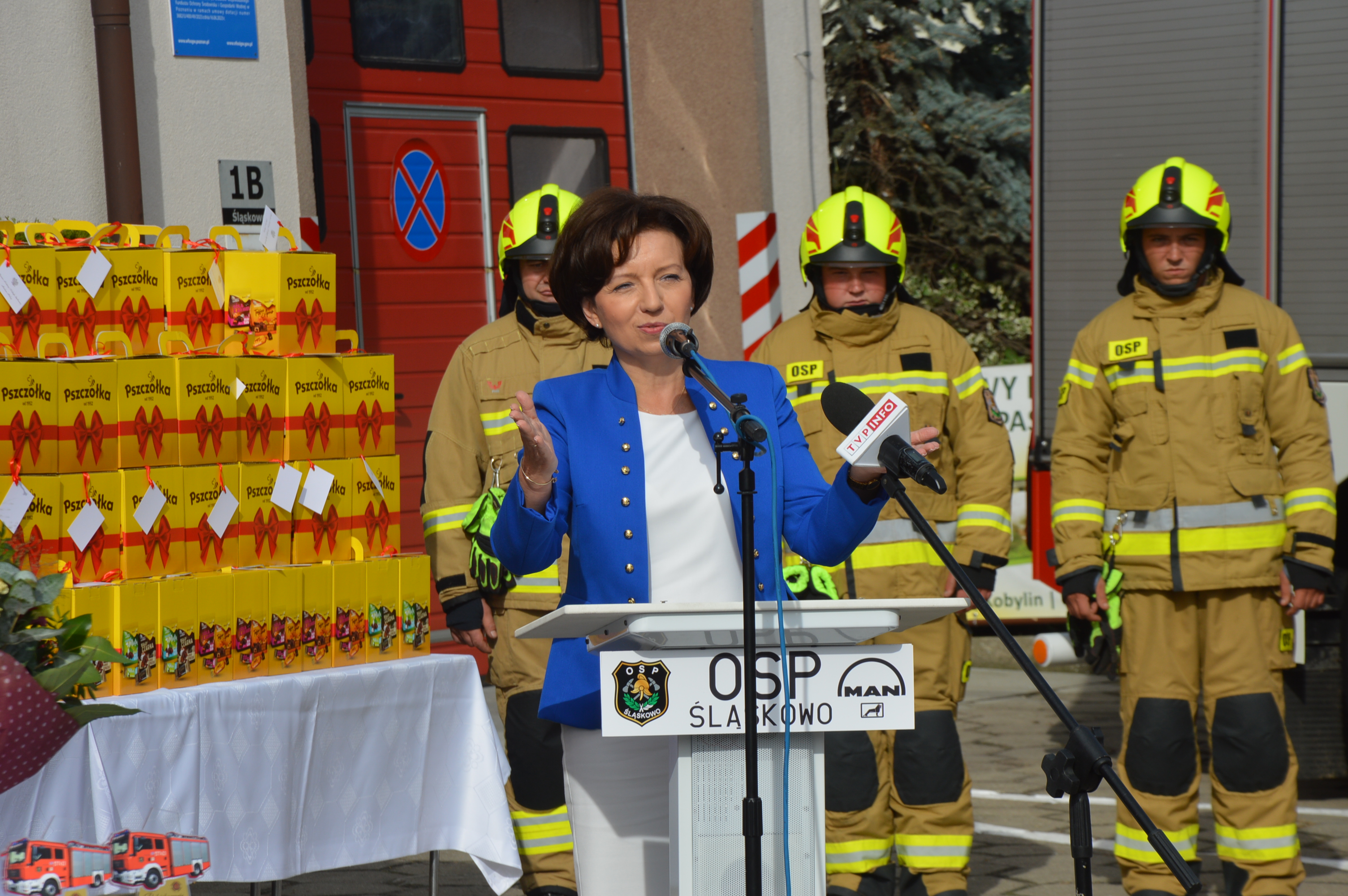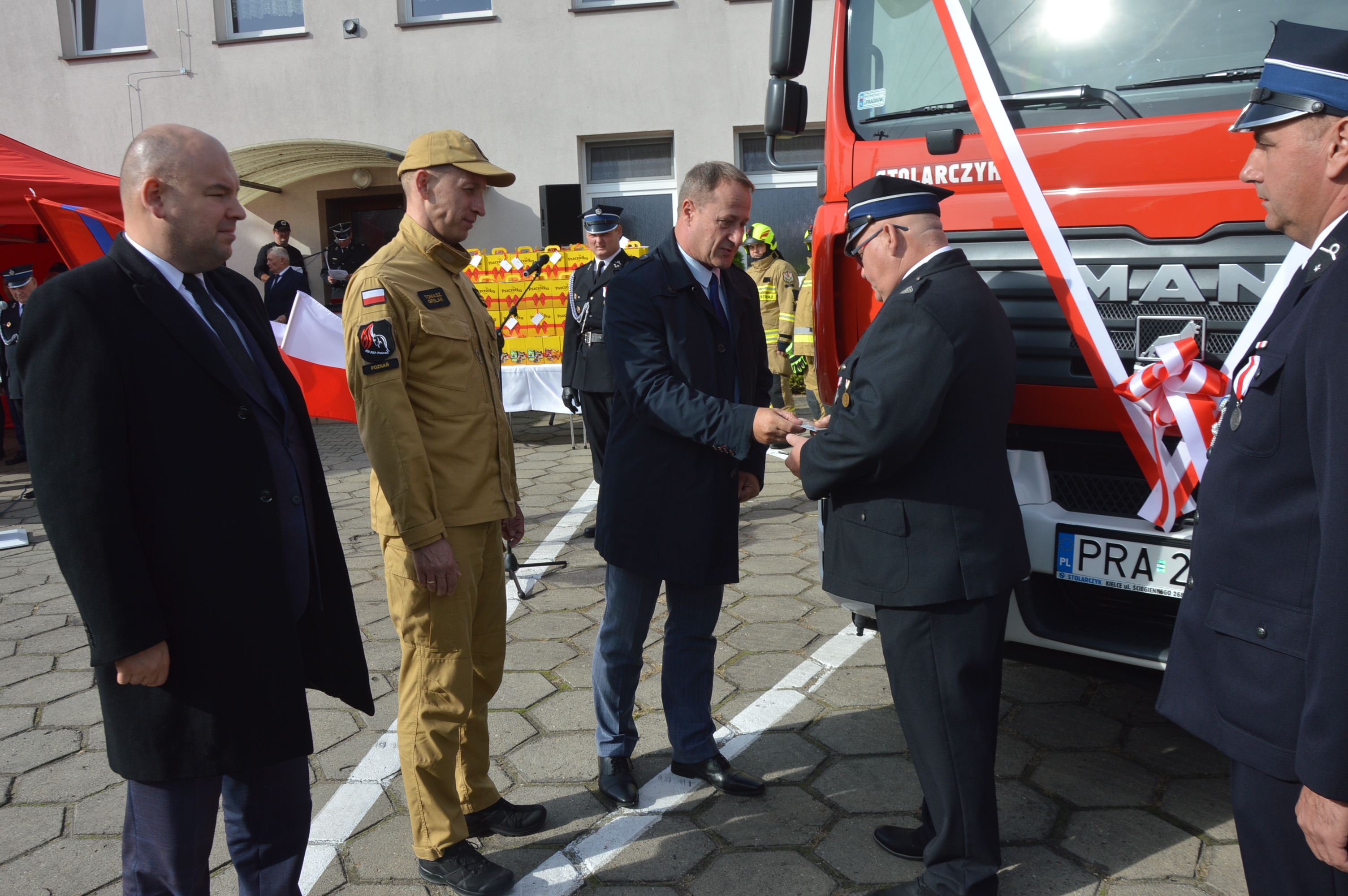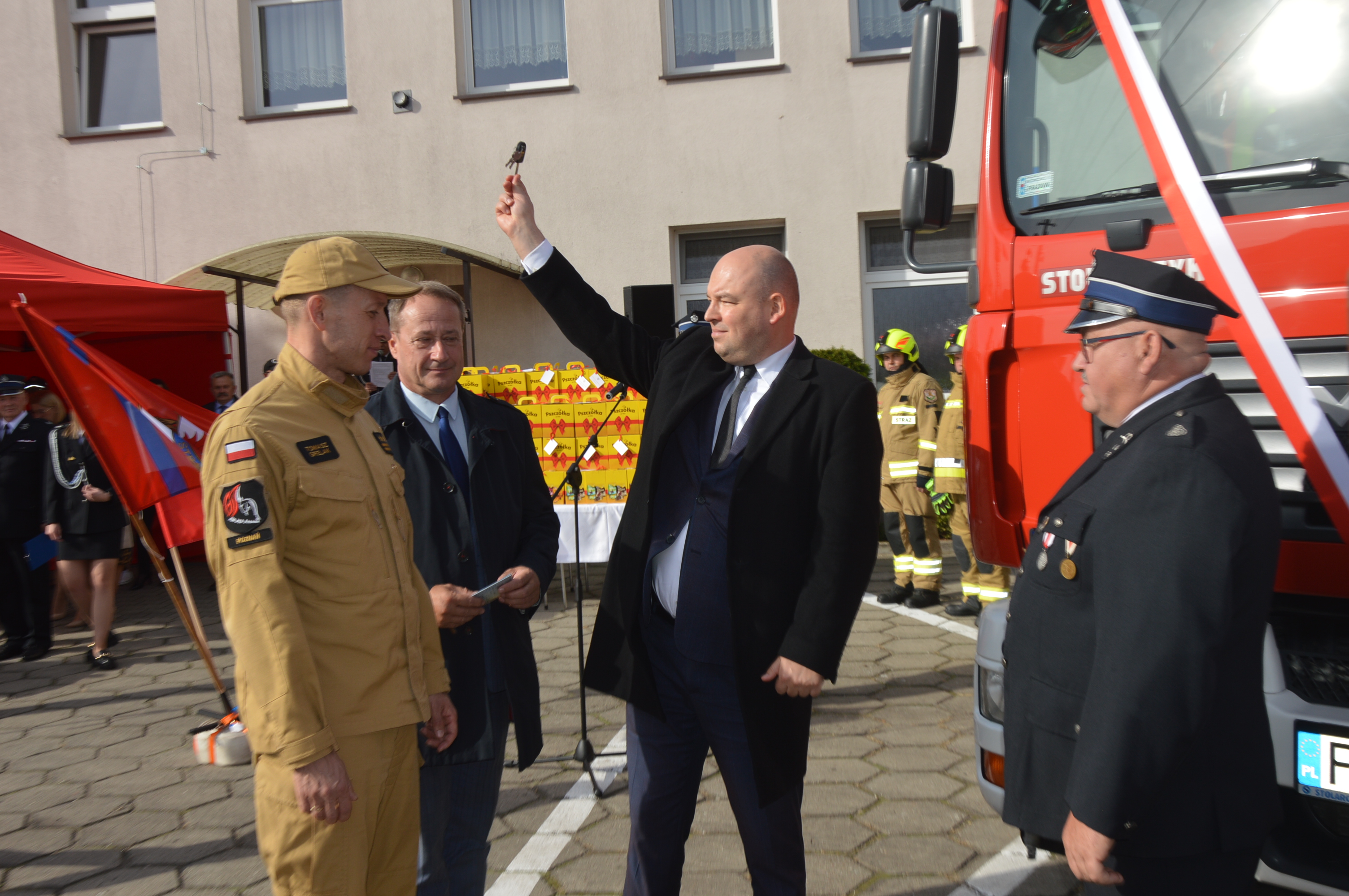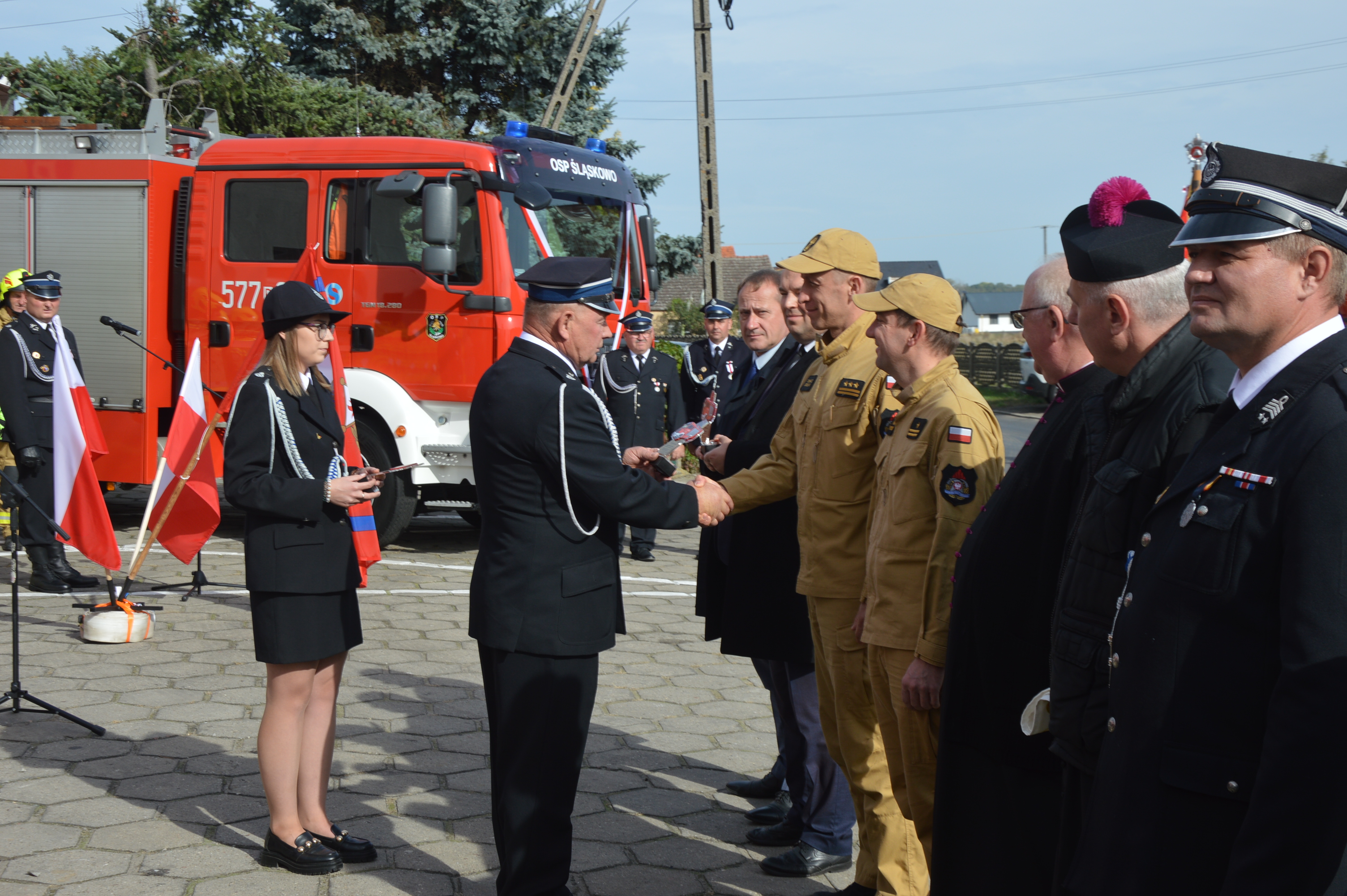 Minister Jan Dziedziczak, Zastępca Wielkopolskiego Komendanta Wojewódzkiego PSP st.bryg. Tomasz Grelak oraz Burmistrz Miasta i Gminy Jutrosin Romuald Krzyżosiak, dokonali symbolicznego przekazania Ochotniczej Straży Pożarnej w Śląskowie ciężkiego pojazdu ratowniczo-gaśniczego, pochodzącego z zasobów Państwowej Straży Pożarnej.
