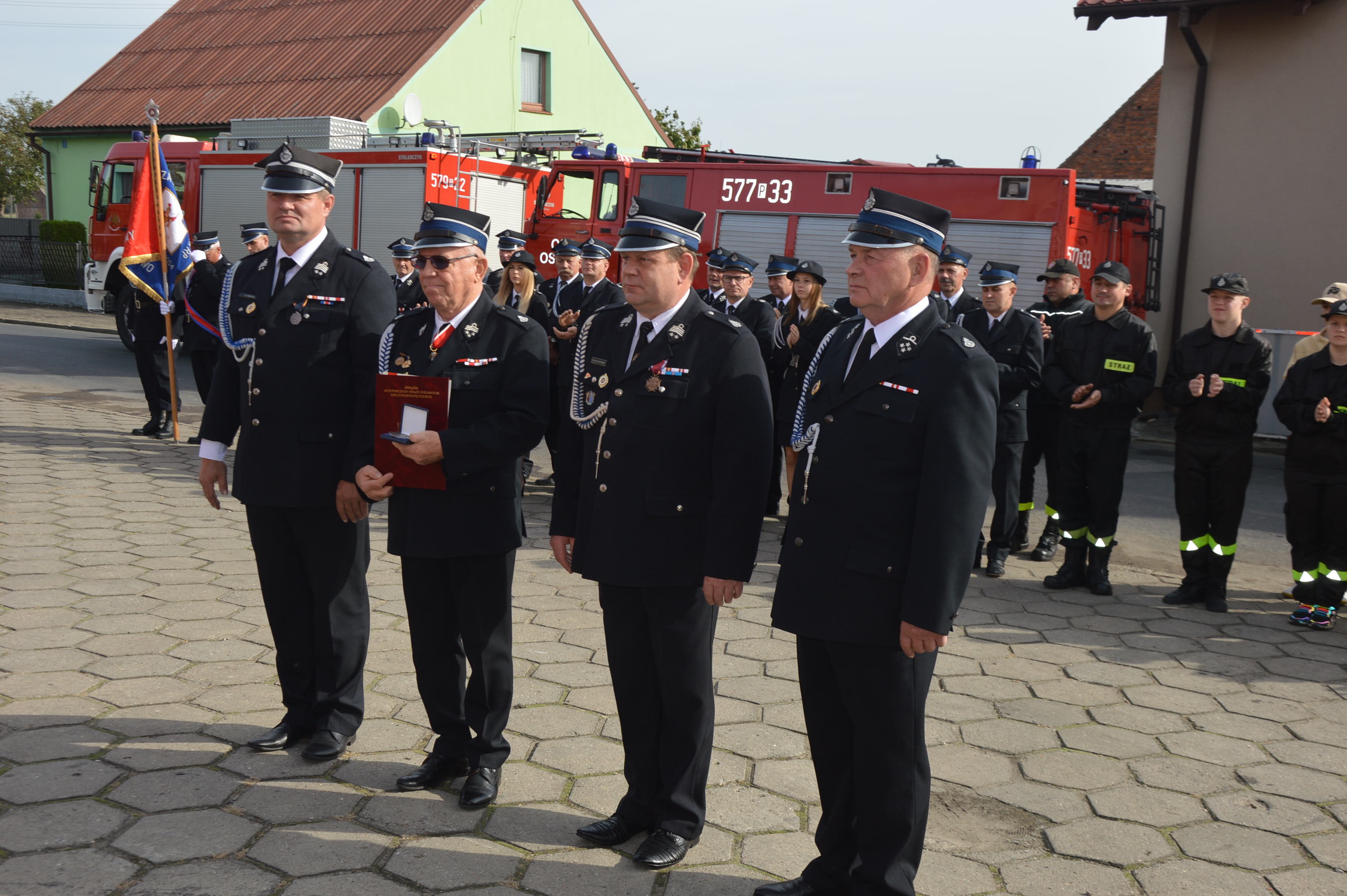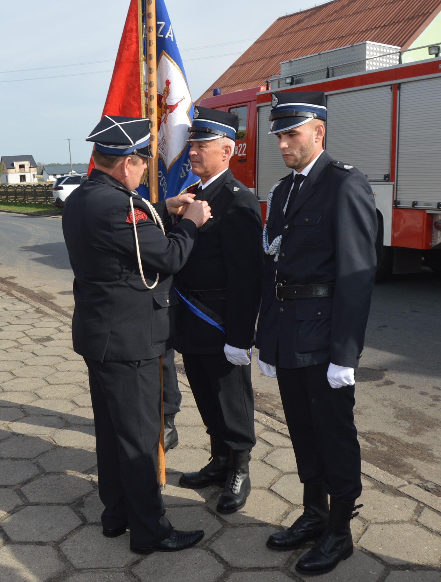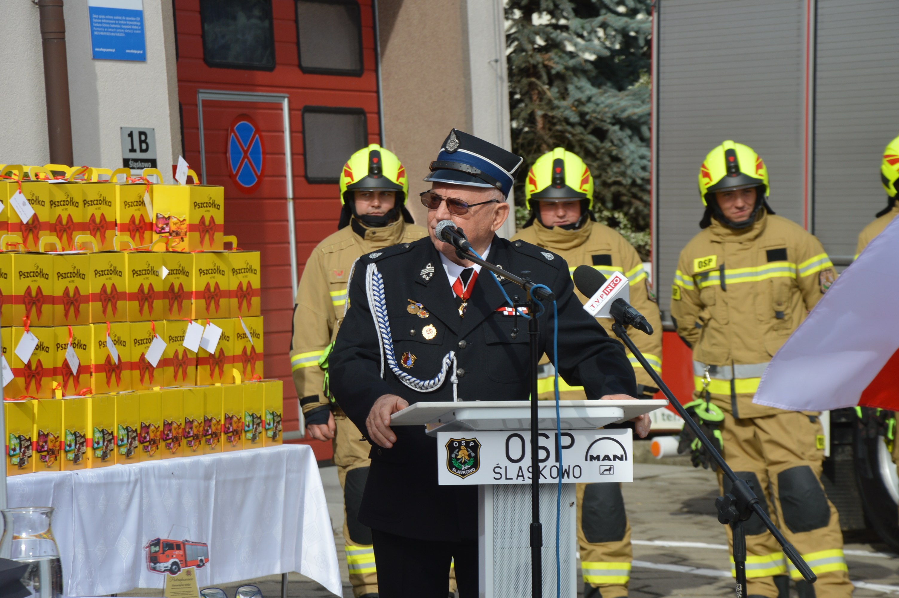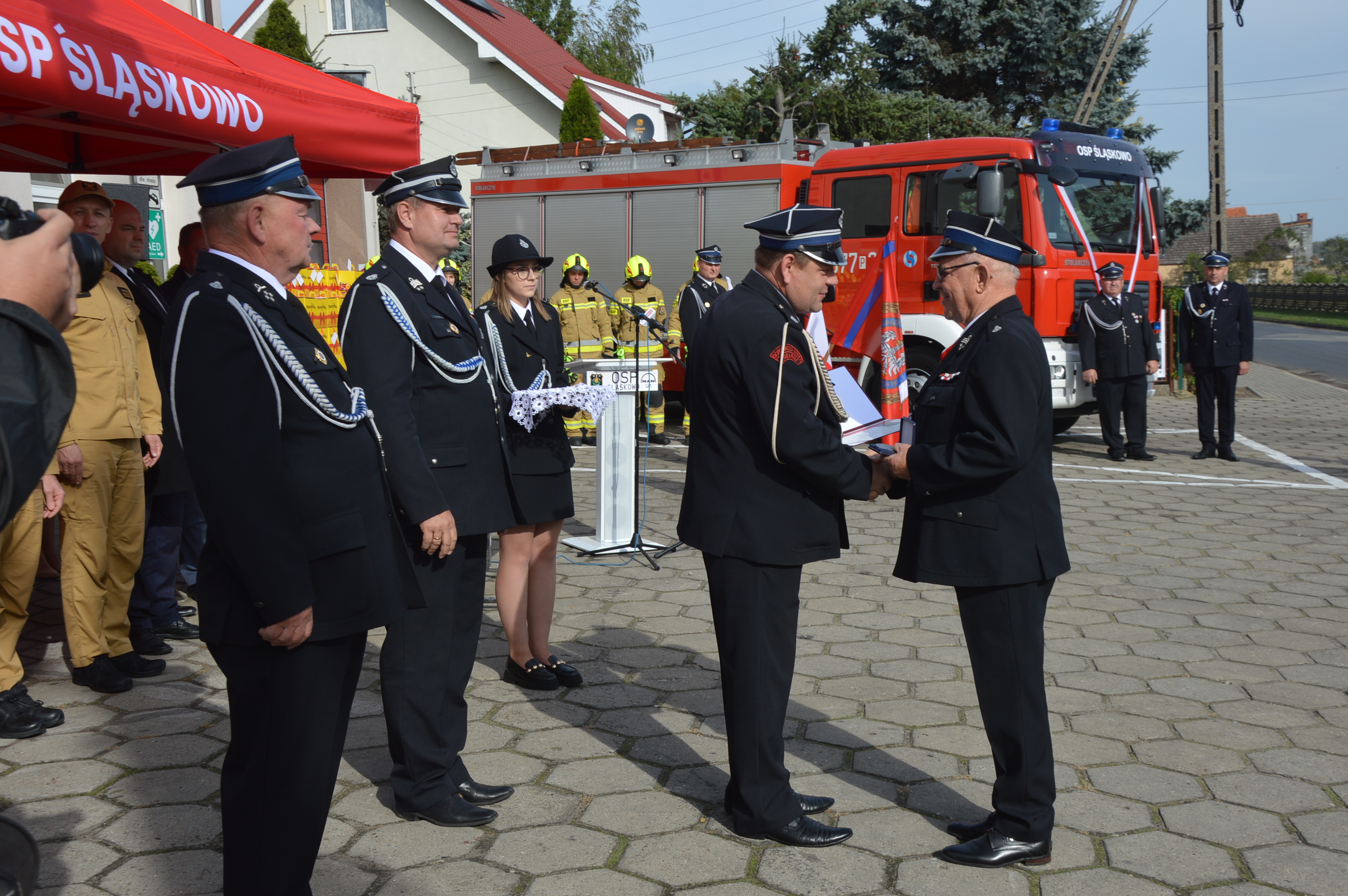 Następnie podniesiona została flaga na maszt, a po przywitaniu gości przez Prezesa OSP Śląskowo Andrzeja Bartkowiaka, zasłużeni członkowie jednostki zostali uhonorowani odznaczeniami nadanymi przez władze Związku Ochotniczych Straży Pożarnych RP.