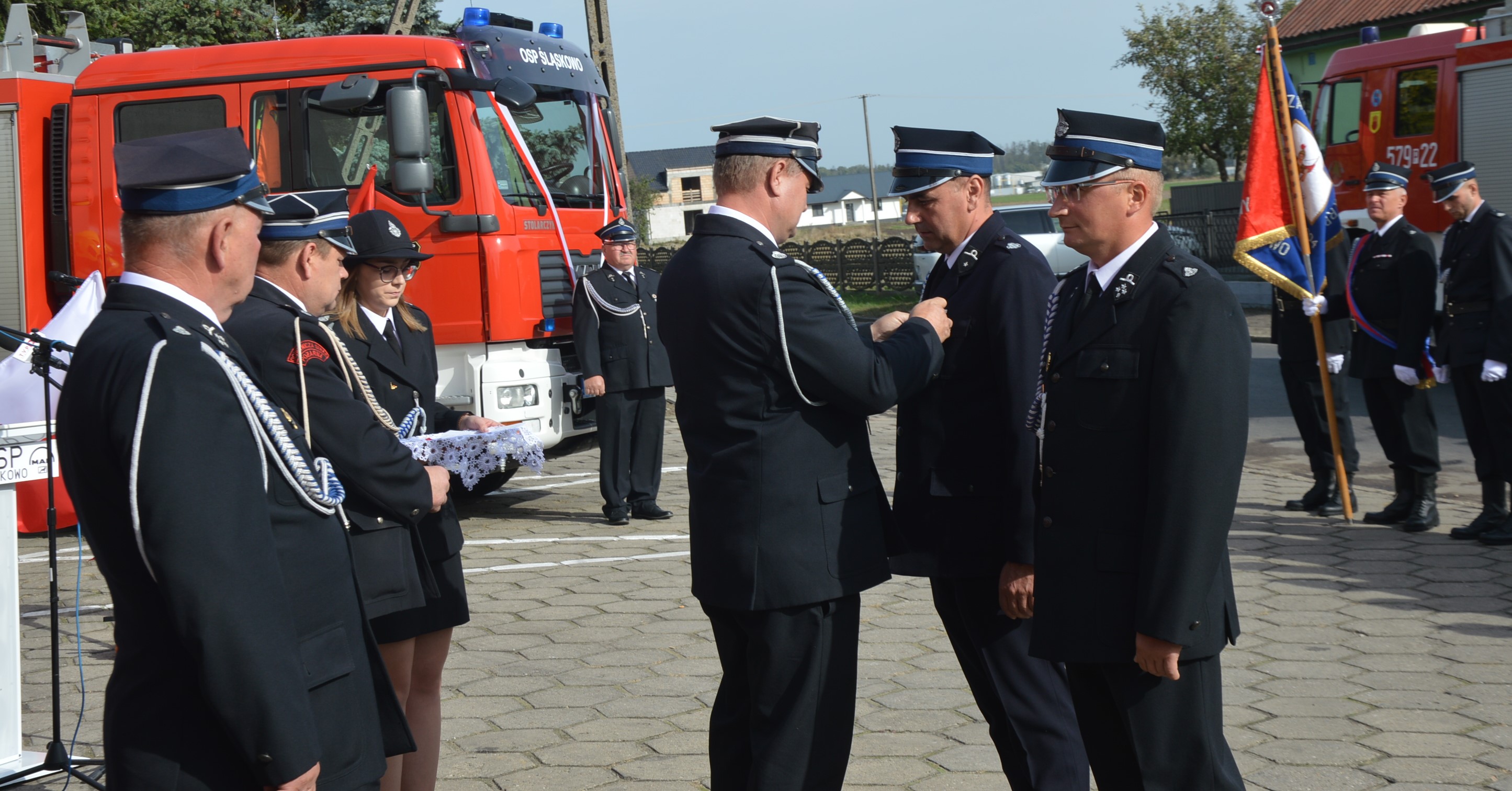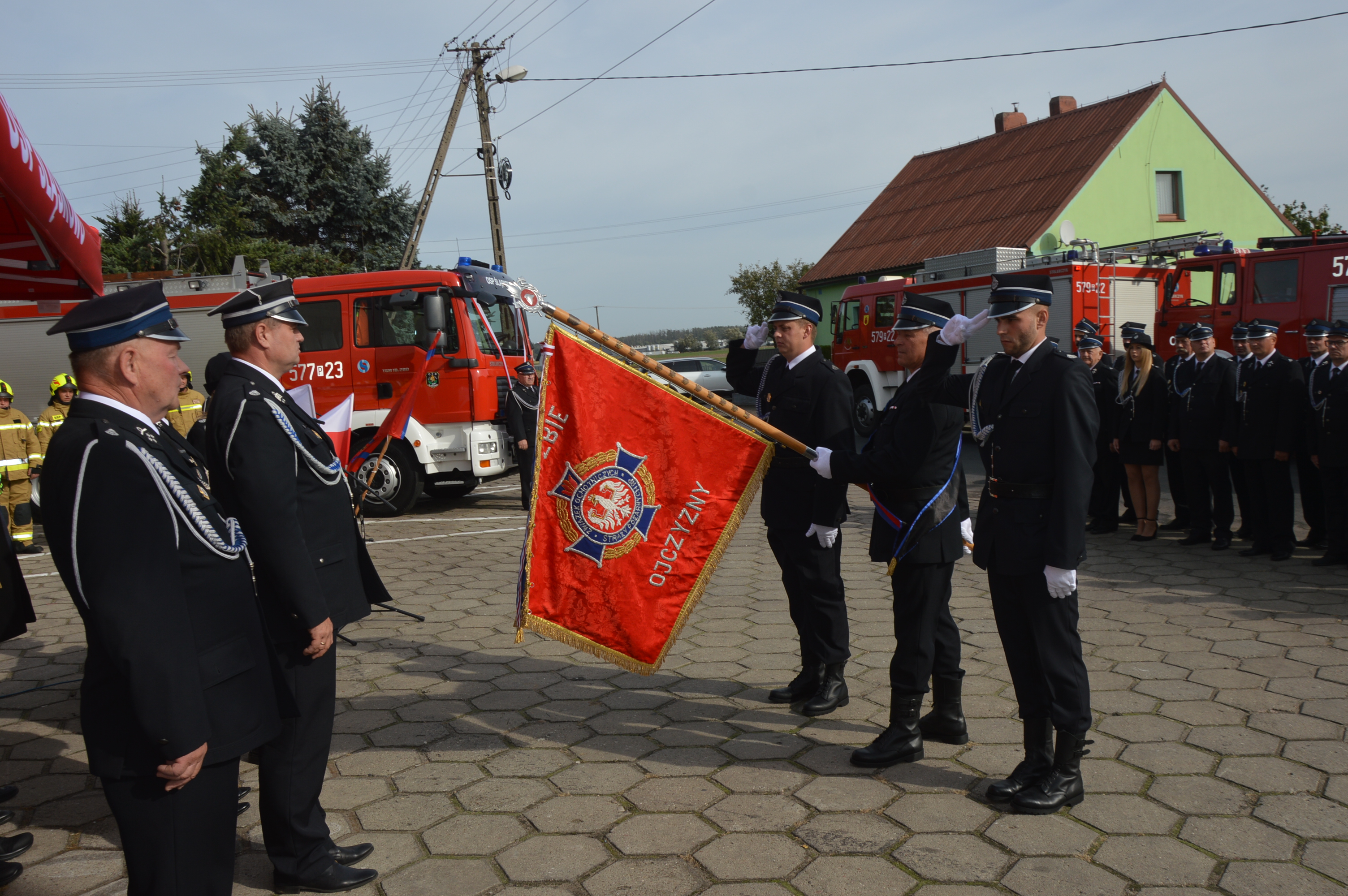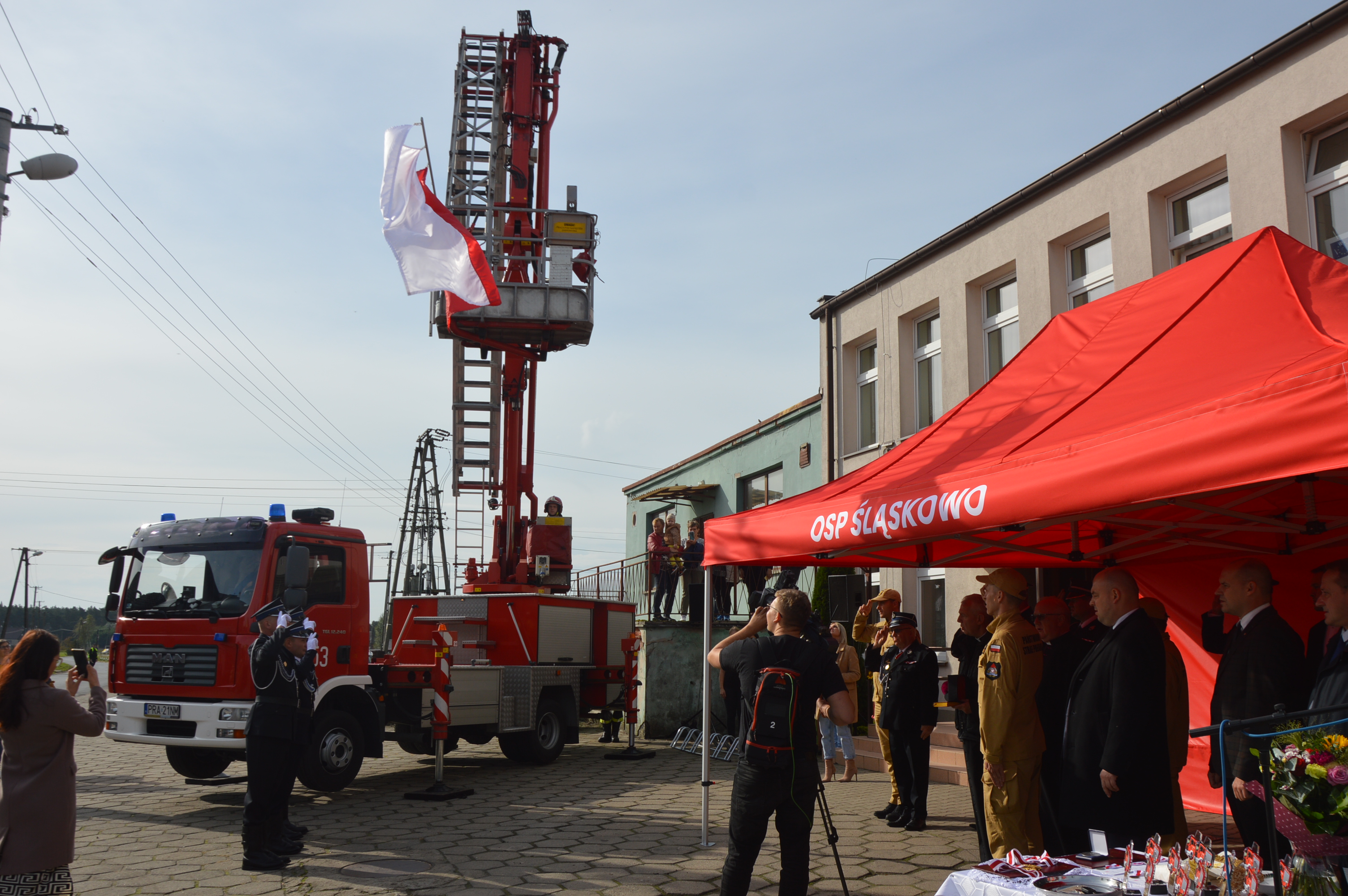 Następnie podniesiona została flaga na maszt, a po przywitaniu gości przez Prezesa OSP Śląskowo Andrzeja Bartkowiaka, zasłużeni członkowie jednostki zostali uhonorowani odznaczeniami nadanymi przez władze Związku Ochotniczych Straży Pożarnych RP.