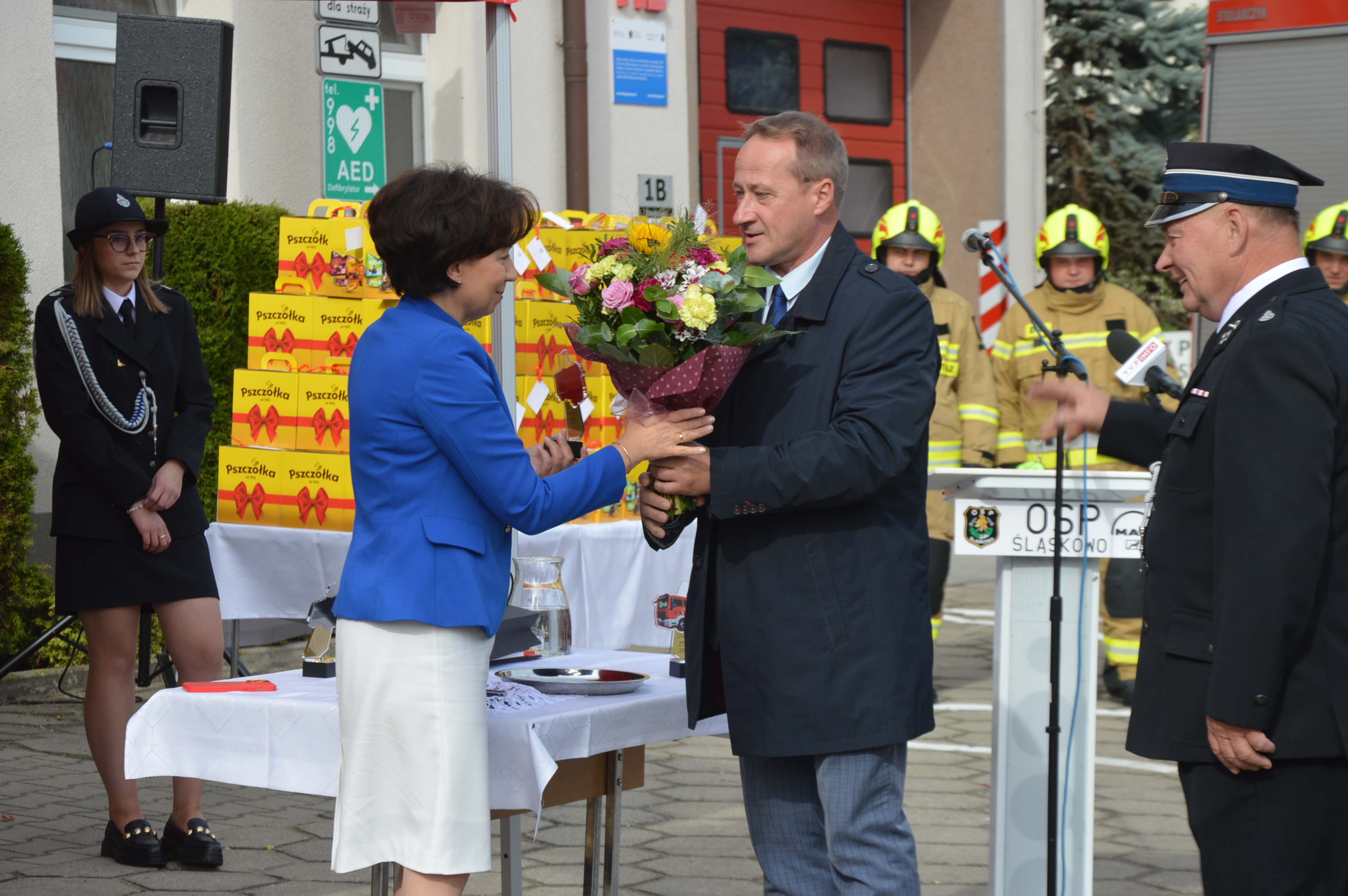 Gratulacje, podziękowania i życzenia Zarządowi oraz wszystkim druhnom i druhom OSP w Śląskowie oraz członkom Młodzieżowej Drużyny Pożarniczej złożyła Pani Minister Marlena Maląg, Pan Minister Jan Dziedziczak, Zastępca Wielkopolskiego Komendanta Wojewódzkiego PSP st. bryg. Tomasz Grelak, Starosta Rawicki Pan Adam Sperzyński, Burmistrz Miasta i Gminy Jutrosin Pan Romuald Krzyżosiak oraz Prezes ZOMG ZOSP RP w Jutrosinie dh Stanisław Janiak.