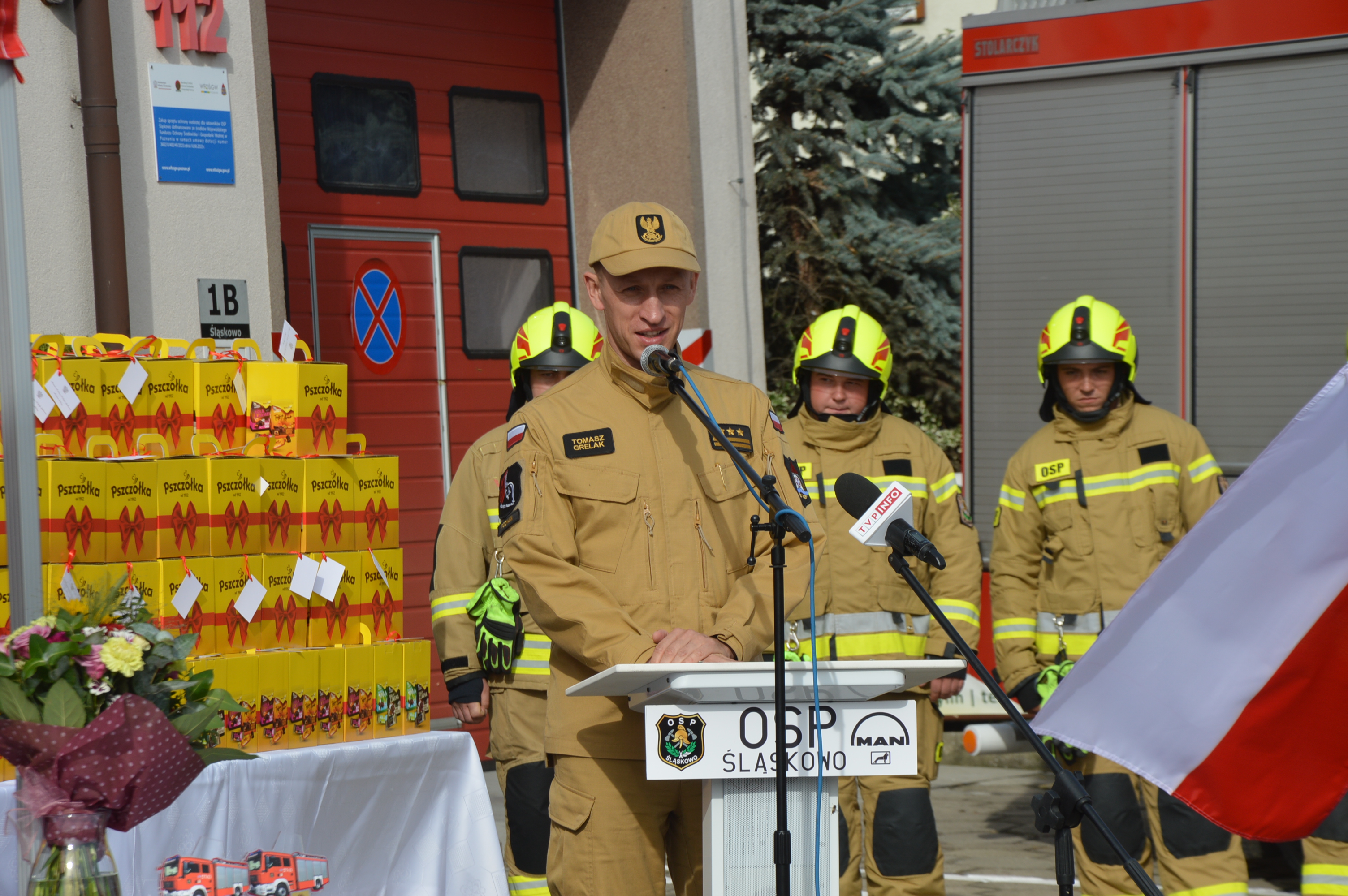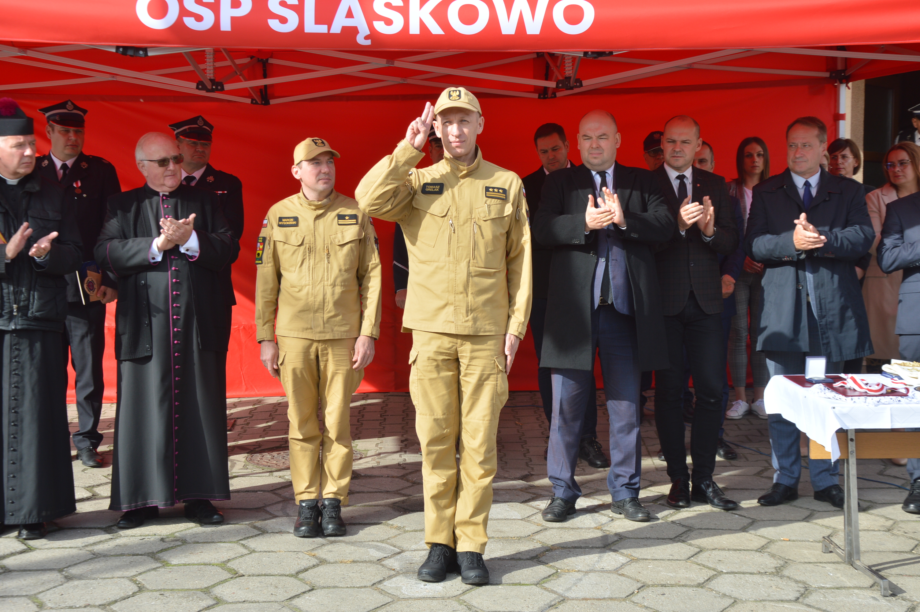 Uroczysty apel rozpoczął się od złożenia meldunku Zastępcy Wielkopolskiego Komendanta Wojewódzkiego PSP sty.bryg. Tomaszowi Grelakowi przez dowódcę uroczystości, dh. Dawida Zuziaka – naczelnika OSP Śląskowo.