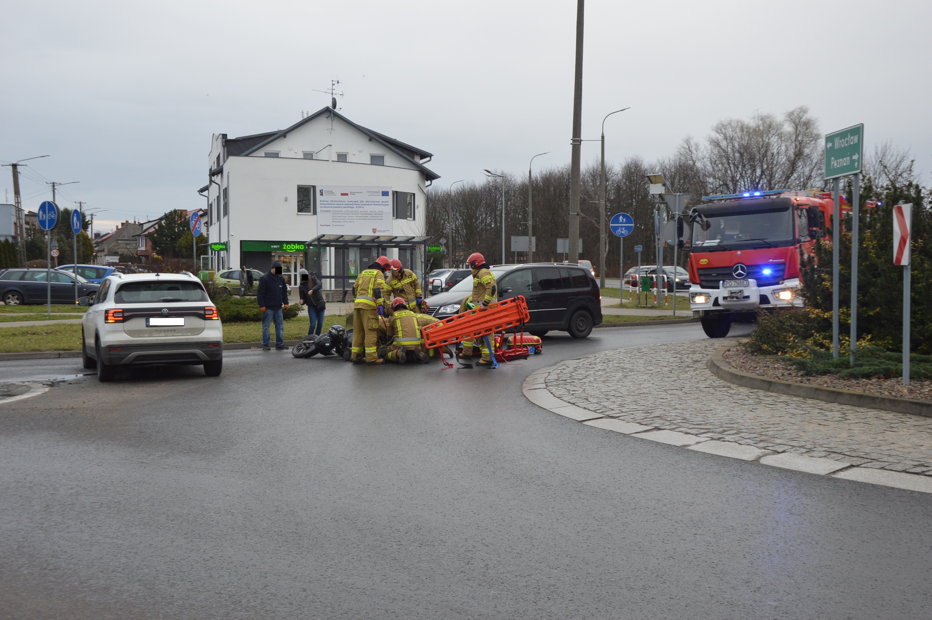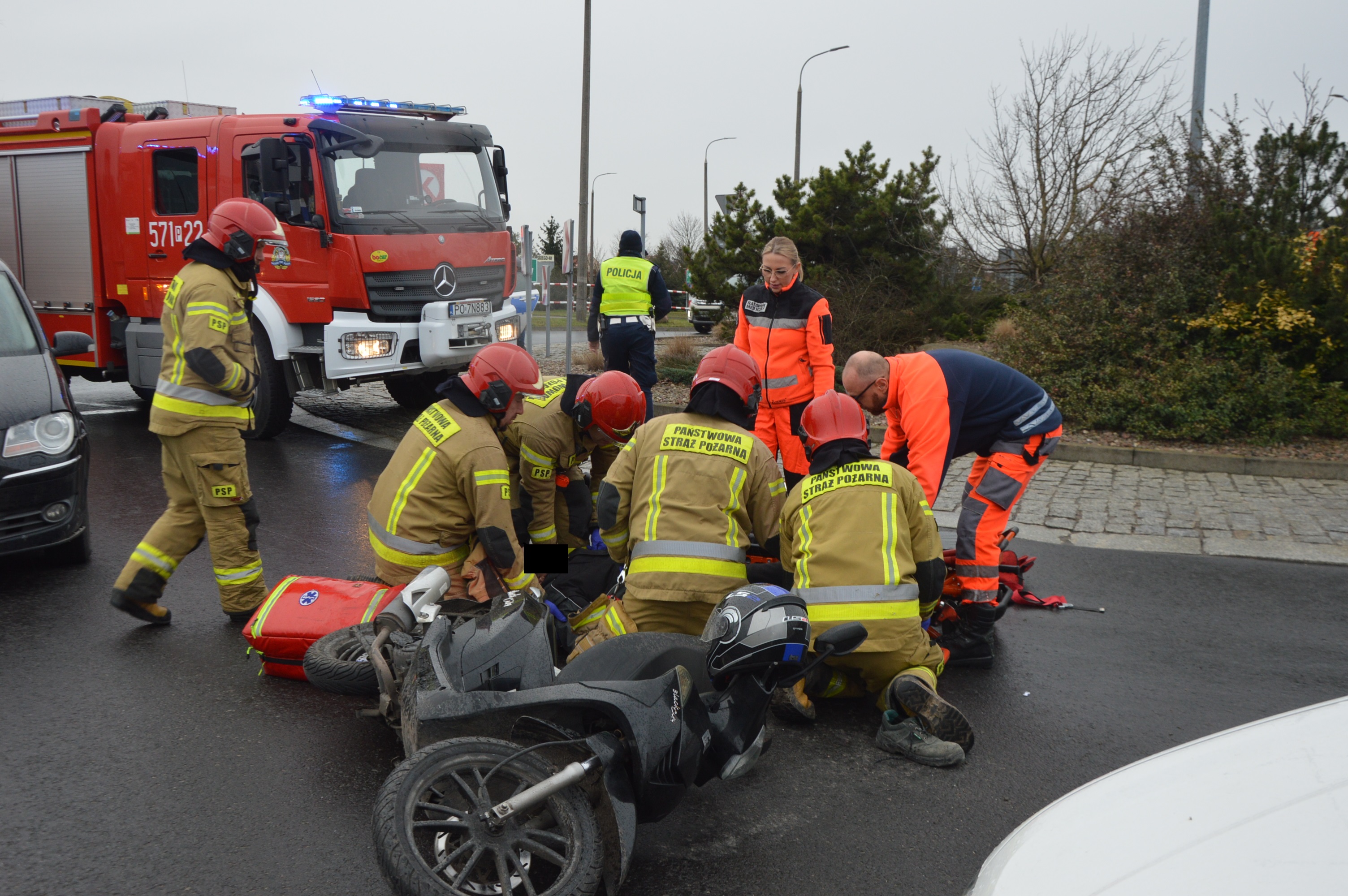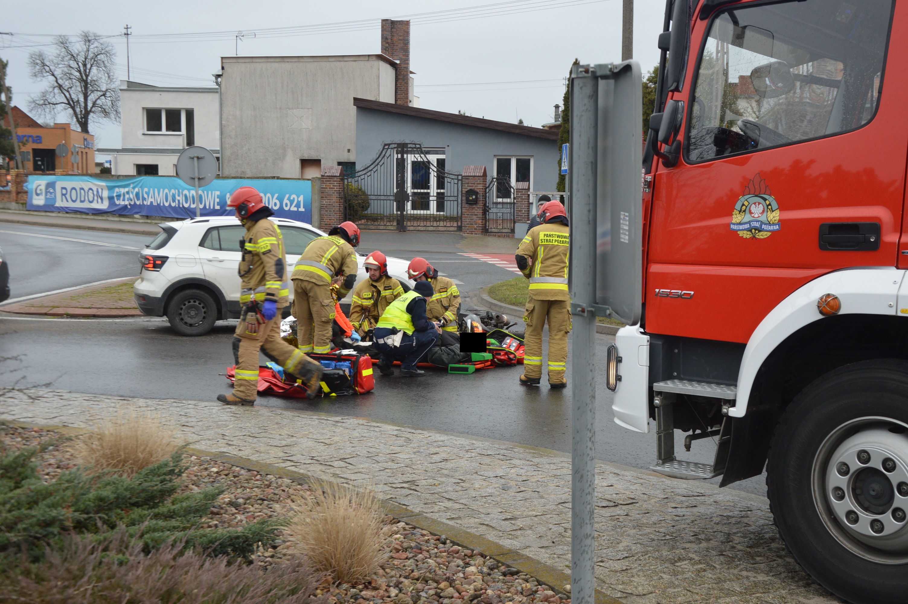 W wyniku zderzenia obu pojazdów poszkodowany został rawiczanin kierujący jednośladem. W momencie przyjazdu strażaków był przytomny, uskarżał się na ból kończyny dolnej. Po zabezpieczeniu terenu akcji ratownicy udzielili mu kwalifikowanej pierwszej pomocy, polegającej na stabilizacji nogi, wsparciu psychicznym oraz termoizolacji. Pomogli również policjantom upłynniać ruch na rondzie.