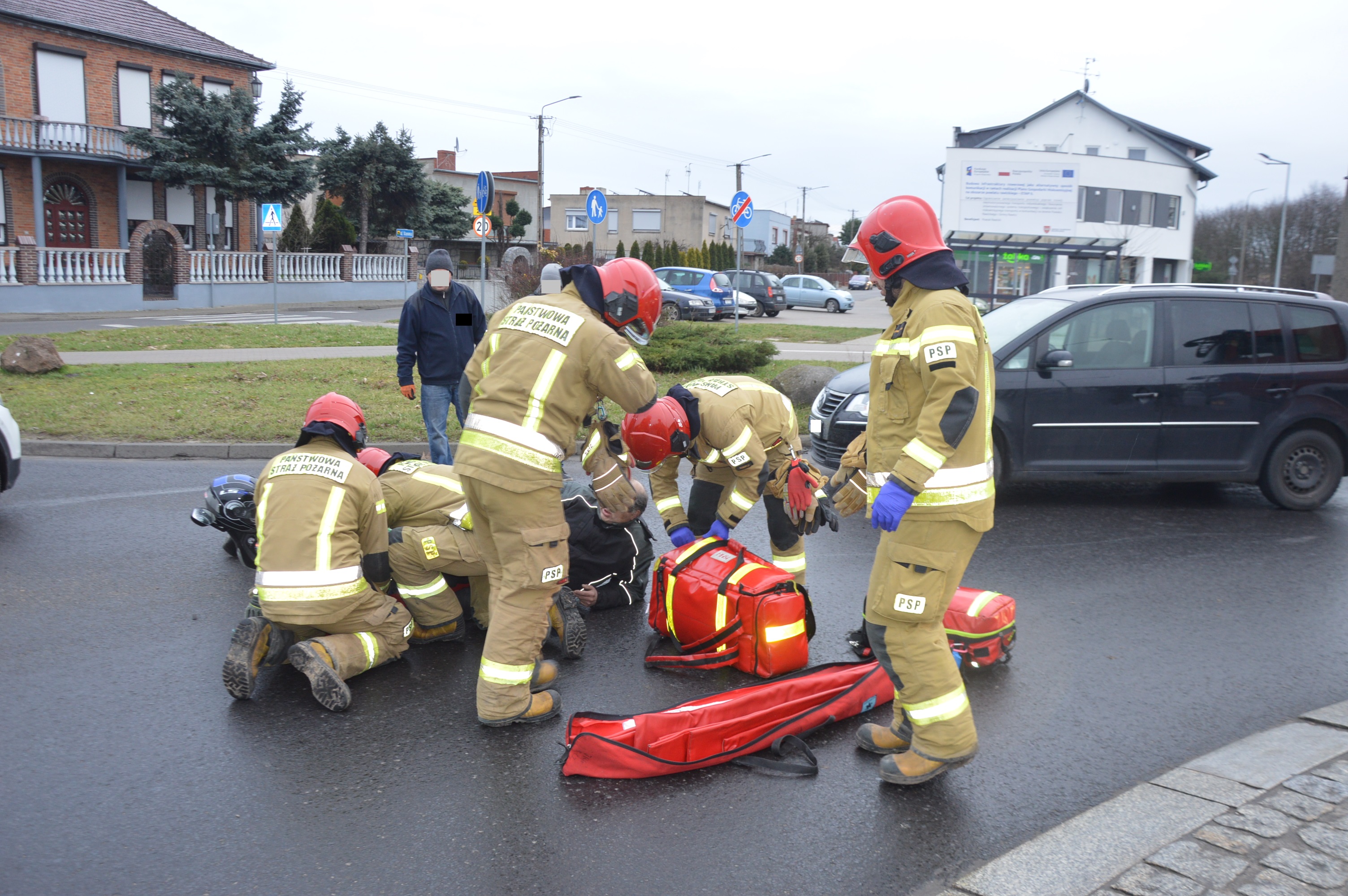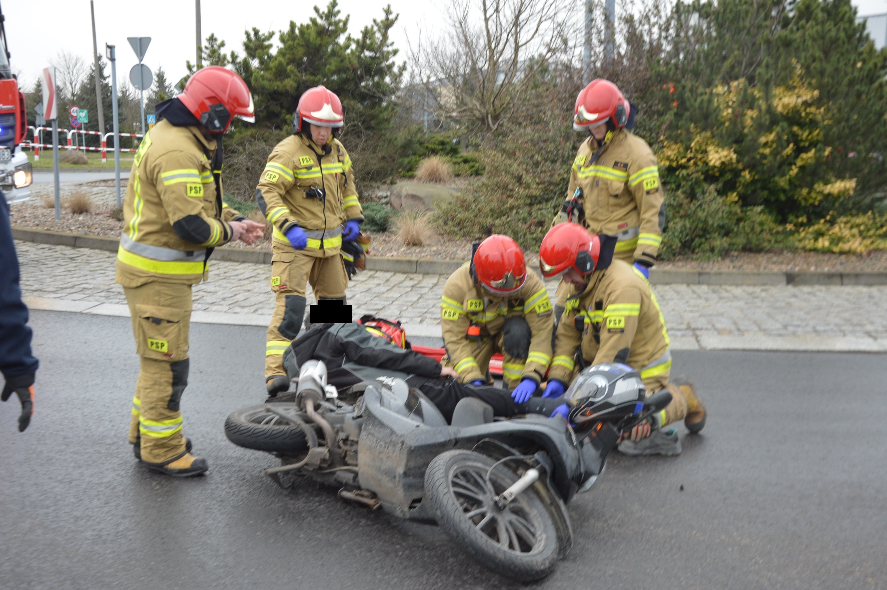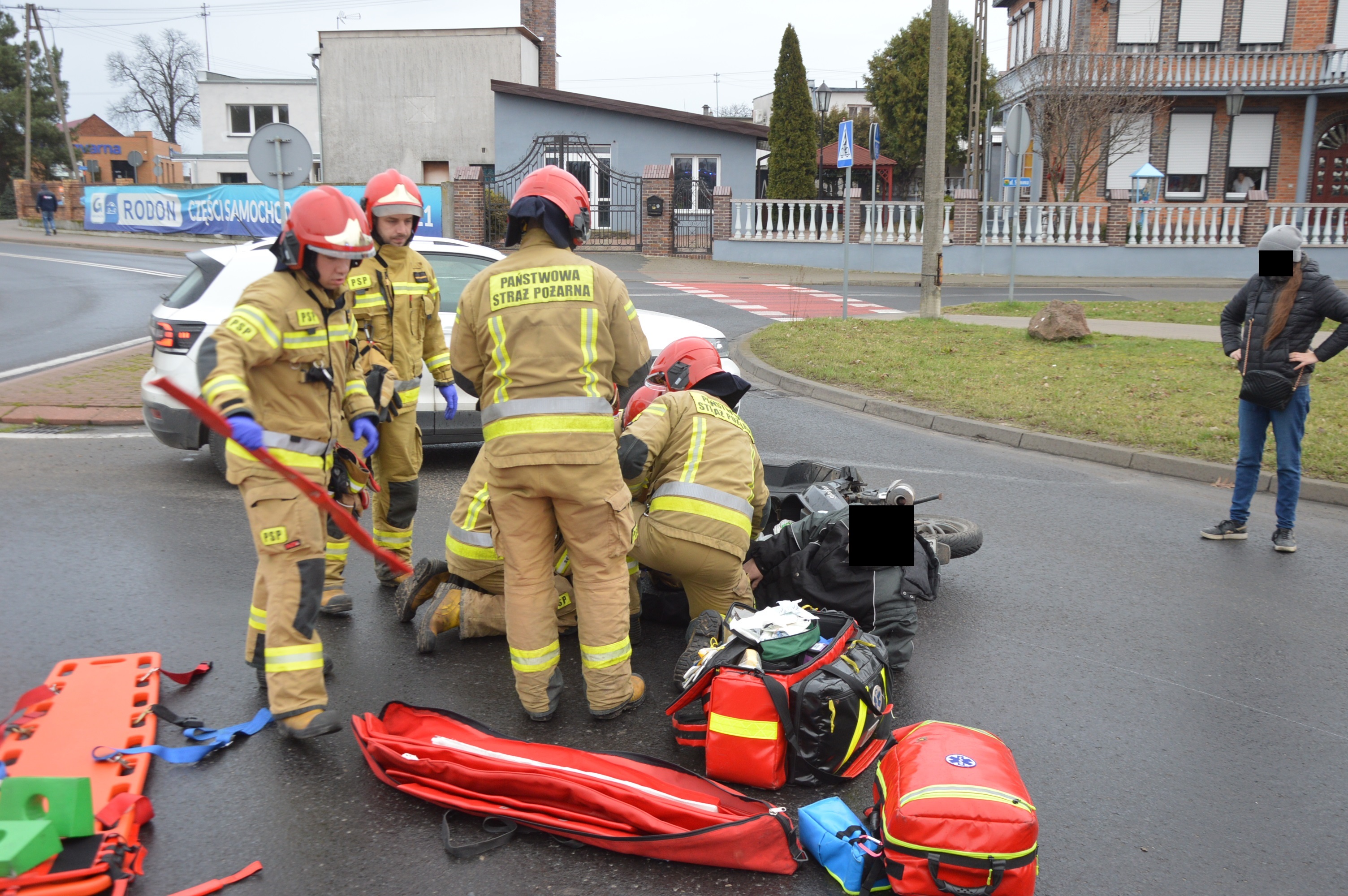 W wyniku zderzenia obu pojazdów poszkodowany został rawiczanin kierujący jednośladem. W momencie przyjazdu strażaków był przytomny, uskarżał się na ból kończyny dolnej. Po zabezpieczeniu terenu akcji ratownicy udzielili mu kwalifikowanej pierwszej pomocy, polegającej na stabilizacji nogi, wsparciu psychicznym oraz termoizolacji. Pomogli również policjantom upłynniać ruch na rondzie.