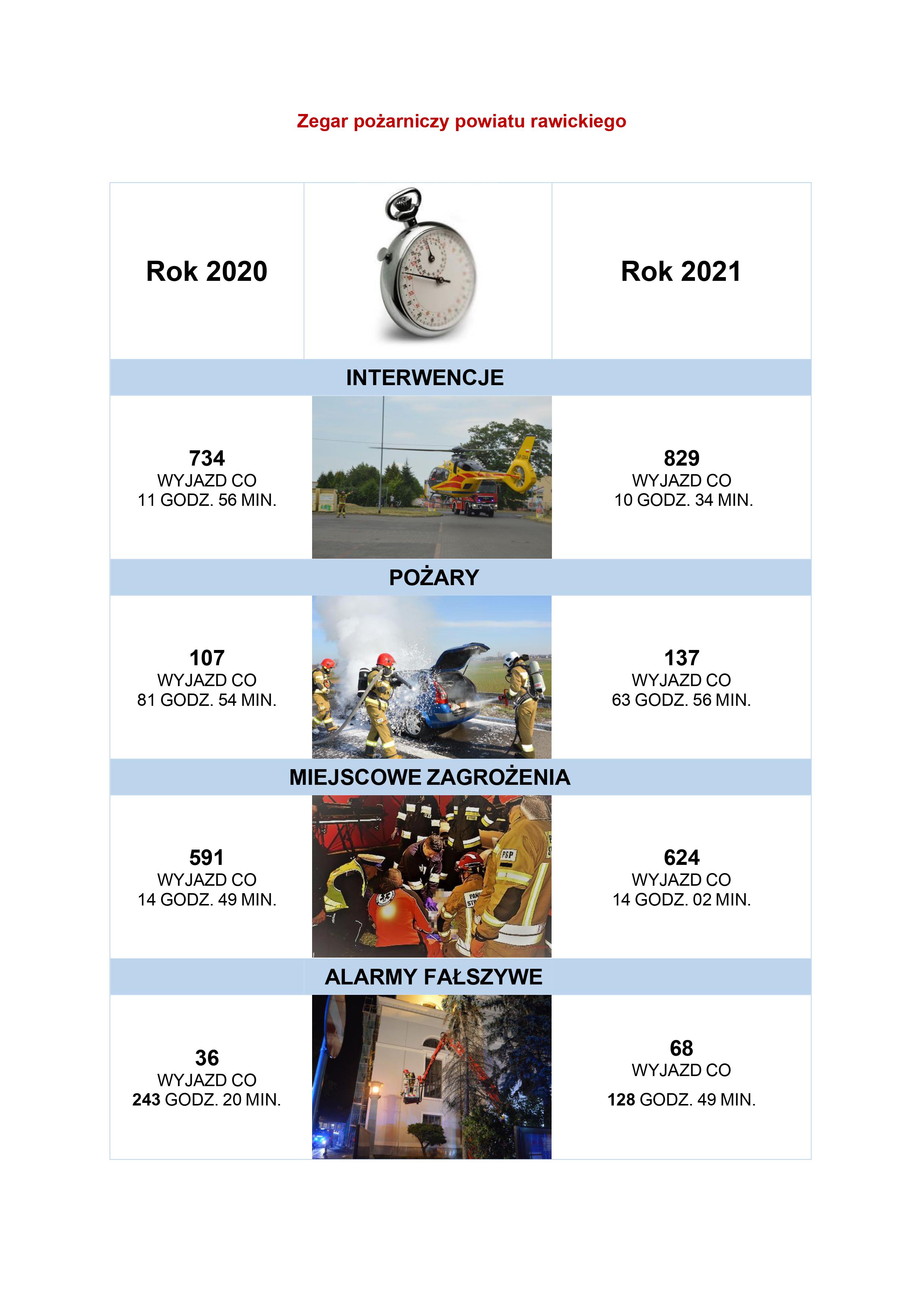 W roku 2021 na terenie powiatu rawickiego miała miejsce rekordowa liczba zdarzeń. Strażacy ugasili 137 pożarów, zlikwidowali skutki 624 innych miejscowych zagrożeń oraz wyjeżdżali do 68 alarmów fałszywych. W wyniku zaistniałych zagrożeń 12 osób poniosło śmierć, a 77 zostało rannych.