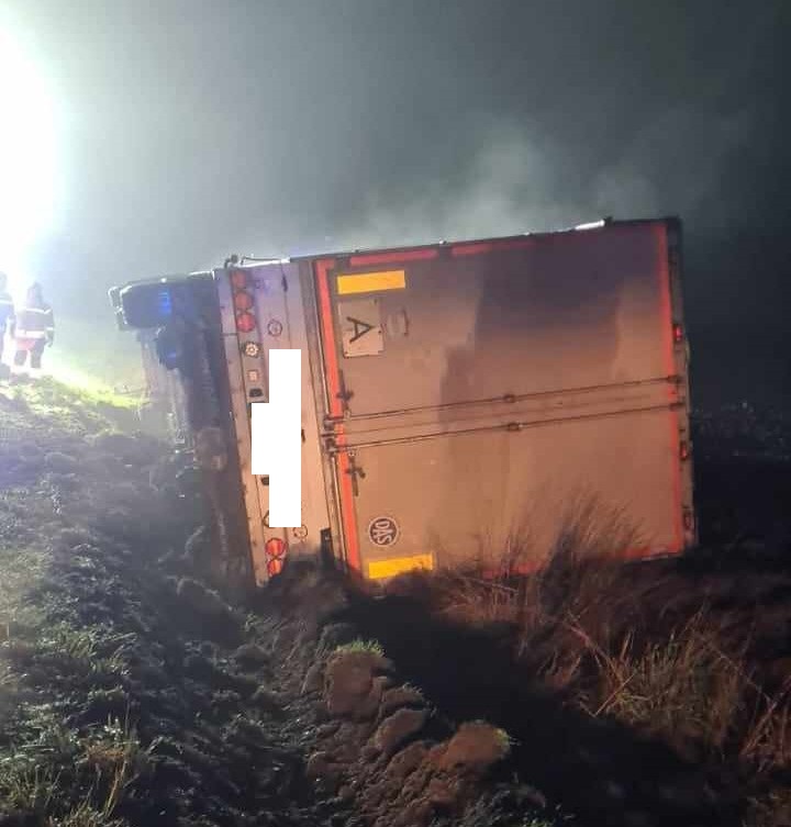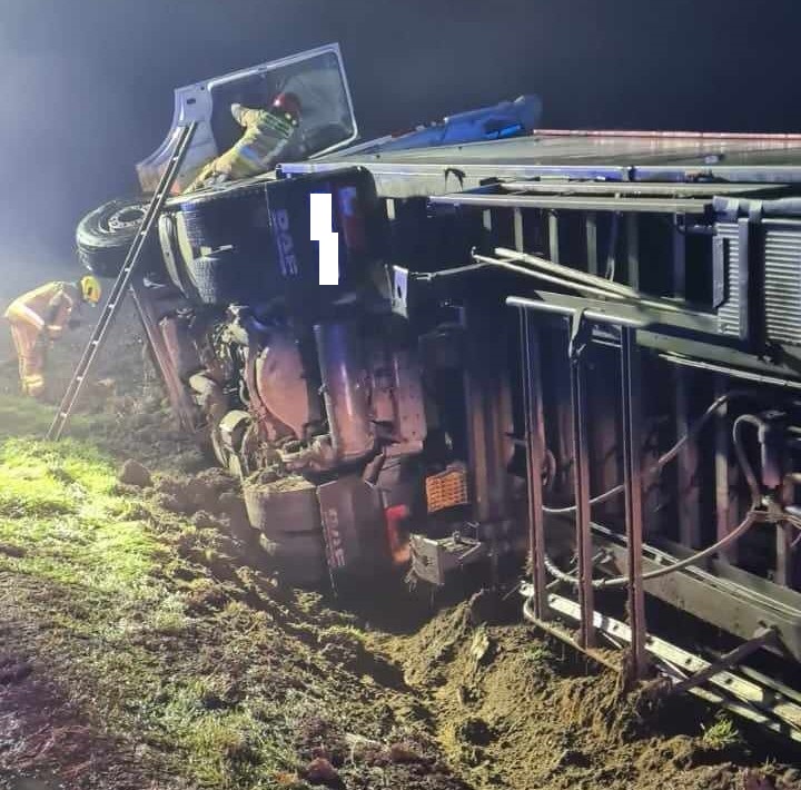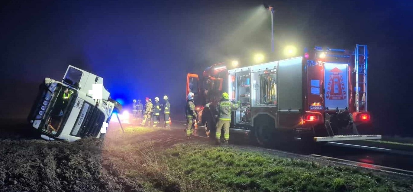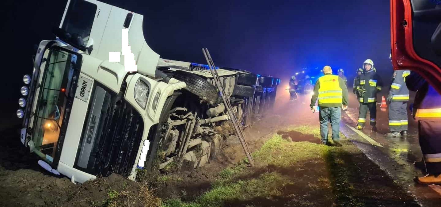 Ciągnik siodłowy z naczepą wypełnioną odpadami zjechał na pobocze i przewrócił się do rowu. Kierowca nie odniósł obrażeń. Na miejscu kolizji interweniowały cztery zastępy strażaków.