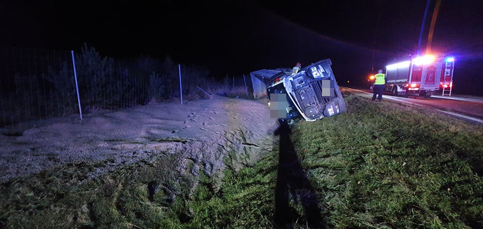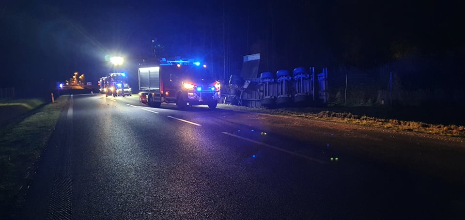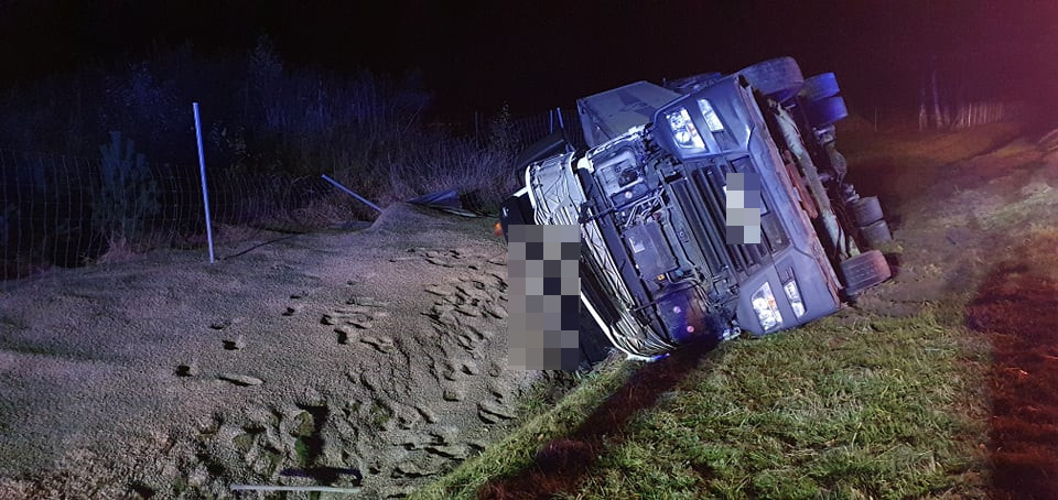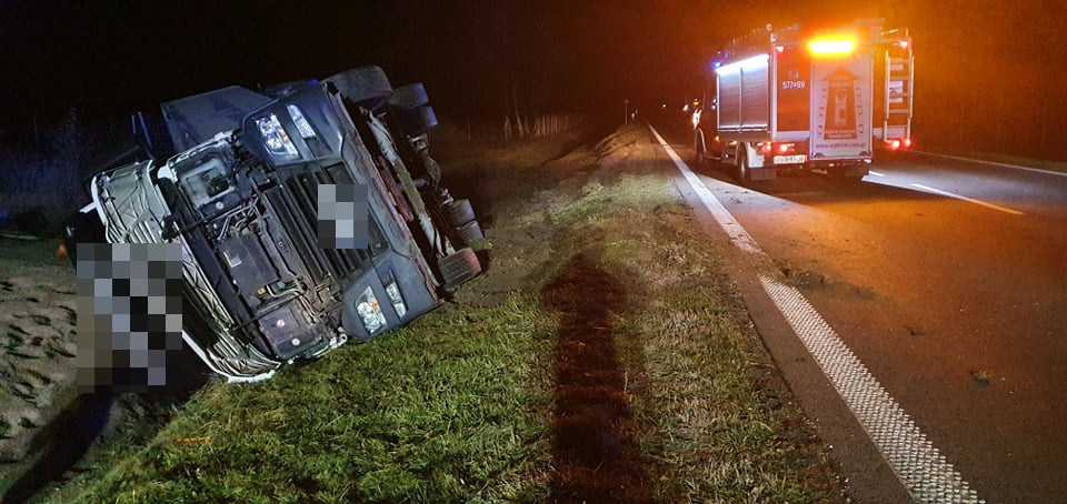 Ciągnik siodłowy z naczepą, transportujący kruszywo, zjechał na pobocze i przewrócił się do przydrożnego rowu. Kierowca został niegroźnie ranny w głowę.