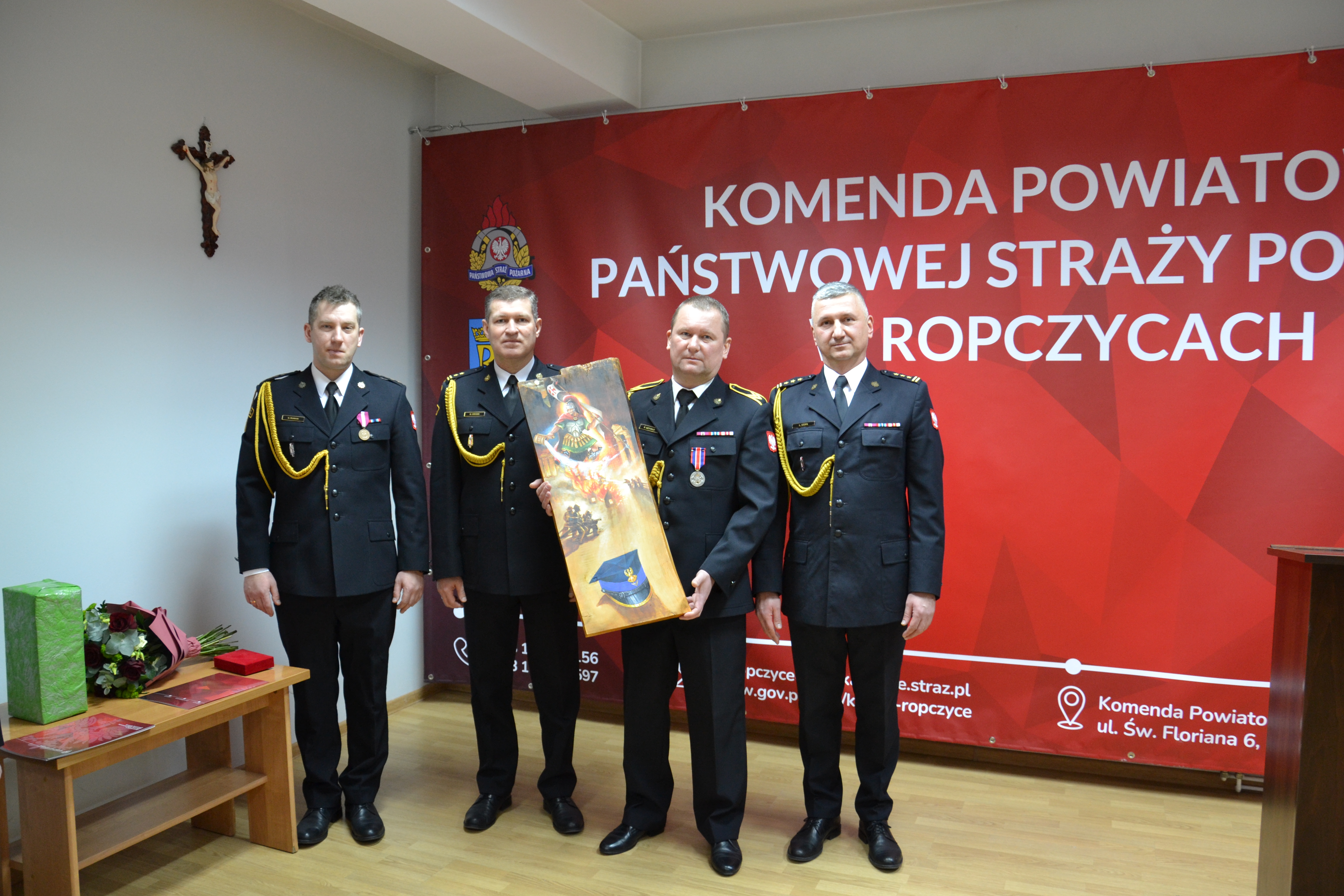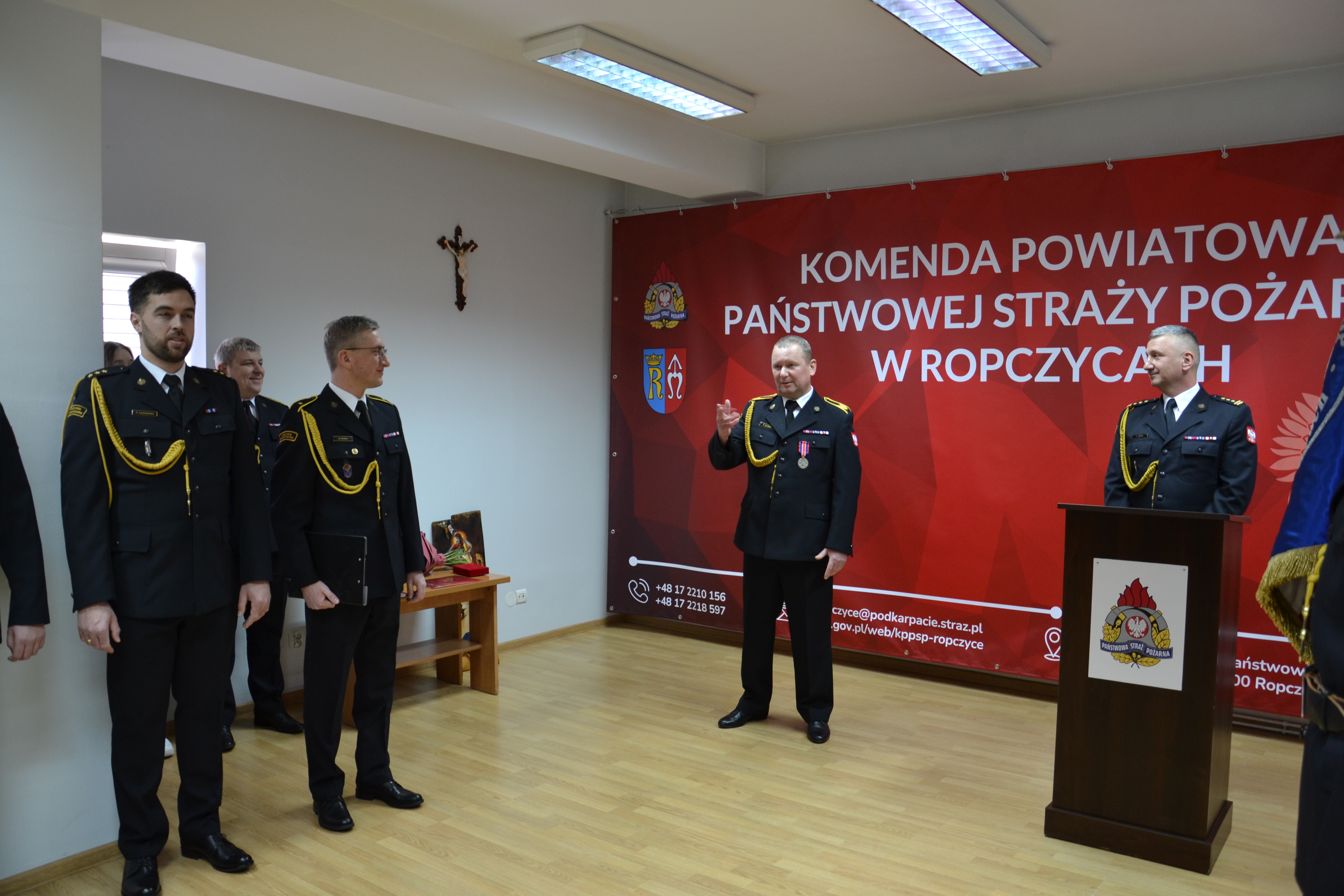 27 stycznia 2025r. w Komendzie Powiatowej Państwowej Straży Pożarnej w Ropczycach odbyła się uroczysta zbiórka z okazji przejścia na zaopatrzenie emerytalne st. ogn. Piotra Szydło. Za wieloletnią służbę w szeregach Państwowej Straży Pożarnej podziękował odchodzącemu strażakowi st. bryg. Łukasz Szopa Komendant Powiatowy PSP w Ropczycach. Za swoją postawę i zaangażowanie w służbie, st. ogn. Piotr Szydło został odznaczony: Brązowym Medalem za długoletnią służbę, Srebrną Odznaką Zasłużony dla Ochrony Przeciwpożarowej oraz Srebrnym Medalem Za Zasługi dla Pożarnictwa.