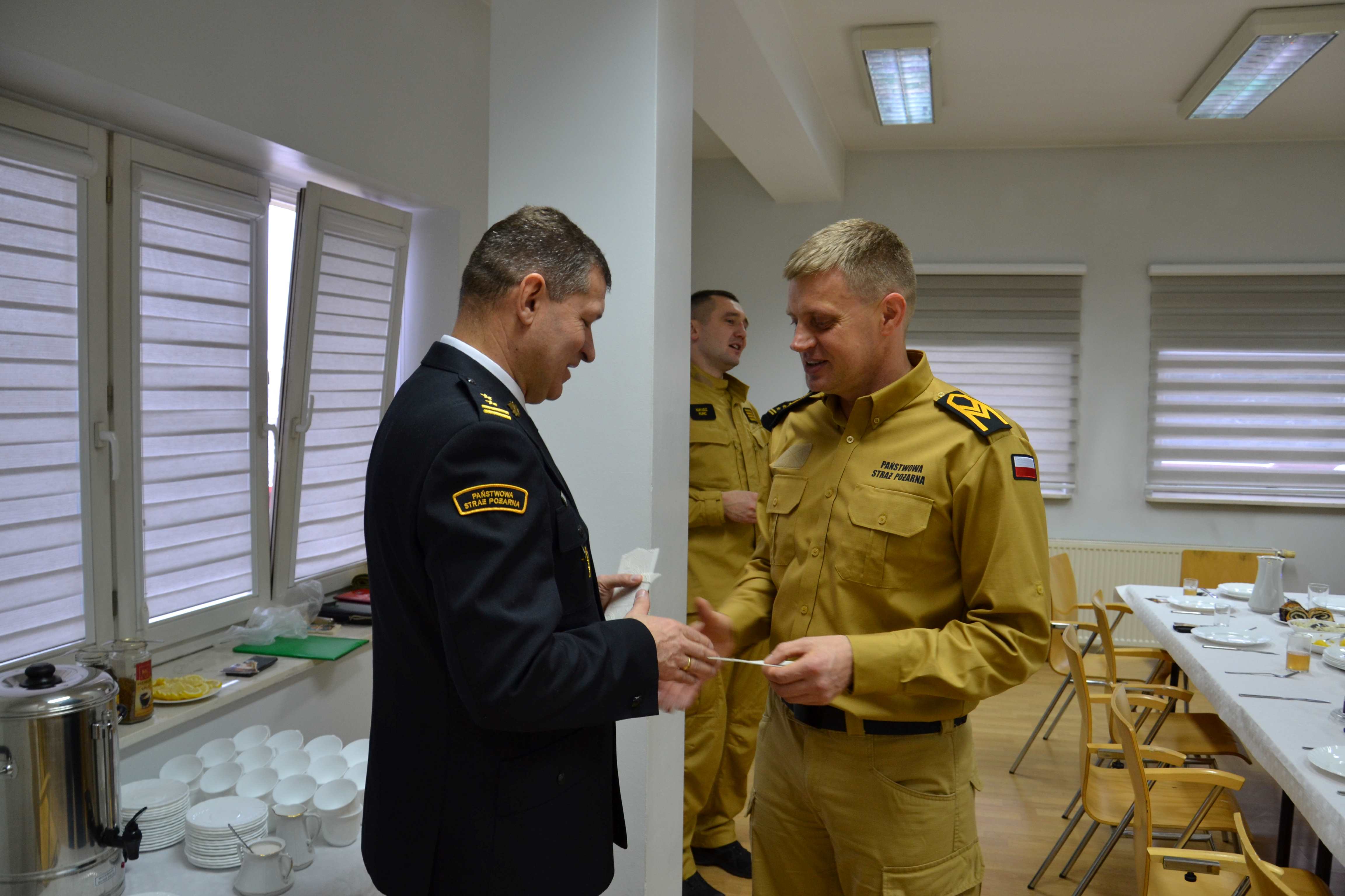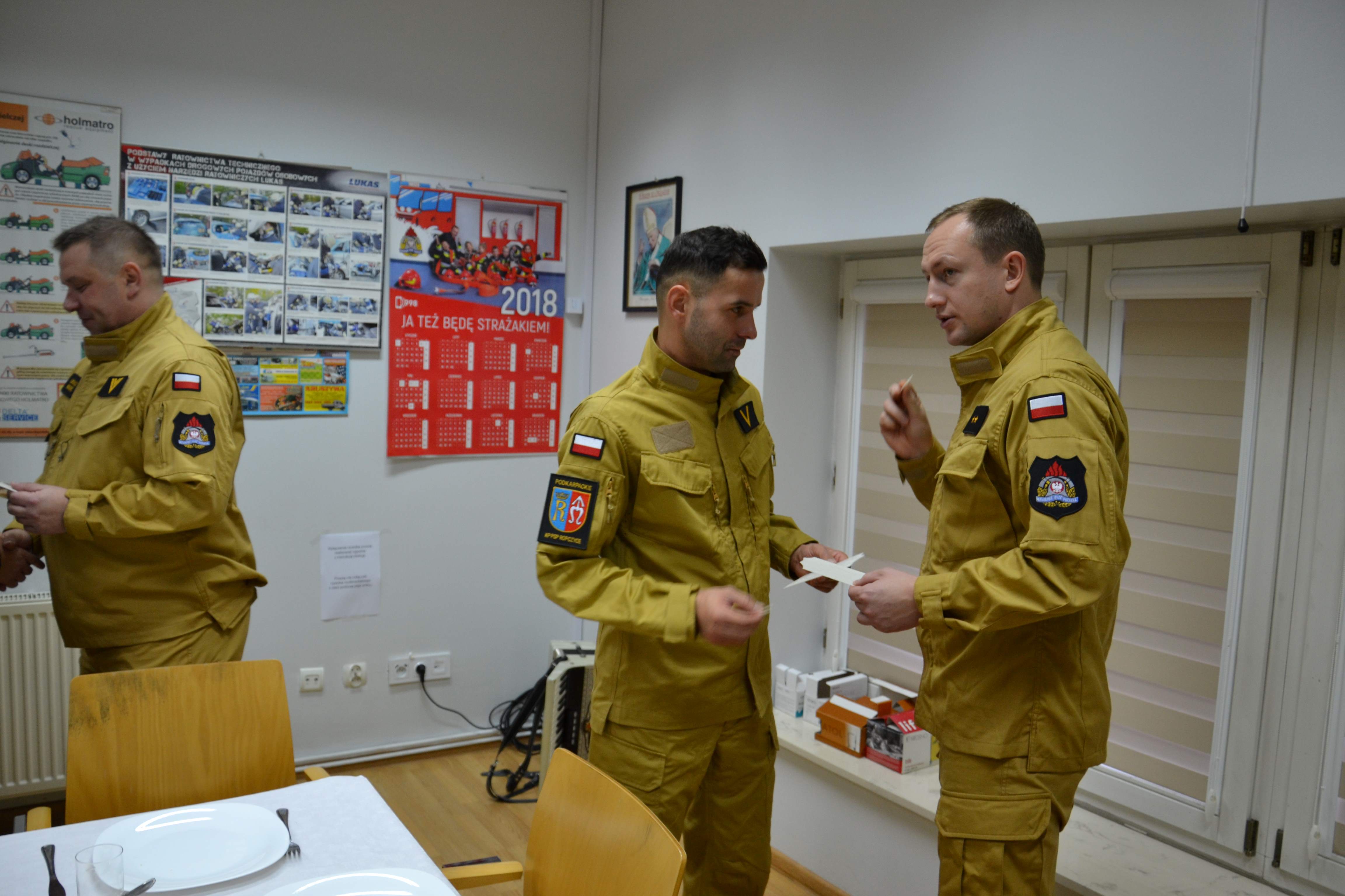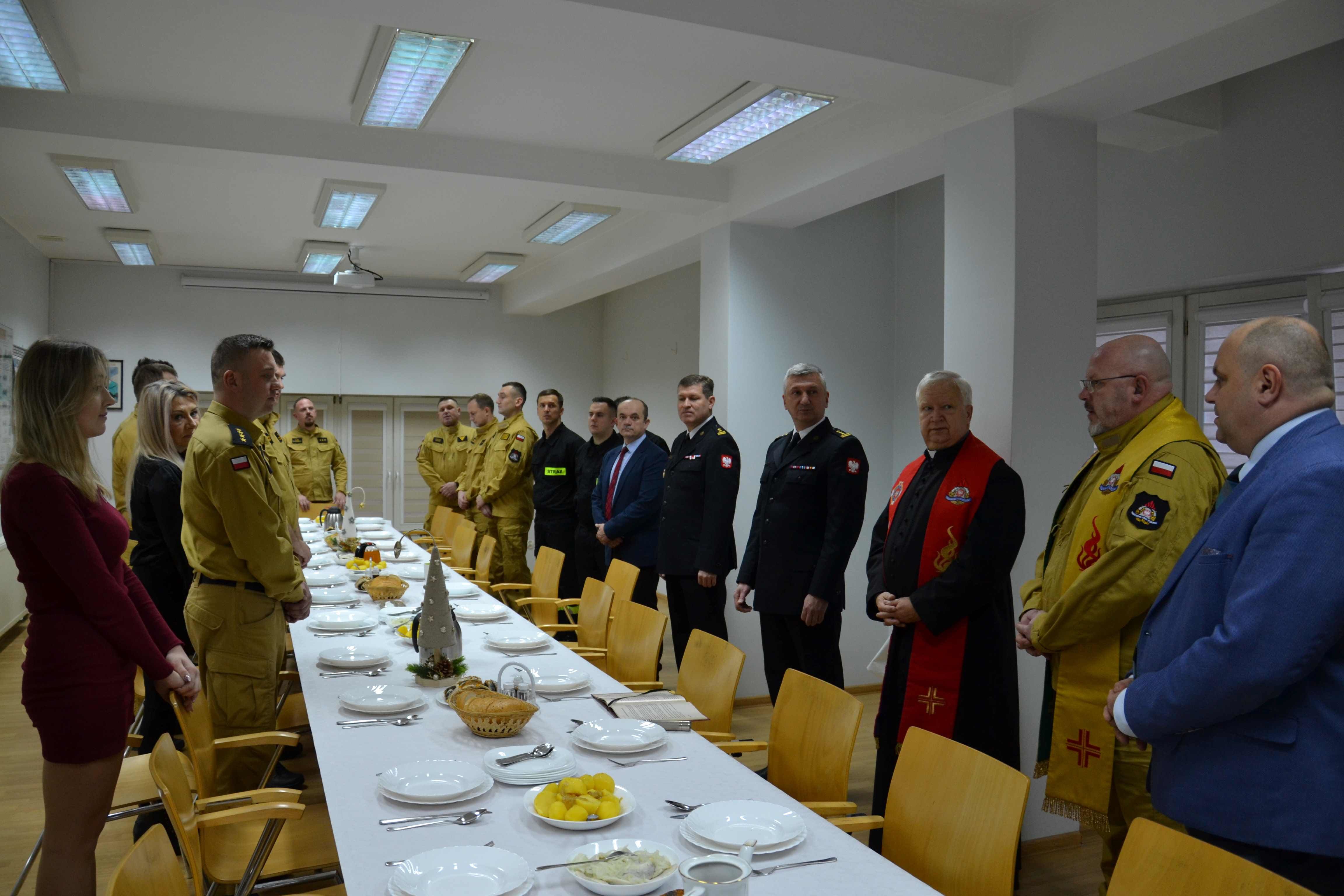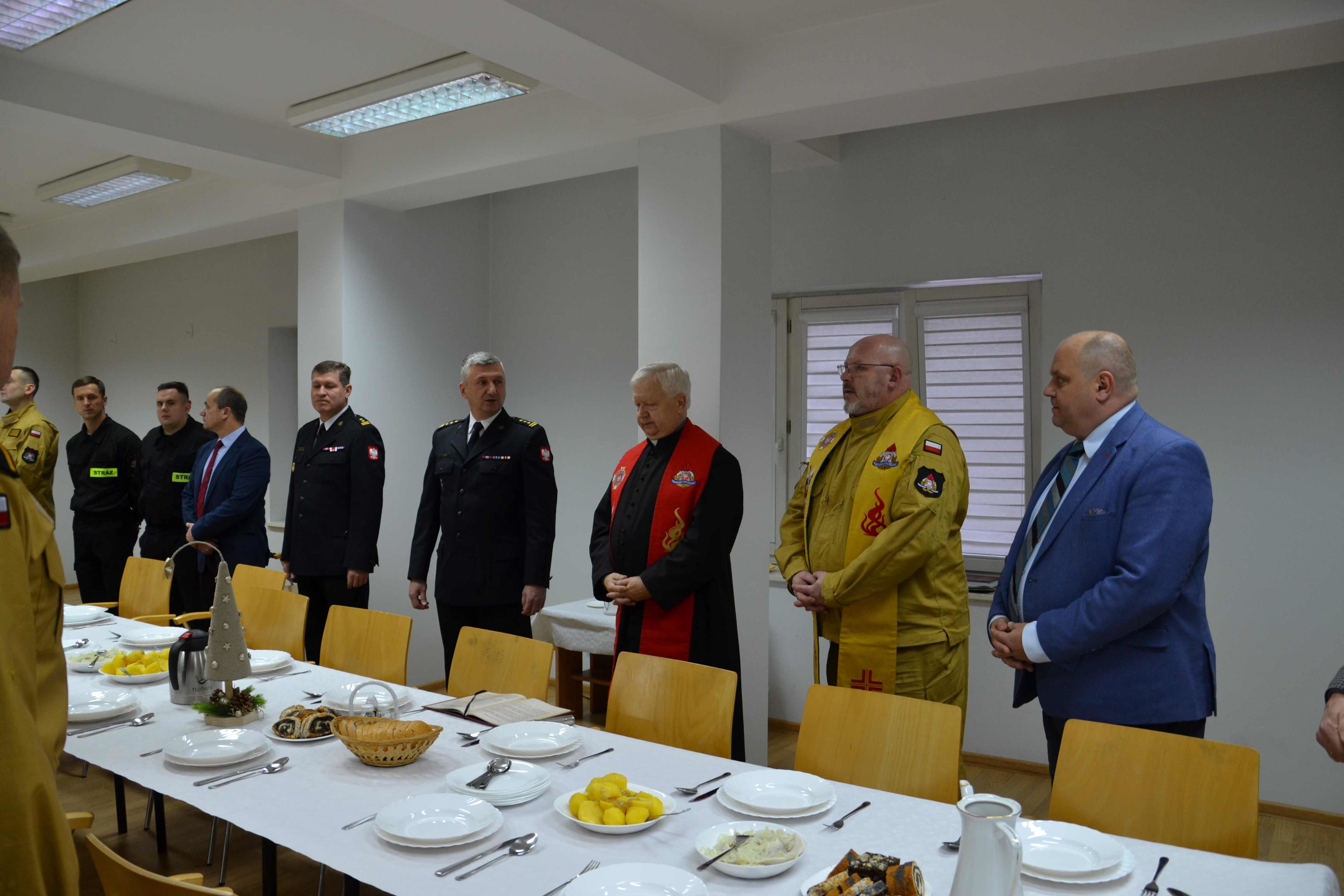 oraz st. bryg. Łukasz Szopa Komendant Powiatowy PSP w Ropczycach wraz ze swoim zastępca bryg. Bogusławem Drozd, a także strażacy tut. komendy i pracownicy cywilni. Spotkanie opłatkowe rozpoczął Komendant Powiatowy PSP st. bryg. Łukasz Szopa, który przywitał gości oraz życzył wszystkim zgromadzonym zdrowych, spokojnych spędzonych w rodzinnej atmosferze Świąt Bożego Narodzenia, następnie Ks. kapelan Leopold Kordas przekazał Słowo Boże oraz poświęcił opłatki. Następnie wszyscy zgromadzeni goście łamiąc się opłatkiem, złożyli wzajemne życzenia świąteczne. Podczas spotkania uczestnicy spożywali przygotowany przez strażaków posiłek, po którym nastąpiło wspólne kolędowanie.