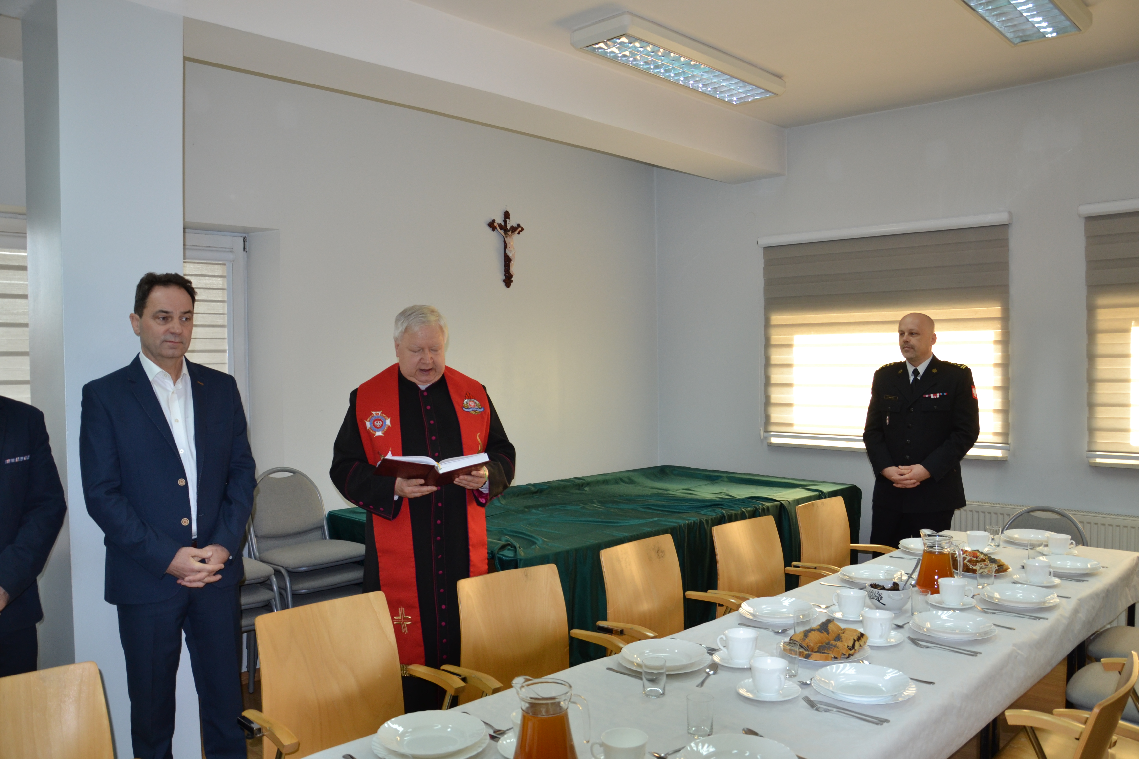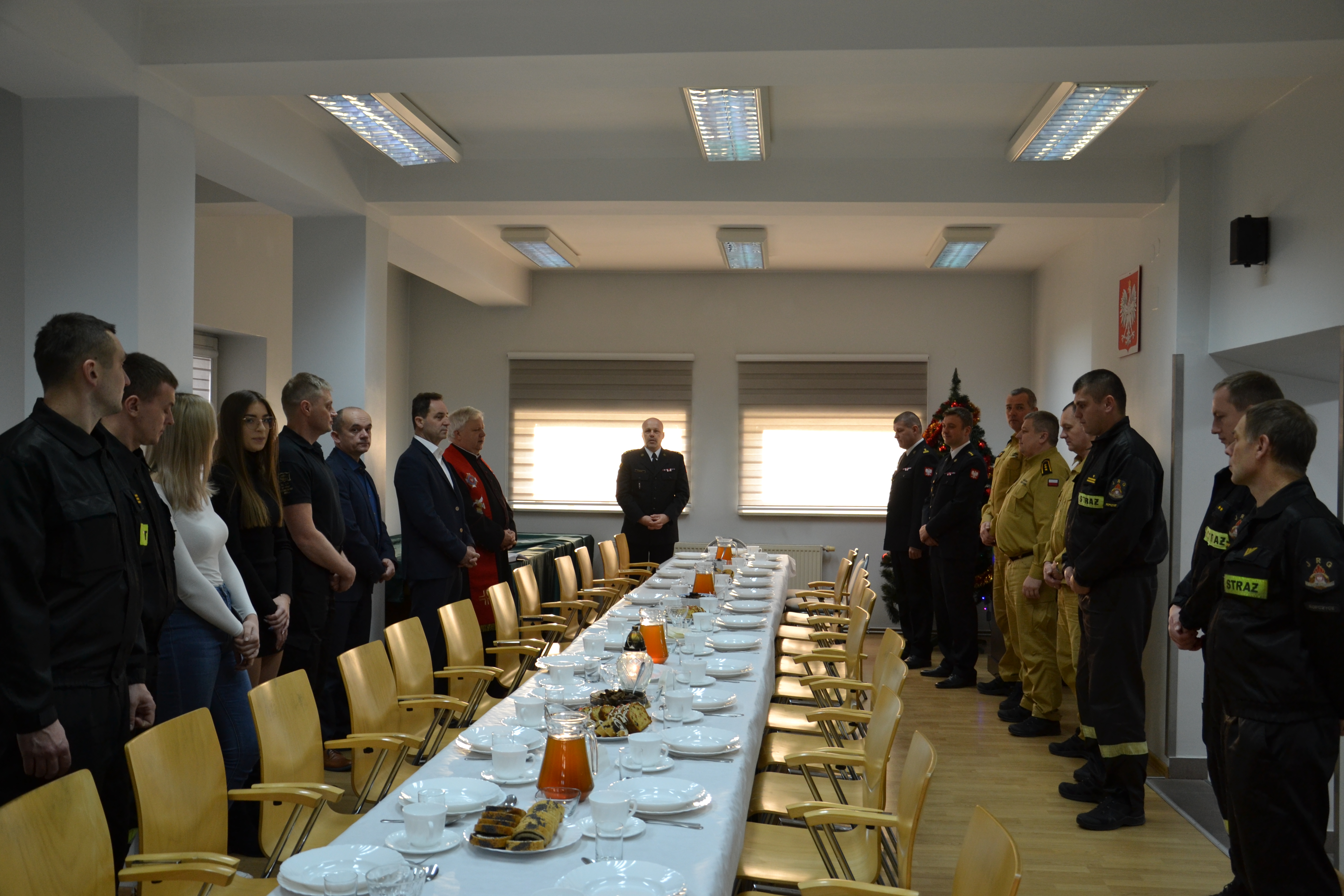 Opłatkowe spotkanie rozpoczął Zastępca Komendanta Powiatowego PSP st. bryg. Paweł Szkoła, który w imieniu komendanta powiatowego PSP oraz swoim przywitał gości oraz życzył wszystkim zgromadzonym zdrowych, spokojnych i spędzonym w rodzinnej atmosferze Świąt Bożego Narodzenia. Ks. kapelan Leopold Kordas przekazał Słowo Boże i pobłogosławił uczestników spotkania, a st. bryg. w st. sp. Janusz Piczak podziękował za dotychczas okazywaną przychylność i pomoc emerytom.