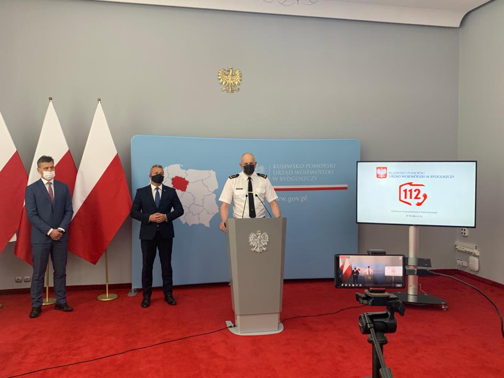 Konferencja prasowa z udziałem wojewody kujawsko-pomorskiego Mikołaja Bogdanowicza, Zastępcy Kujawsko-Pomorskiego Komendanta Wojewódzkiego PSP st. bryg. Sławomira Herbowskiego oraz Dyrektora Wydziału Bezpieczeństwa i Zarządzania Kryzysowego K-PUW w Bydgoszczy Rafała Rewolińskiego, rozpoczęła proces przejęcia rozmówców z numeru alarmowego 998 przez europejski numer ratowniczy 112.