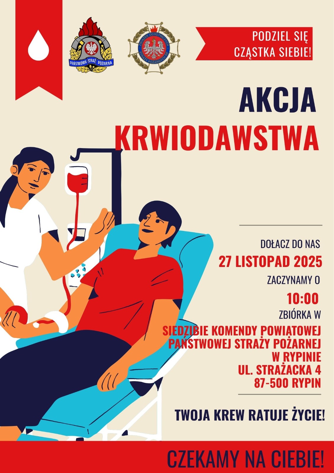 Akcja krwiodawstwa odbędzie się 27 listopada 2025 roku o godzinie 1000 w siedzibie Komendy Powiatowej PSP w Rypinie przy ul. Strażackiej 4. Zapraszamy funkcjonariuszy PSP, Policji i innych służb, druhny i druhów Ochotniczych Straży Pożarnych oraz pełnoletnich uczniów szkół średnich z powiatu rypińskiego. Dołącz do nas i pomóż potrzebującym – każda kropla krwi ma ogromne znaczenie.