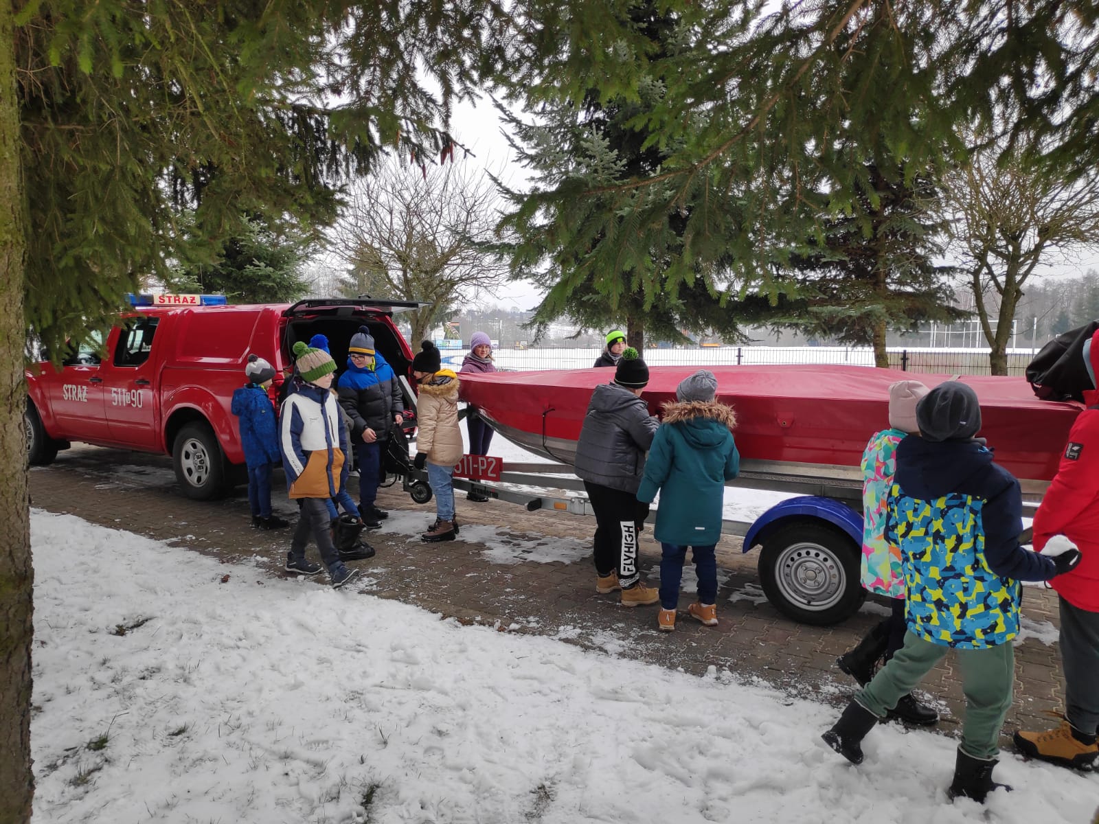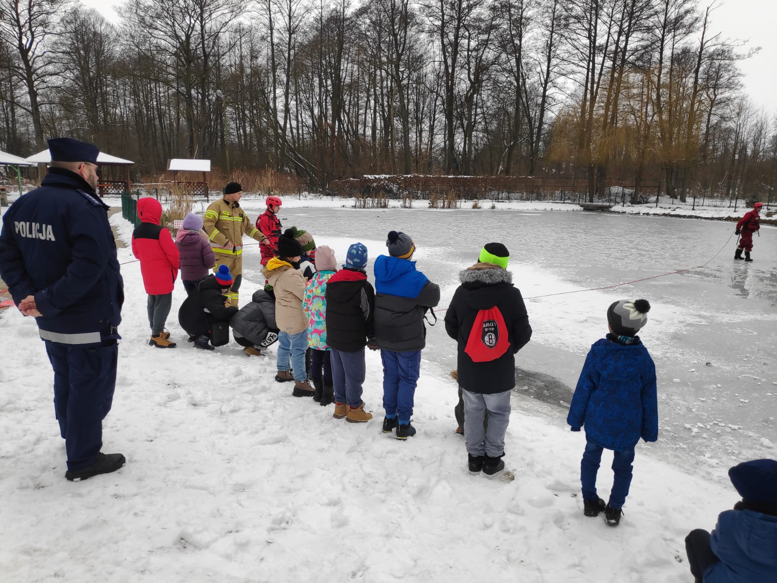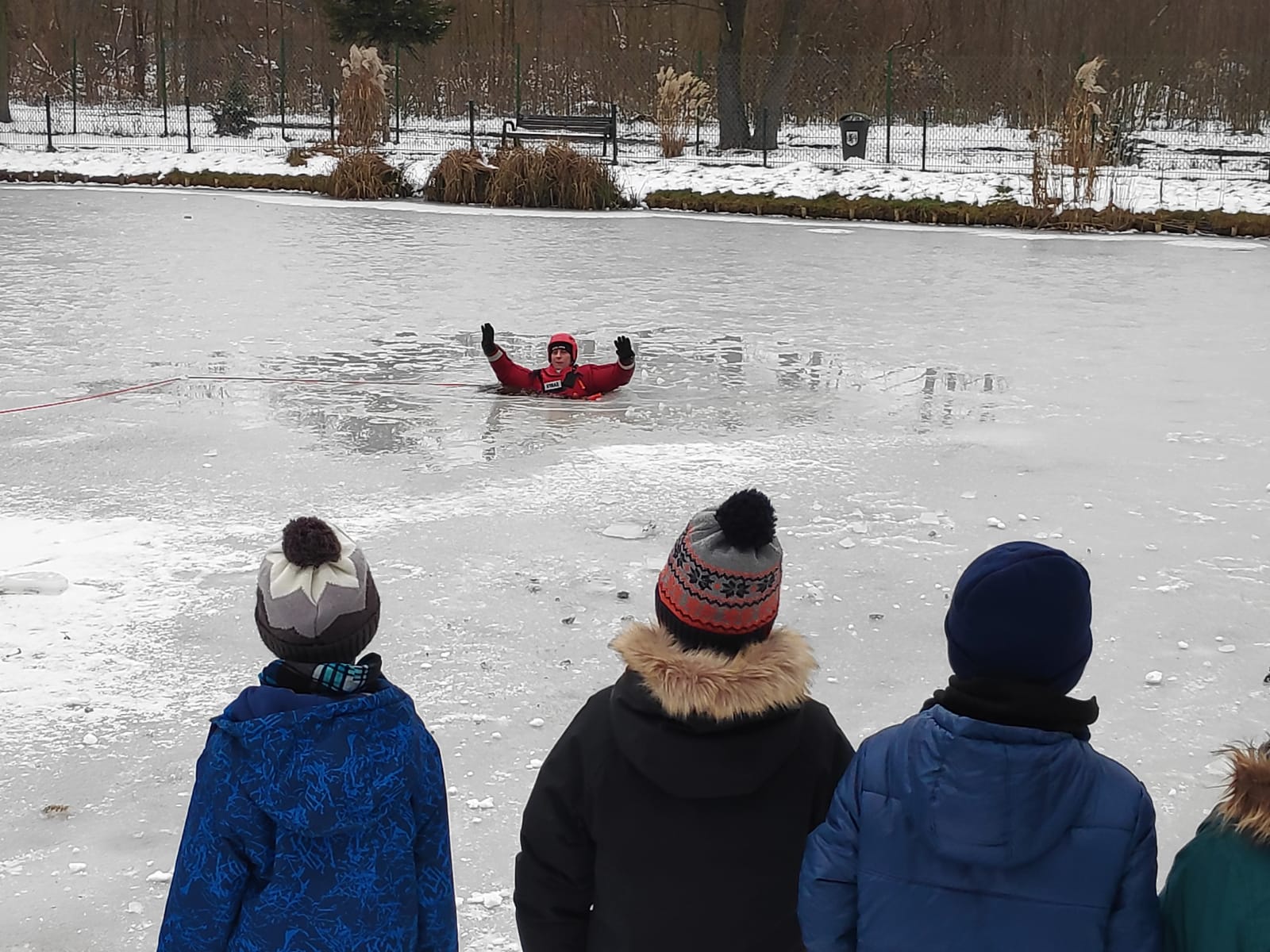 Na koniec strażacy przygotowali pokaz ratownictwa lodowego, który miał na celu zobrazowanie jak niebezpieczne jest wchodzenie na zamarznięte akweny wodne. Odpowiadali także na liczne pytania zadawane przez dzieci oraz pokazali posiadany sprzęt używany podczas działań na lodzie.