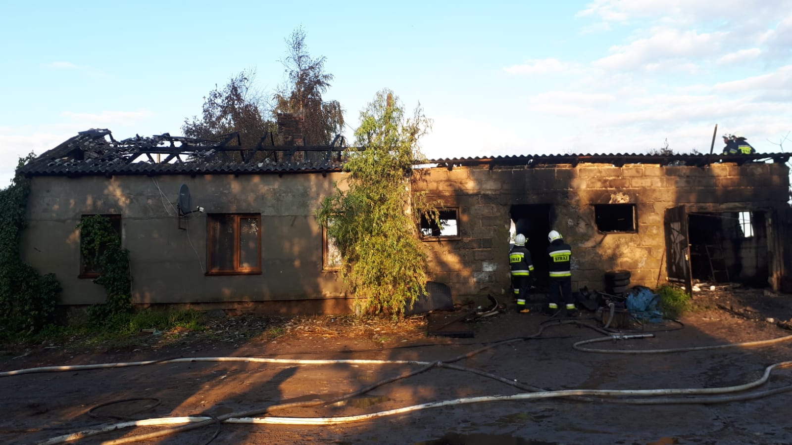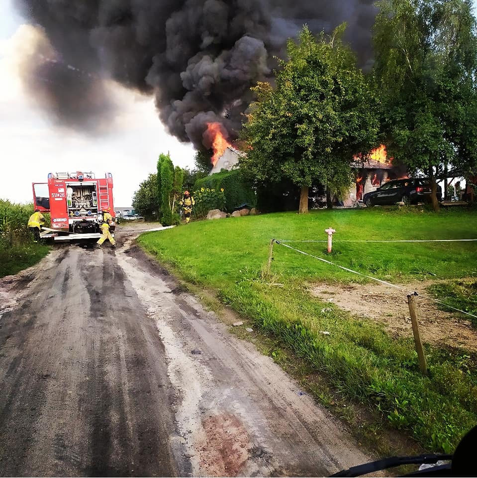 Po dojeździe na miejsce zdarzenia Kierujący Działaniem Ratowniczym w przeprowadzonym rozpoznaniu ustalił, że palą się dwa pomieszczenia garażowe sąsiadujące bezpośrednio z budynkiem mieszkalnym oraz dach tego budynku. Dodatkowo pożar stanowił zagrożenie dla znajdującego się w niewielkiej odległości budynku mieszkalnego. Brak osób poszkodowanych.