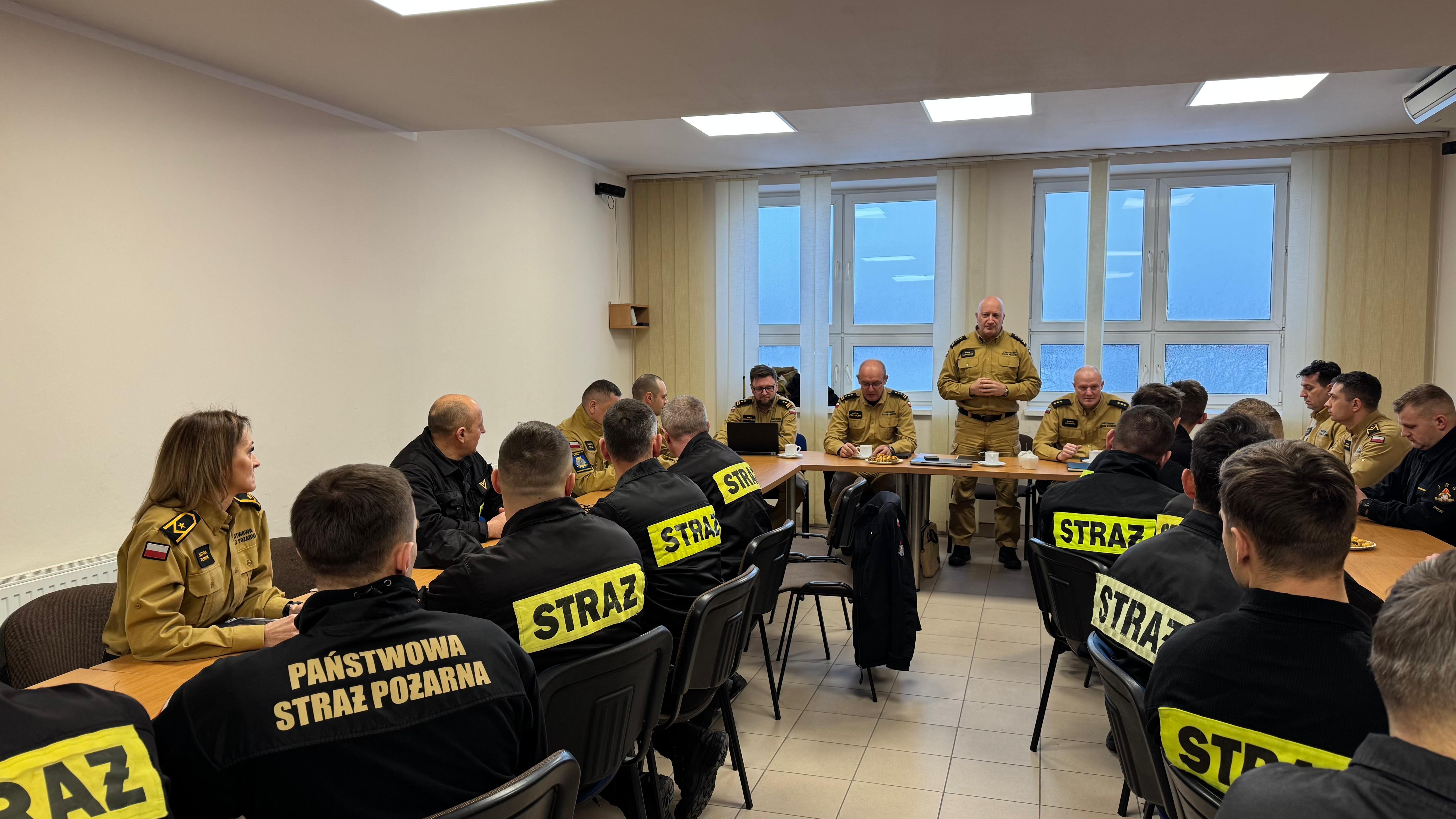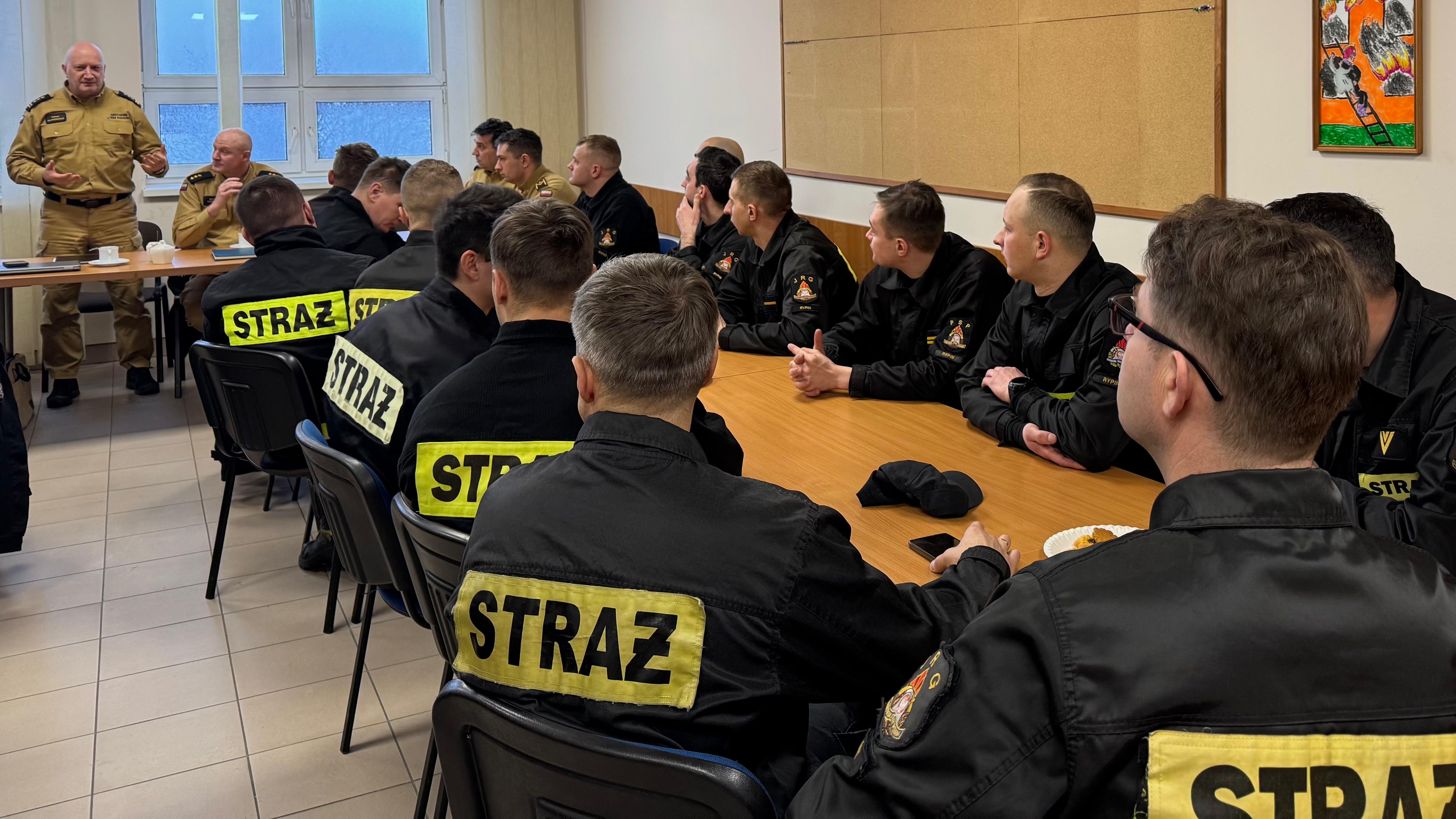 5 lutego 2026 r. w Komendzie Powiatowej Państwowej Straży Pożarnej w Rypinie odbyło się spotkanie z udziałem Kujawsko-Pomorskiego Komendanta Wojewódzkiego PSP st. bryg. Rafała Świechowicza, Zastępcy Kujawsko-Pomorskiego Komendanta Wojewódzkiego PSP st. bryg. Artura Przybylskiego oraz Naczelnika Wydziału Organizacji i Nadzoru bryg. Adama Kiełbasiewicza.