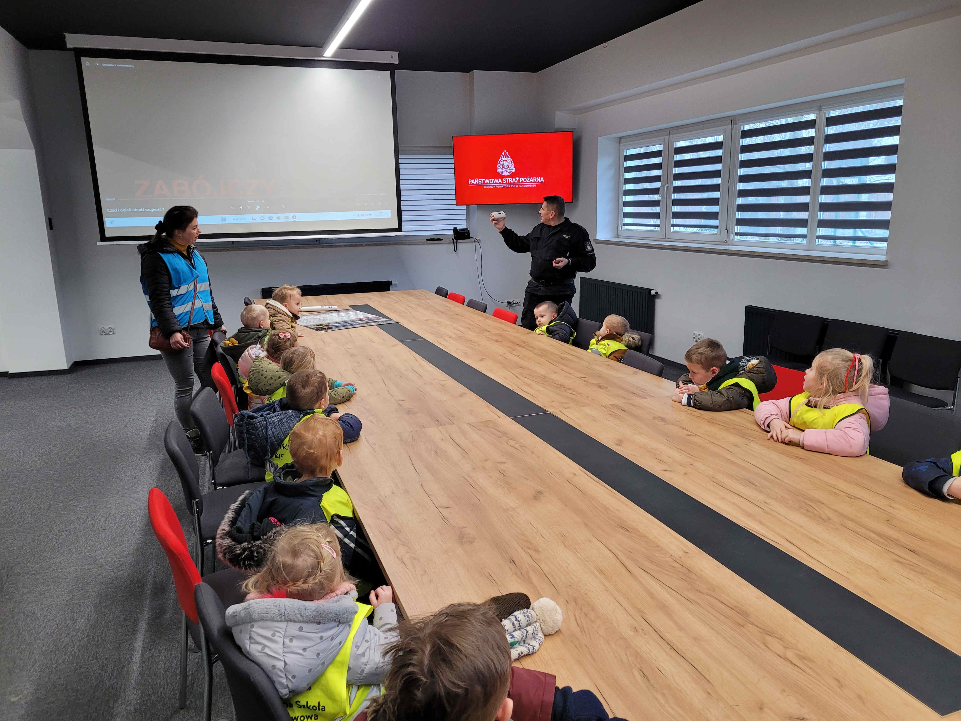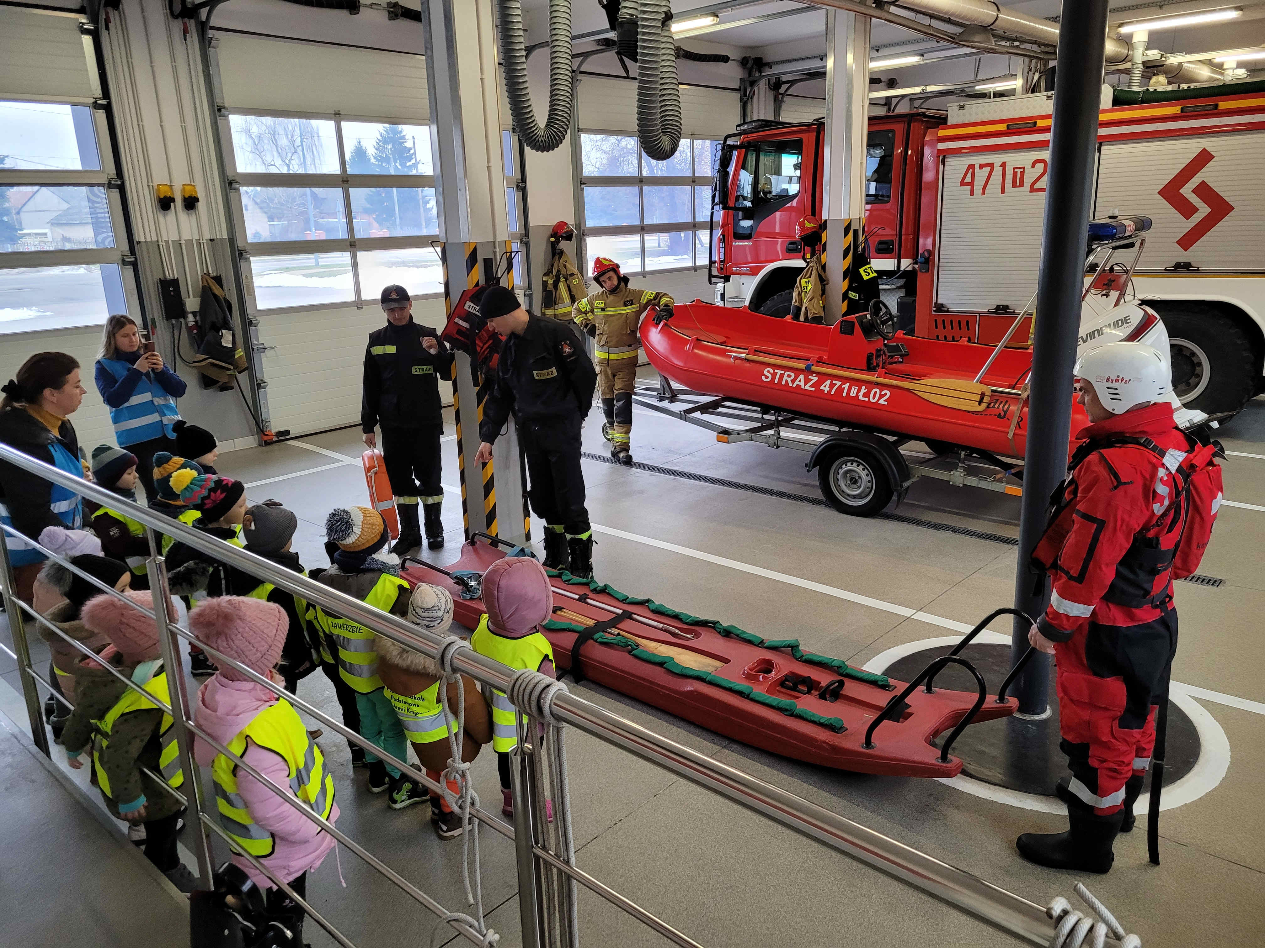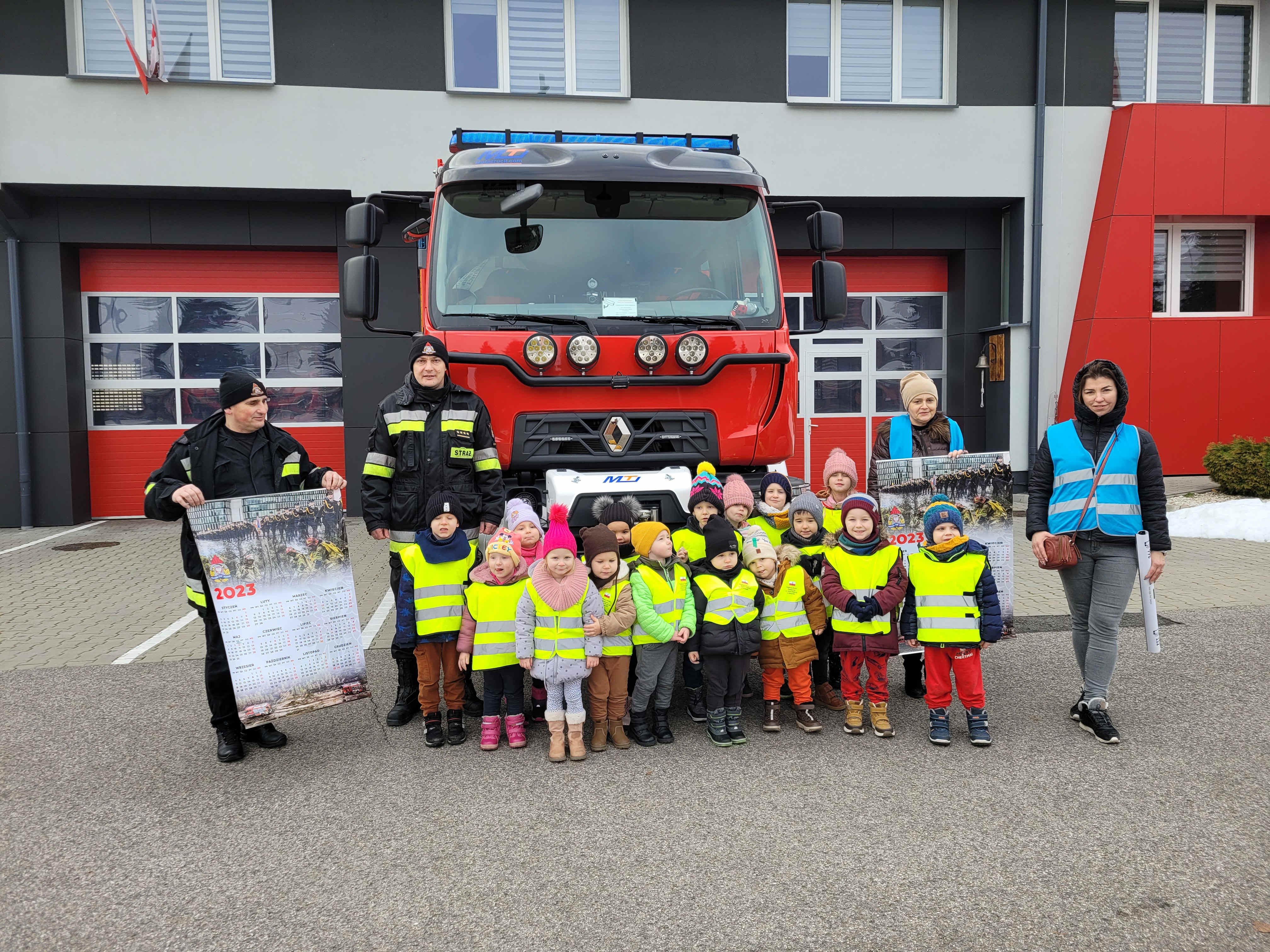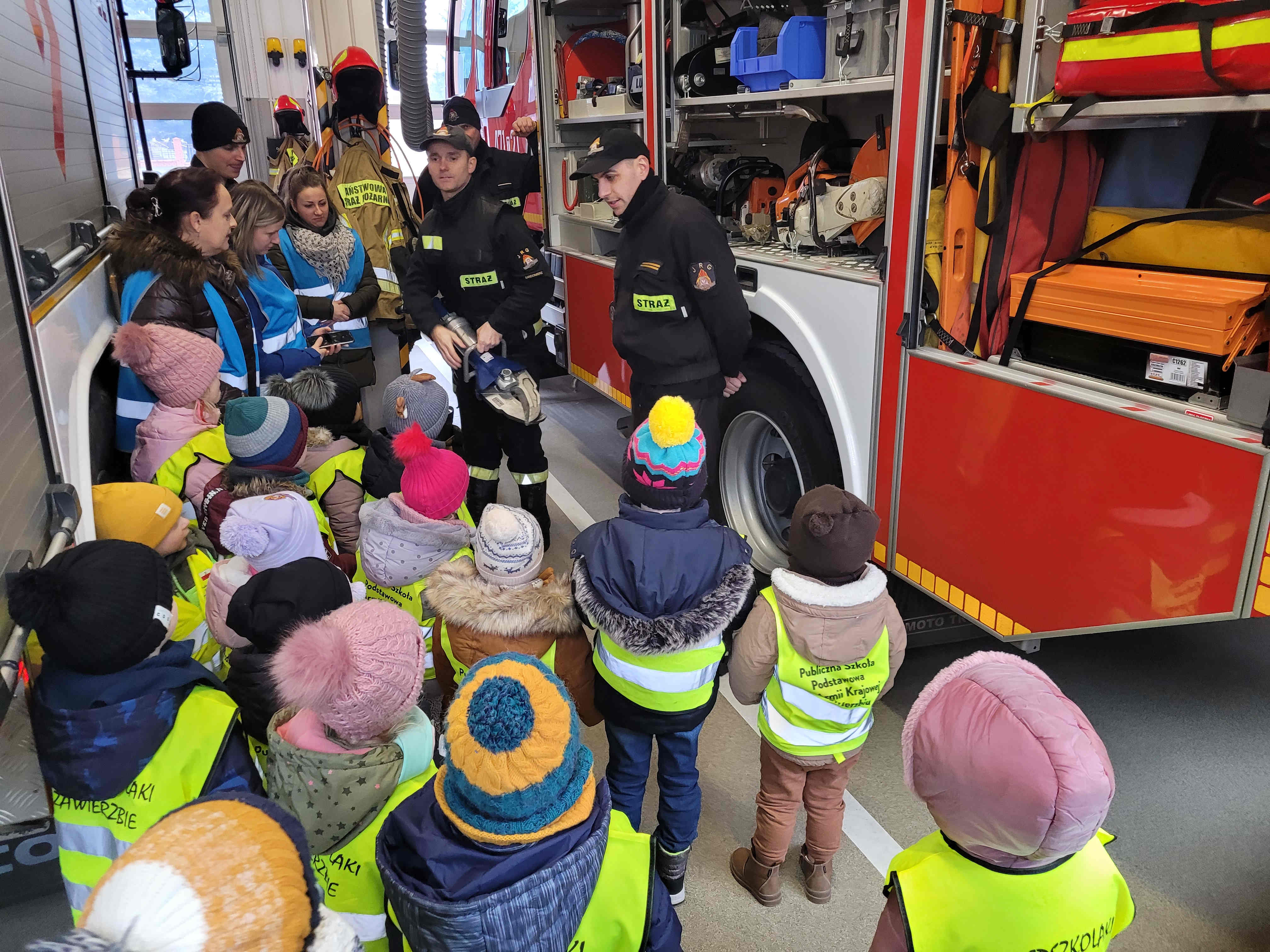 27 stycznia 2023 roku Komendę Powiatową Powiatowej Państwowej Straży Pożarnej w Sandomierzu odwiedziła grupa dzieci wraz z opiekunami z Przedszkola przy Publicznej Szkole Podstawowej im. Armii Krajowej w Zawierzbiu. Odwiedziny były dobrą okazją do omówienia przez strażaków zagrożeń podczas zaczynających się Ferii 2023. W ramach akcji „Bezpieczne ferie 2023” strażacy przypomnieli zasady bezpiecznego wypoczynku w okresie zimowym na zalodzonych akwenach wodnych, zasady zgłaszania zdarzeń na numer alarmowy 112 i w jaki sposób bezpiecznie reagować w przypadku sytuacji gdy jesteśmy świadkami takiego zdarzenia. W dalszej części spotkania strażacy omówili zagadnienia związane z kampanią „Czujka Na Straży Twojego Bezpieczeństwa” oraz rozdali ulotki informacyjne. Na zakończenie spotkania dzieci otrzymały strażacki kalendarz na bieżący rok oraz zapoznały się z wyposażeniem, jakim dysponują strażacy podczas swojej pracy.