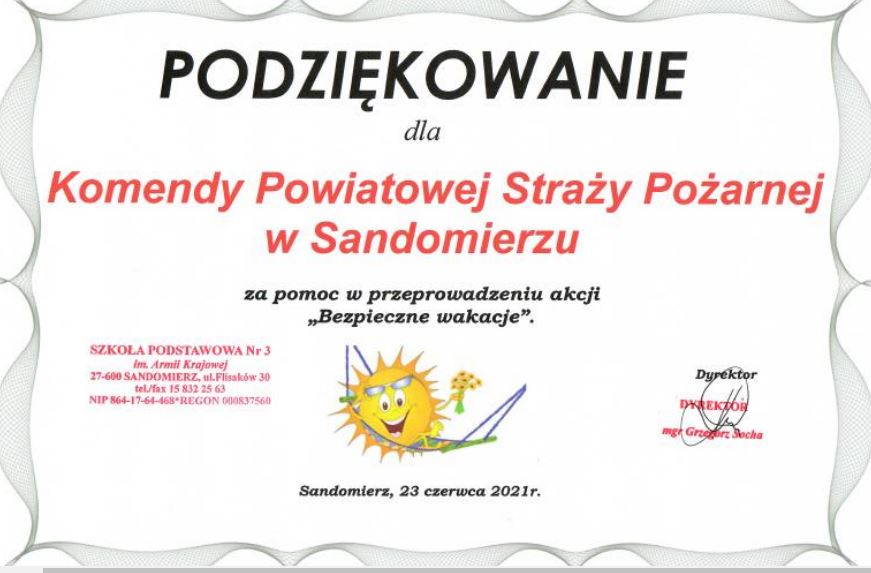 23 czerwca 2021 r. w ramach przedwakacyjnego cyklu spotkań z dziećmi i młodzieżą strażacy Komendy Powiatowej Państwowej Straży Pożarnej w Sandomierzu odwiedzili uczniów Szkoły Podstawowej Nr 3 w Sandomierzu.