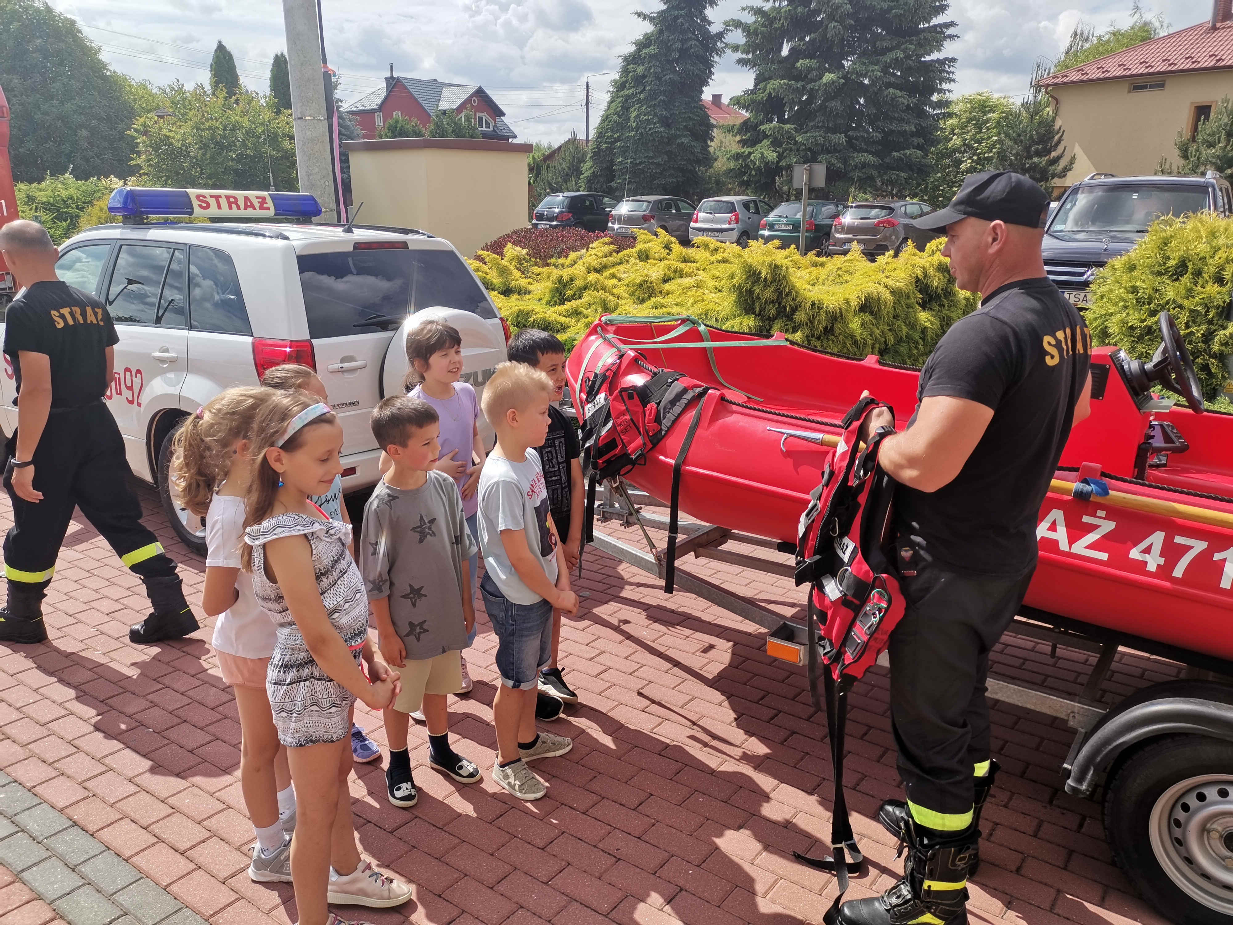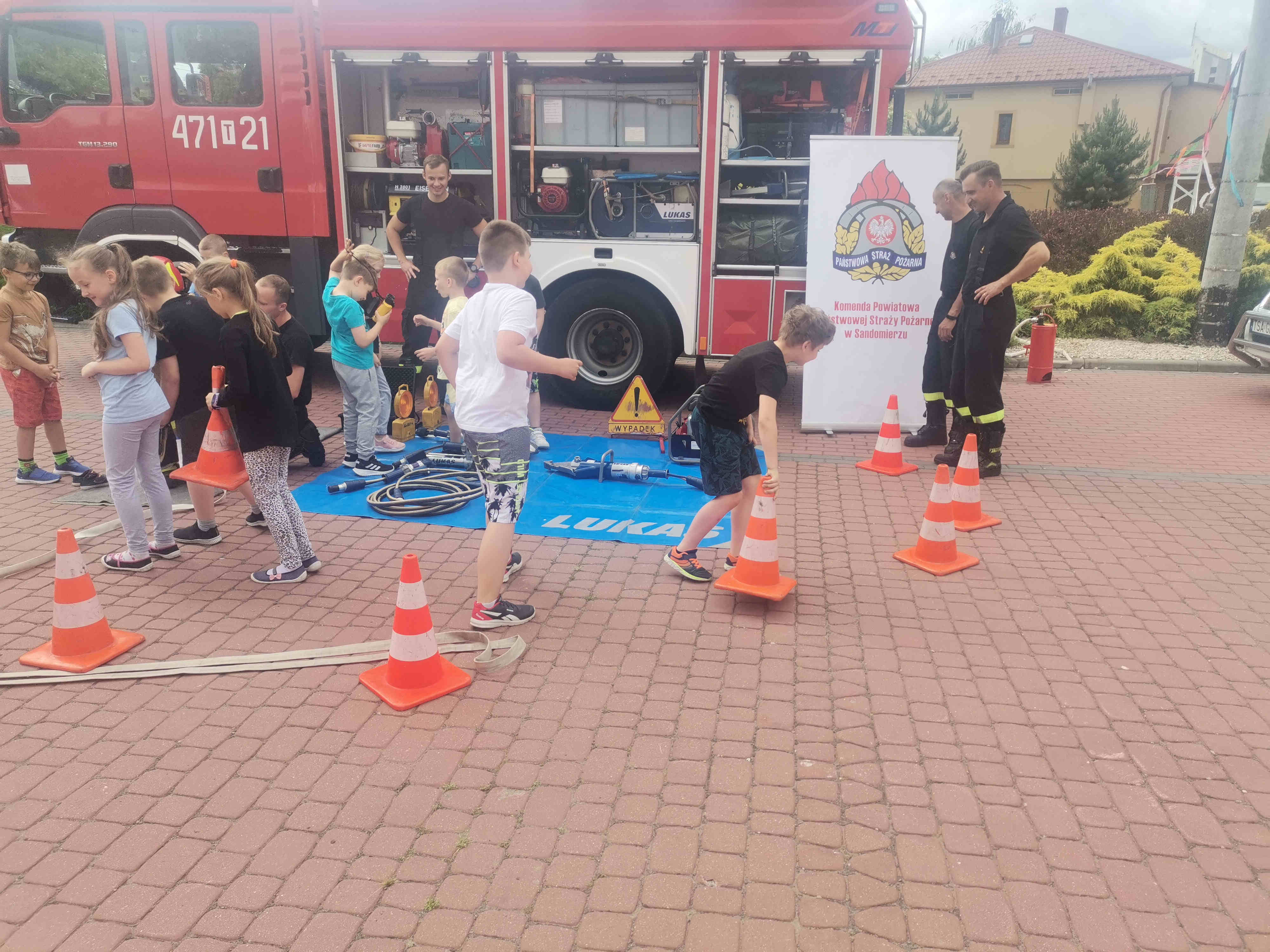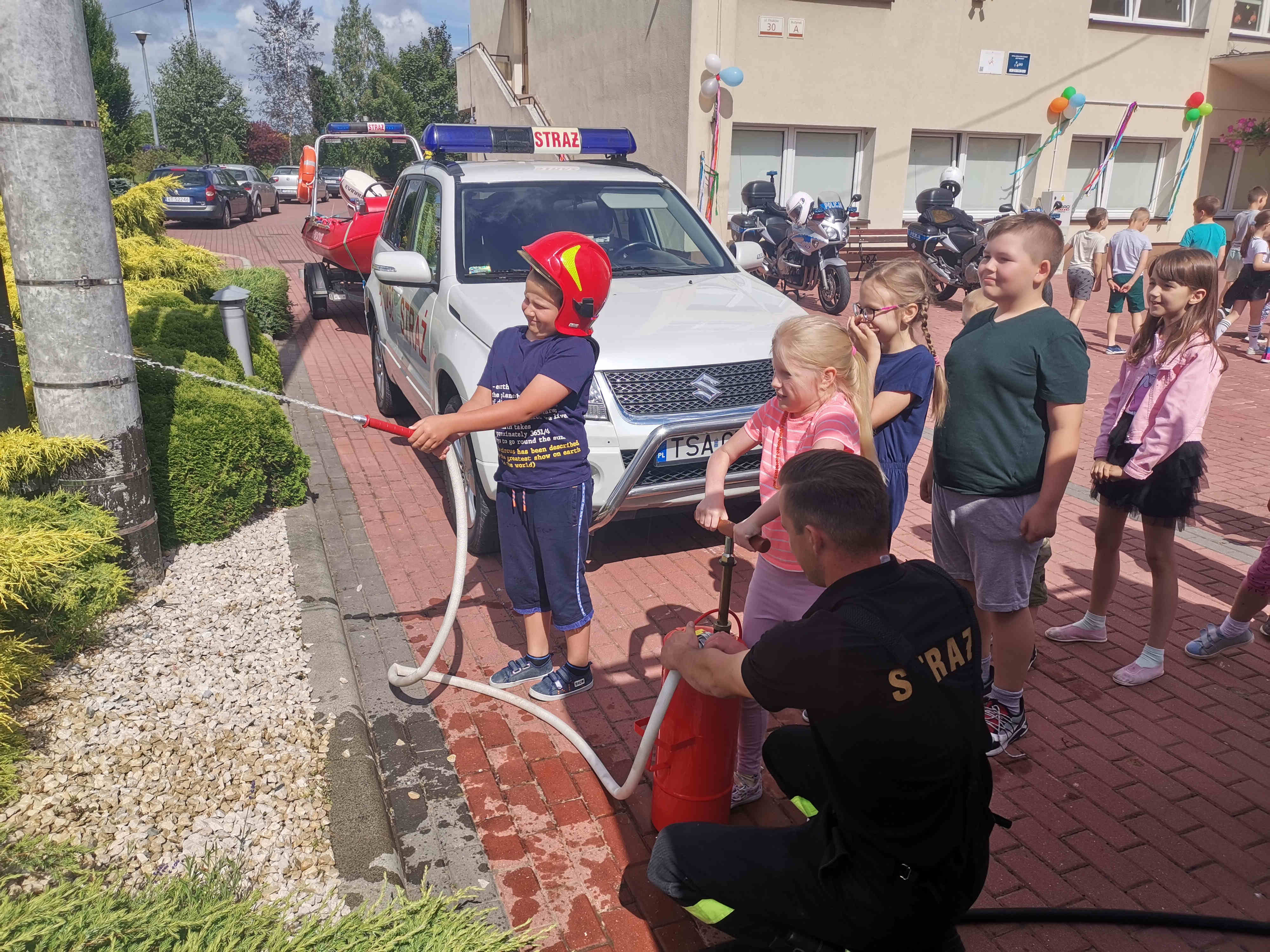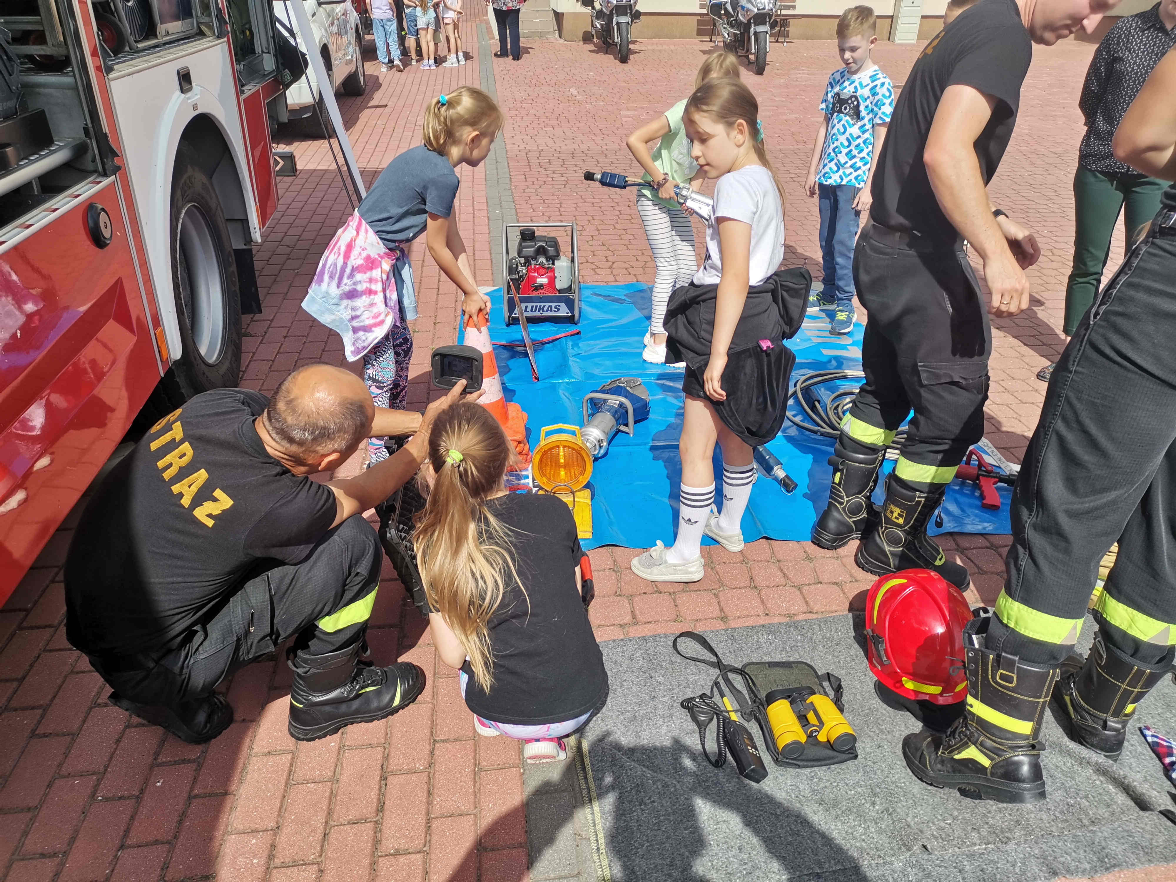 Jak zawsze największe zainteresowanie wzbudził samochód strażacki. Dzieci mogły z bliska obejrzeć i zapoznać się z wyposażeniem, jakim dysponują podczas swojej pracy strażacy. Najmłodsi mogli poczuć się jak strażacy, przymierzając hełm strażacki i umundurowanie oraz gasząc „pożar” przy pomocy hydronetki.