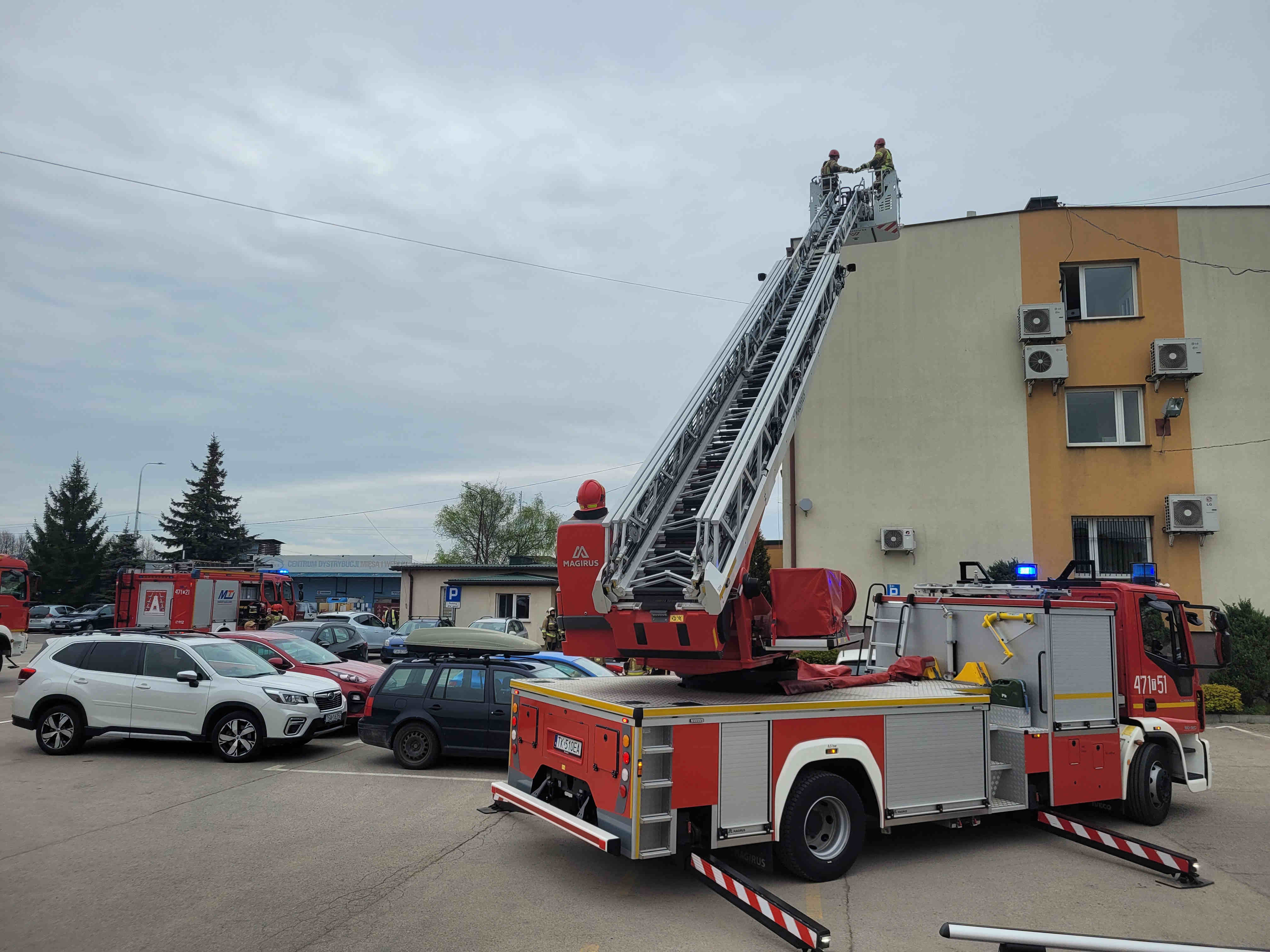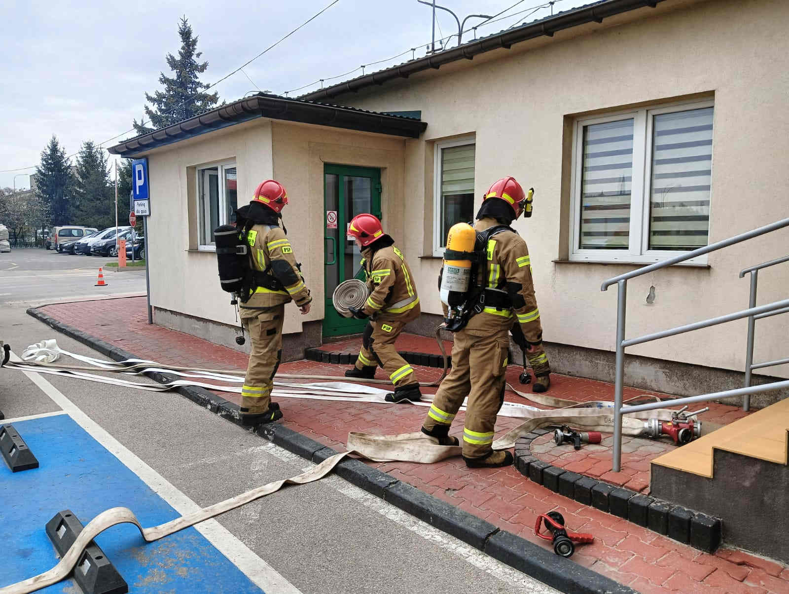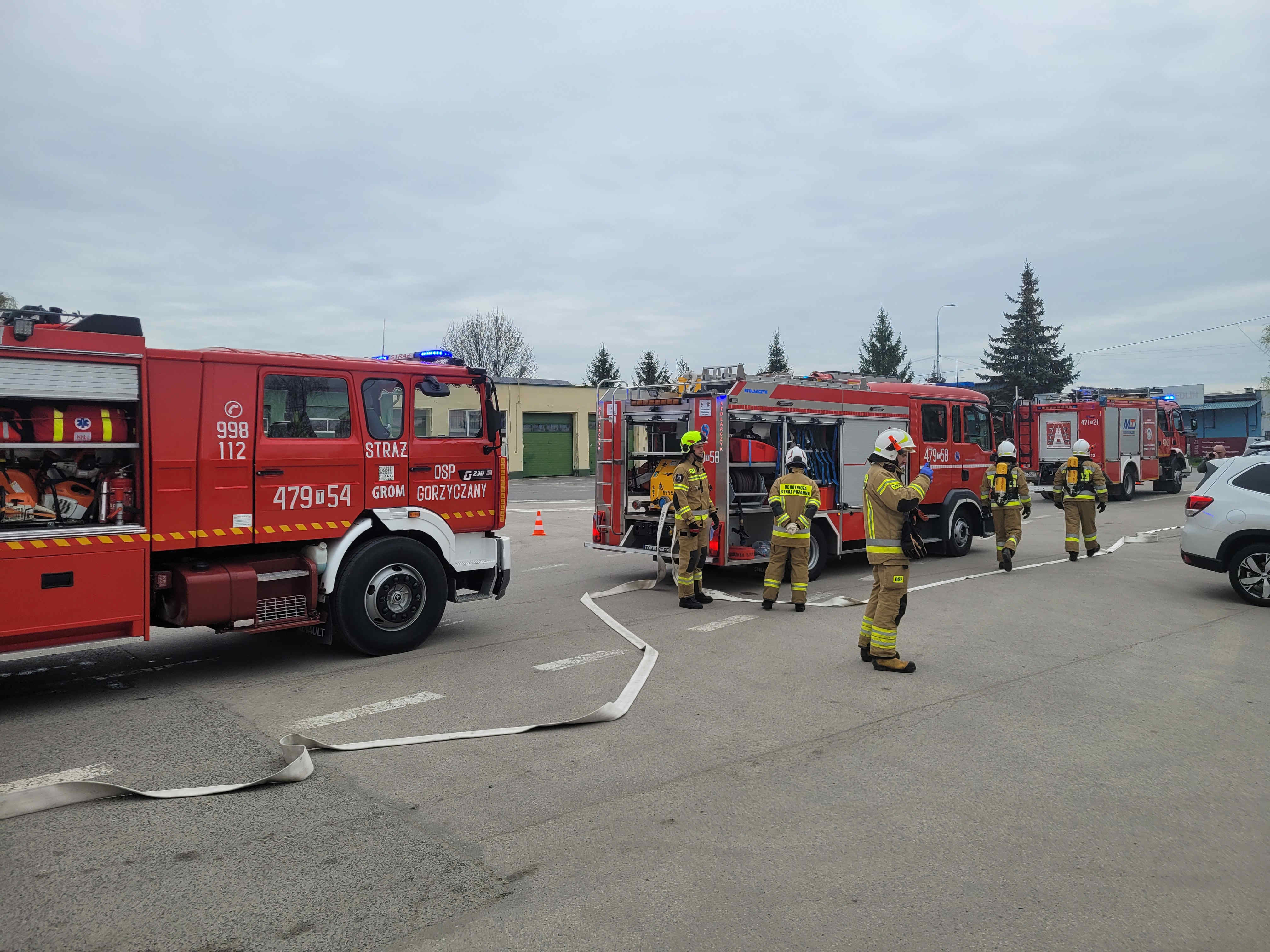 W dniu 15 kwietnia 2025r. w Przedsiębiorstwie Gospodarki Komunalnej i Mieszkaniowej w Sandomierzu na ulicy Przemysłowej odbyły się ćwiczenia w ramach doskonalenia zawodowego dla strażaków z Komendy Powiatowej PSP w Sandomierzu i strażaków z jednostek OSP Obrazów i OSP Gorzyczany. Tematem ćwiczeń były działania ratowniczo – gaśnicze na obiekcie budynku administracyjnego PGKiM, w którym doszło do pożaru i została poszkodowana jedna osoba. Podczas ćwiczeń strażacy doskonalili prowadzenie działań ratowniczo – gaśniczych wewnątrz obiektów i gaszenie pożarów wewnętrznych. Strażacy zabezpieczeni w sprzęt ochrony układu oddechowego podali prądy wody na palące się pomieszczenie oraz ewakuowali poszkodowaną osobę, której udzieli pierwszej pomocy przedmedycznej. Podczas ćwiczeń została przeprowadzona próbna ewakuacja podczas, której sprawdzono współpracę pomiędzy zastępami straży pożarnej a dyrekcją i pracownikami zakładu w zakresie ewakuacji. W dalszej części ćwiczeń strażacy zostali zapoznali się rozkładem pomieszczeń, umiejscowieniem przeciwpożarowych wyłączników prądu, gazu, hydrantów zewnętrznych oraz z systemami przeciwpożarowymi.