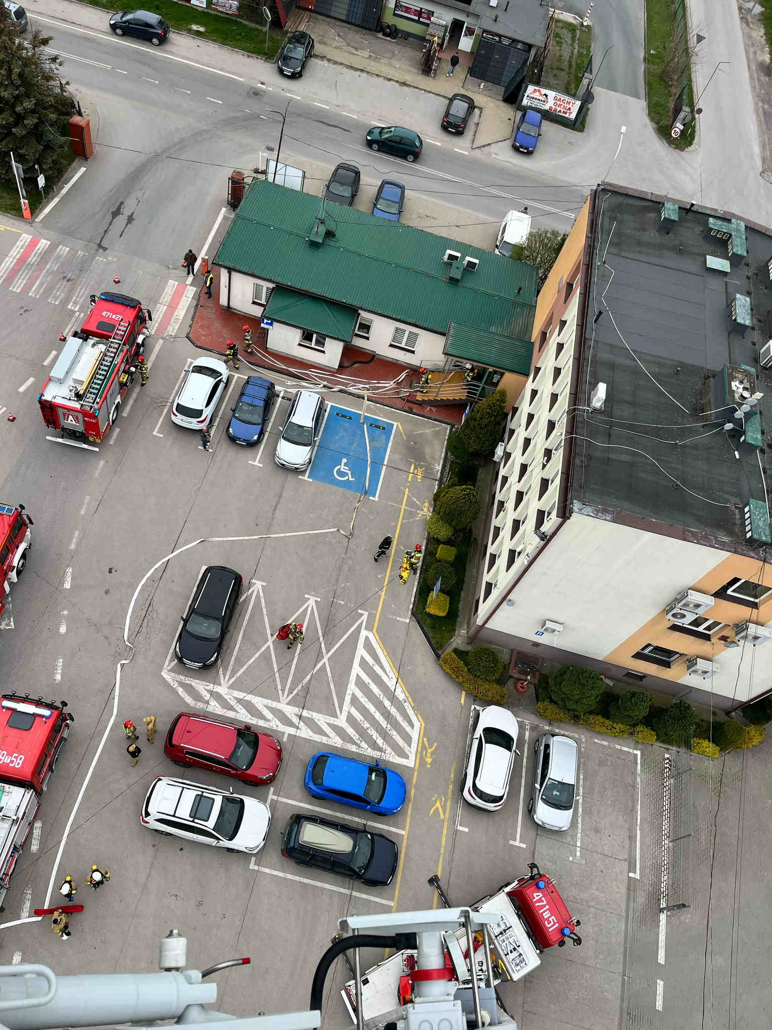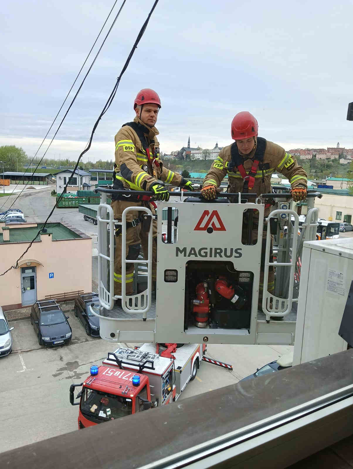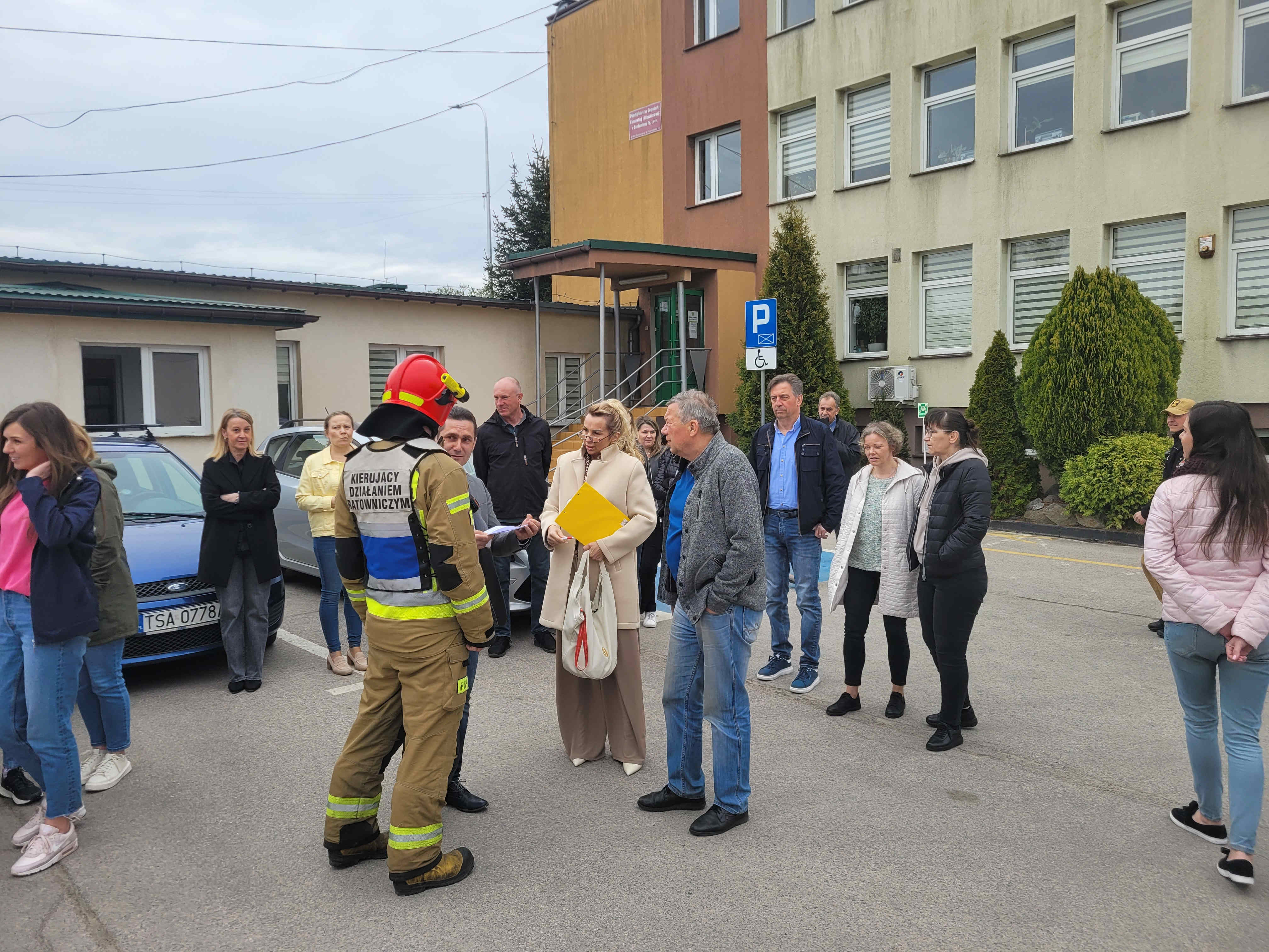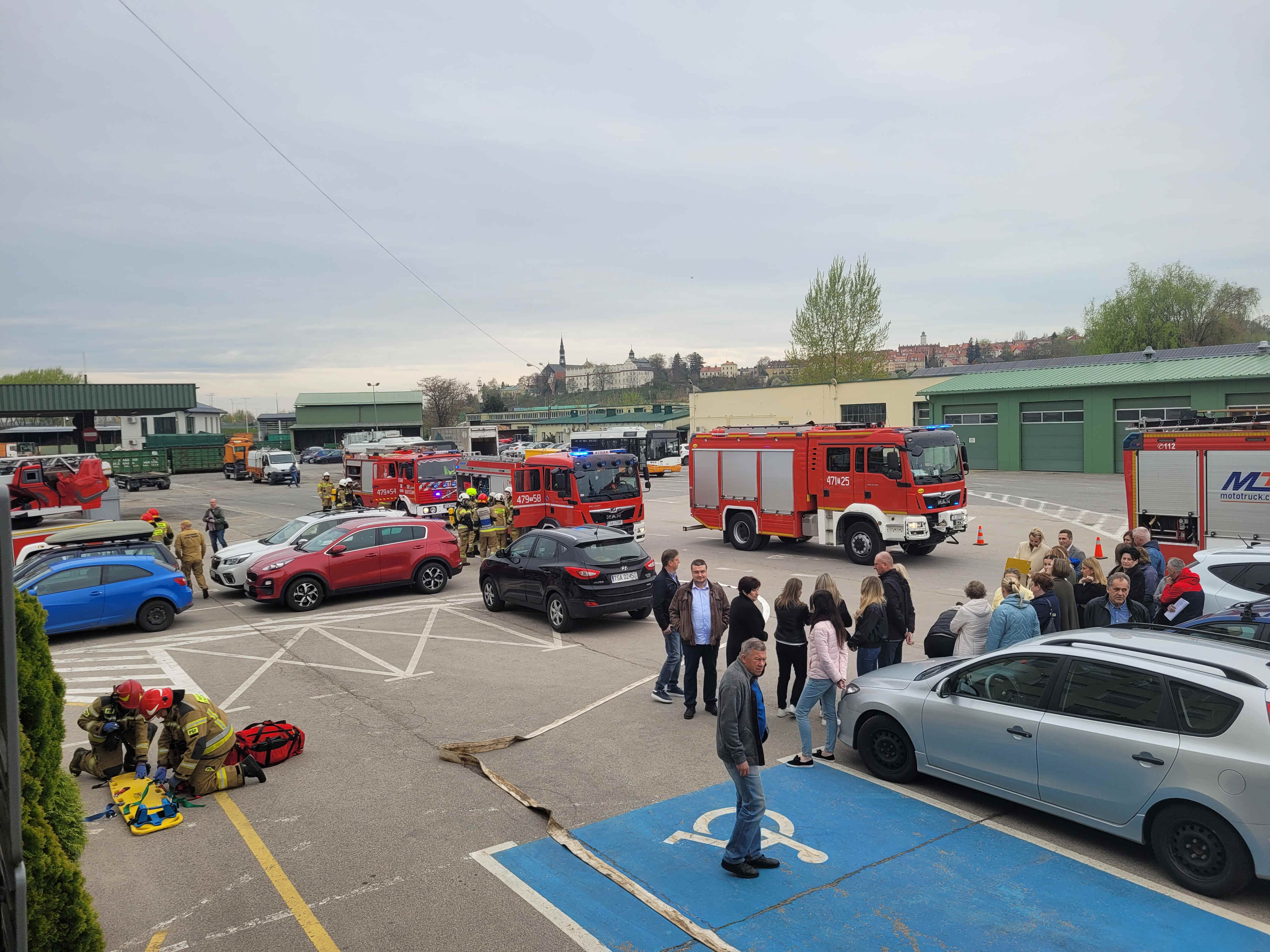 W dniu 15 kwietnia 2025r. w Przedsiębiorstwie Gospodarki Komunalnej i Mieszkaniowej w Sandomierzu na ulicy Przemysłowej odbyły się ćwiczenia w ramach doskonalenia zawodowego dla strażaków z Komendy Powiatowej PSP w Sandomierzu i strażaków z jednostek OSP Obrazów i OSP Gorzyczany. Tematem ćwiczeń były działania ratowniczo – gaśnicze na obiekcie budynku administracyjnego PGKiM, w którym doszło do pożaru i została poszkodowana jedna osoba. Podczas ćwiczeń strażacy doskonalili prowadzenie działań ratowniczo – gaśniczych wewnątrz obiektów i gaszenie pożarów wewnętrznych. Strażacy zabezpieczeni w sprzęt ochrony układu oddechowego podali prądy wody na palące się pomieszczenie oraz ewakuowali poszkodowaną osobę, której udzieli pierwszej pomocy przedmedycznej. Podczas ćwiczeń została przeprowadzona próbna ewakuacja podczas, której sprawdzono współpracę pomiędzy zastępami straży pożarnej a dyrekcją i pracownikami zakładu w zakresie ewakuacji. W dalszej części ćwiczeń strażacy zostali zapoznali się rozkładem pomieszczeń, umiejscowieniem przeciwpożarowych wyłączników prądu, gazu, hydrantów zewnętrznych oraz z systemami przeciwpożarowymi.