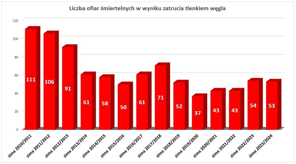 Od 1 stycznia do 2 października 2024 roku strażacy brali udział w 3237 interwencjach związanych z emisją tlenku węgla, w wyniku których 861 osób uległo podtruciu, niestety 26 osób straciło życie. W porównaniu do analogicznego czasu rok do roku, w 202 4ku strażacy odnotowali 27 interwencji mniej (3264), 78 osób mniej uległo podtruciu (939) oraz odnotowano o siedem ofiar śmiertelnego zatrucia tlenkiem węgla mniej (33).