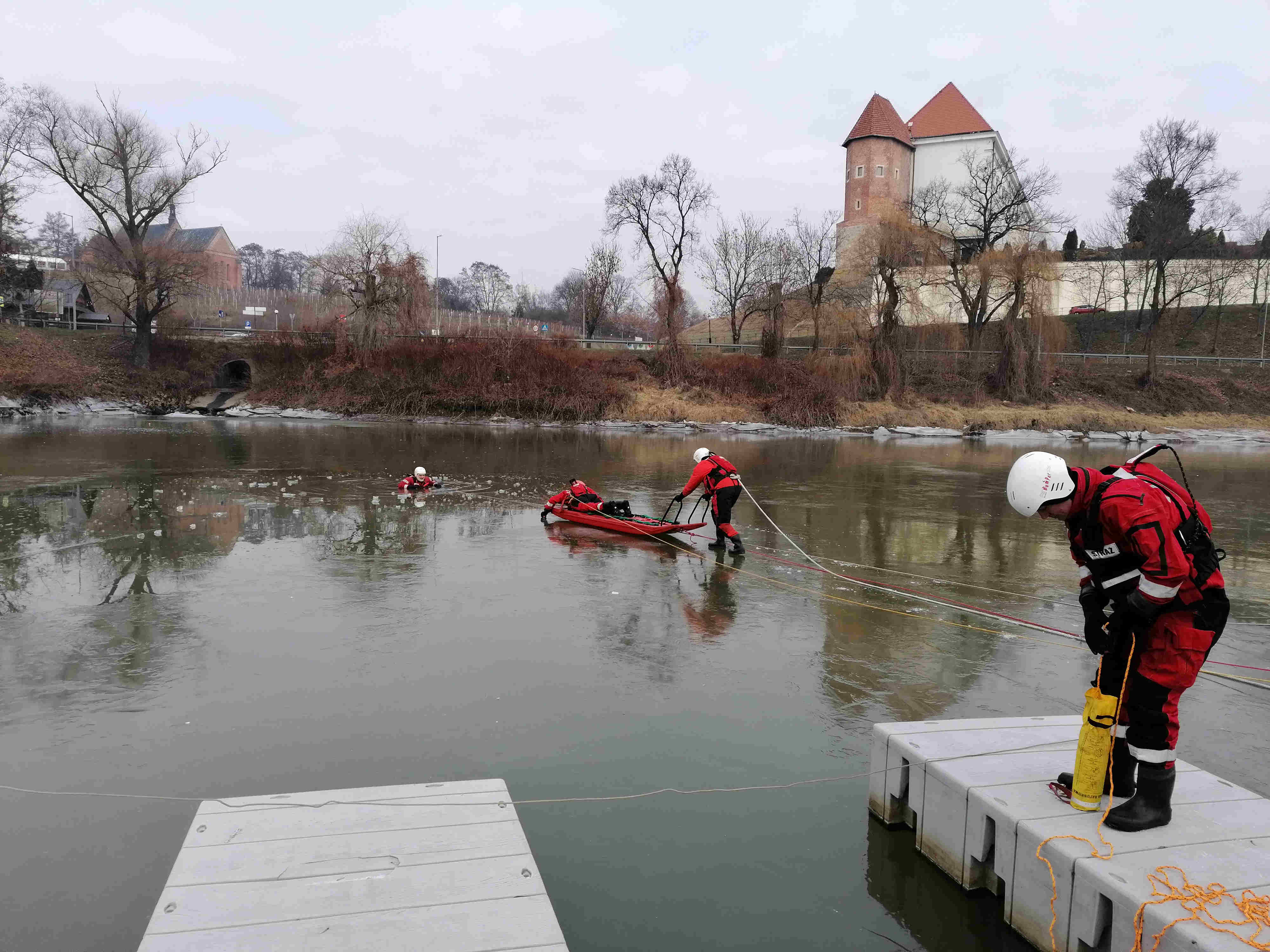 Doskonalenie sandomierskich strażaków na zamarzniętych akwenach wodnych