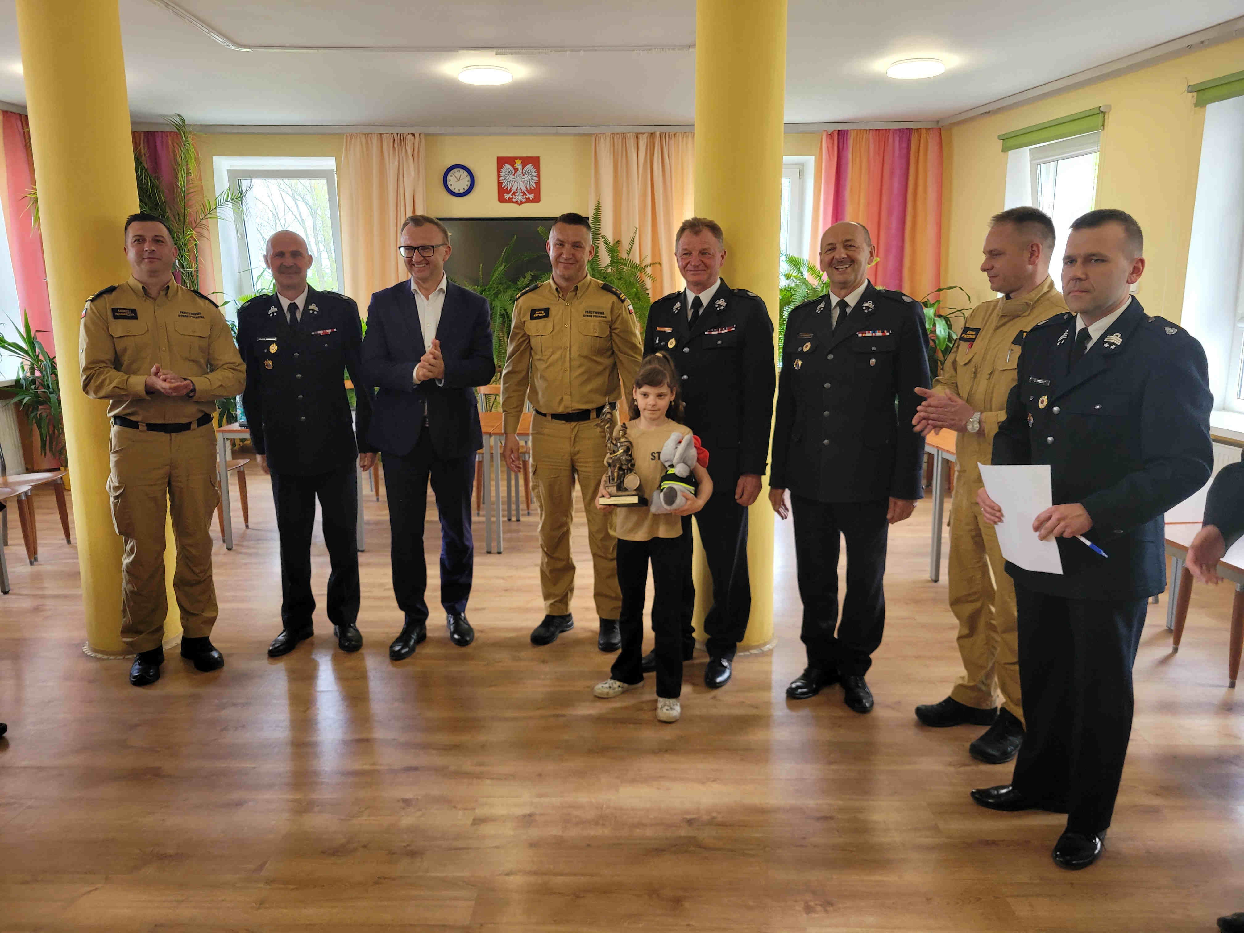 Komendant Powiatowy PSP w Sandomierzu bryg. Piotr Krytusa wręczył pamiątkową statuetkę św. Floriana dla najmłodszej uczestniczki turnieju Nadii Staszczak ze Szkoły Podstawowej im. Stefana Żeromskiego w Niedźwicach.