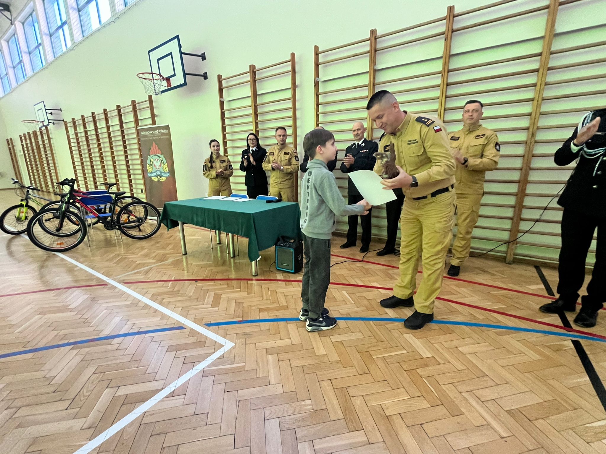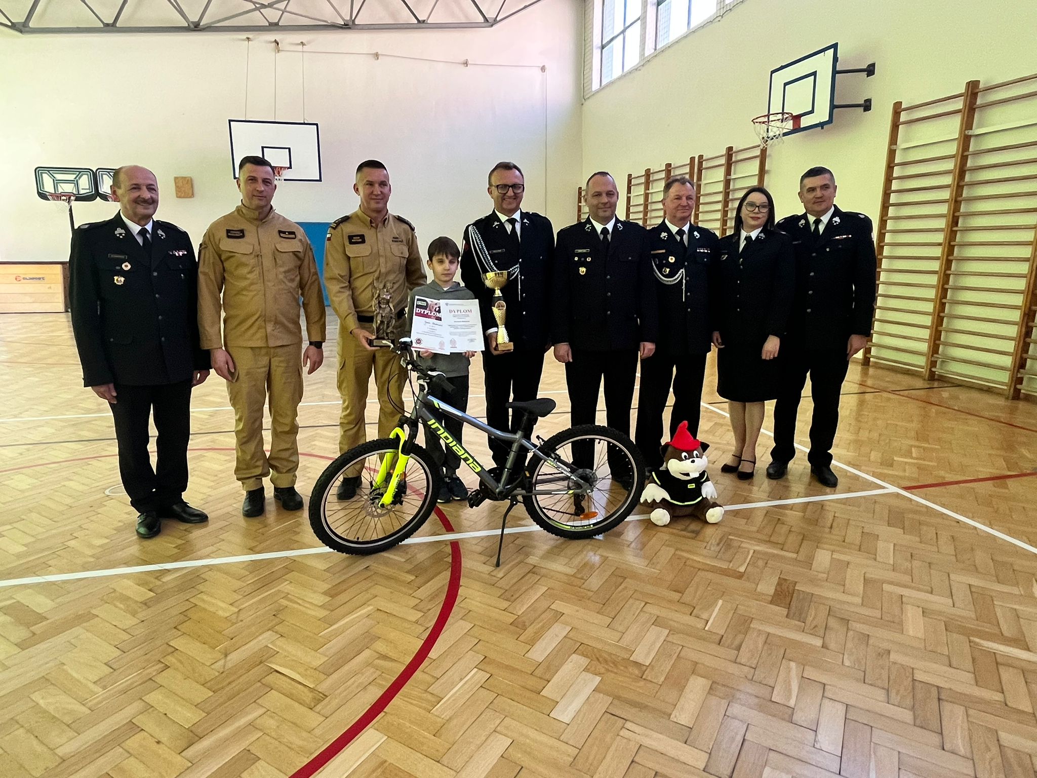Komendant Powiatowy PSP w Sandomierzu bryg. Piotr Krytusa wręczył pamiątkową statuetkę św. Floriana dla najmłodszego uczestnika turnieju Jakuba Słodownik z Publicznej Szkoły Podstawowej w Obrazowie.
