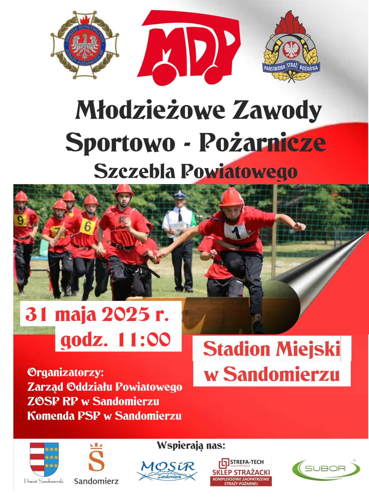 Komenda Powiatowa Państwowej Straży Pożarnej w Sandomierzu wraz z Zarządem Powiatowym Ochotniczych Straży Pożarnych serdecznie zaprasza mieszkańców powiatu sandomierskiego na Młodzieżowe Zawody Sportowo – Pożarnicze Szczebla Powiatowego, które odbędą się 31 maja 2025 r. na Miejskim Stadionie Sportowym w Sandomierzu przy ul. Romana Kosteły 3a.