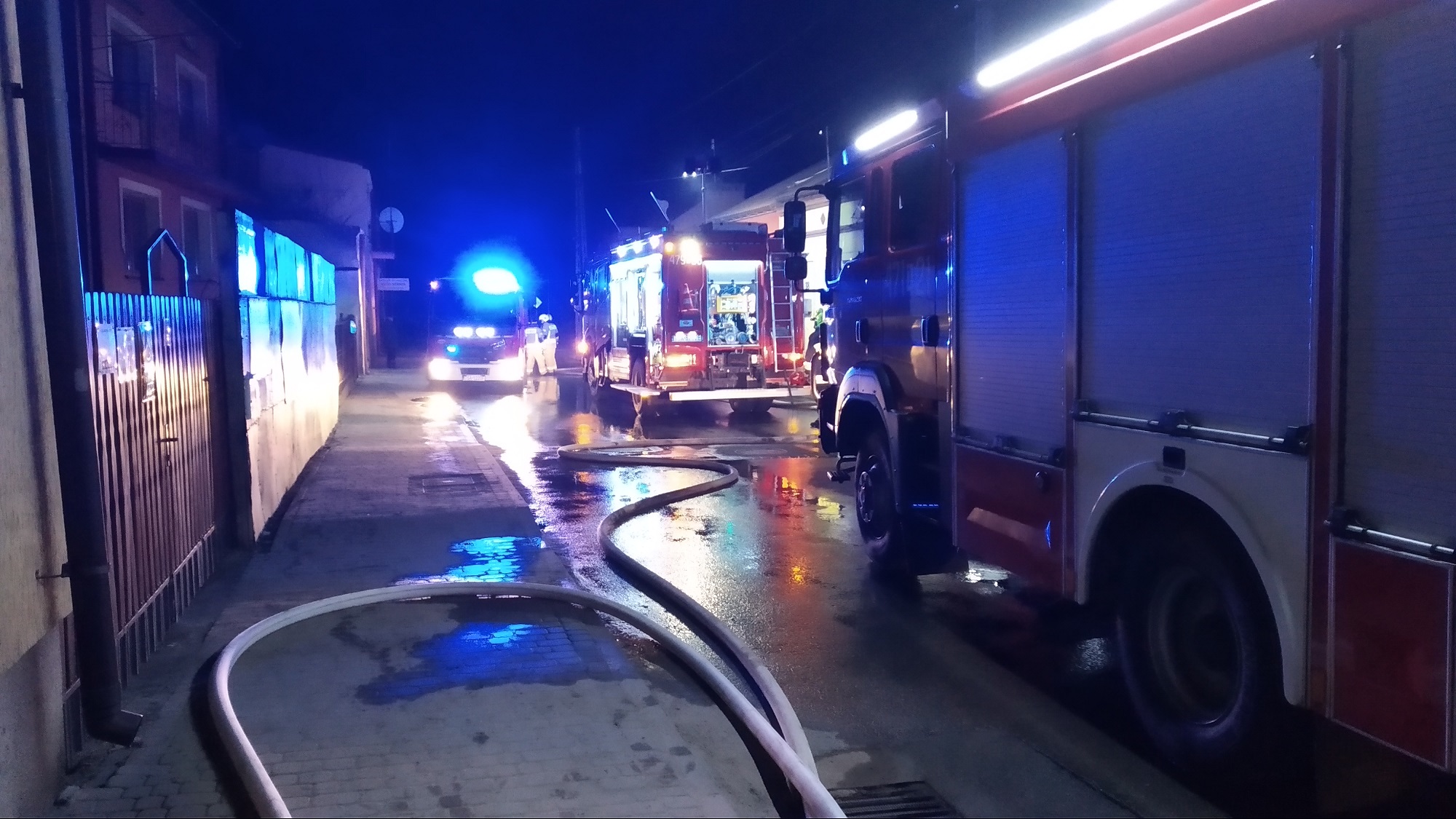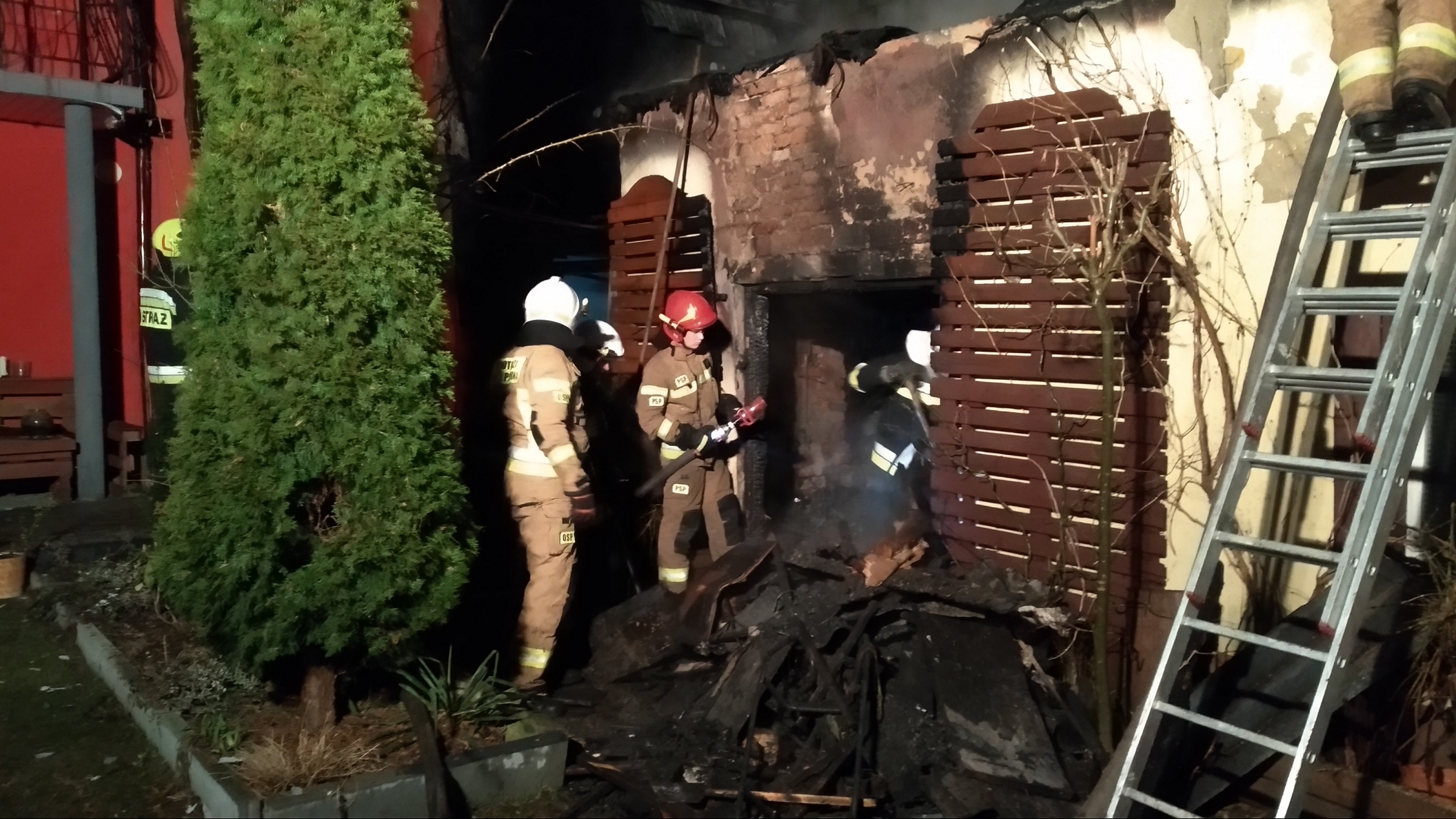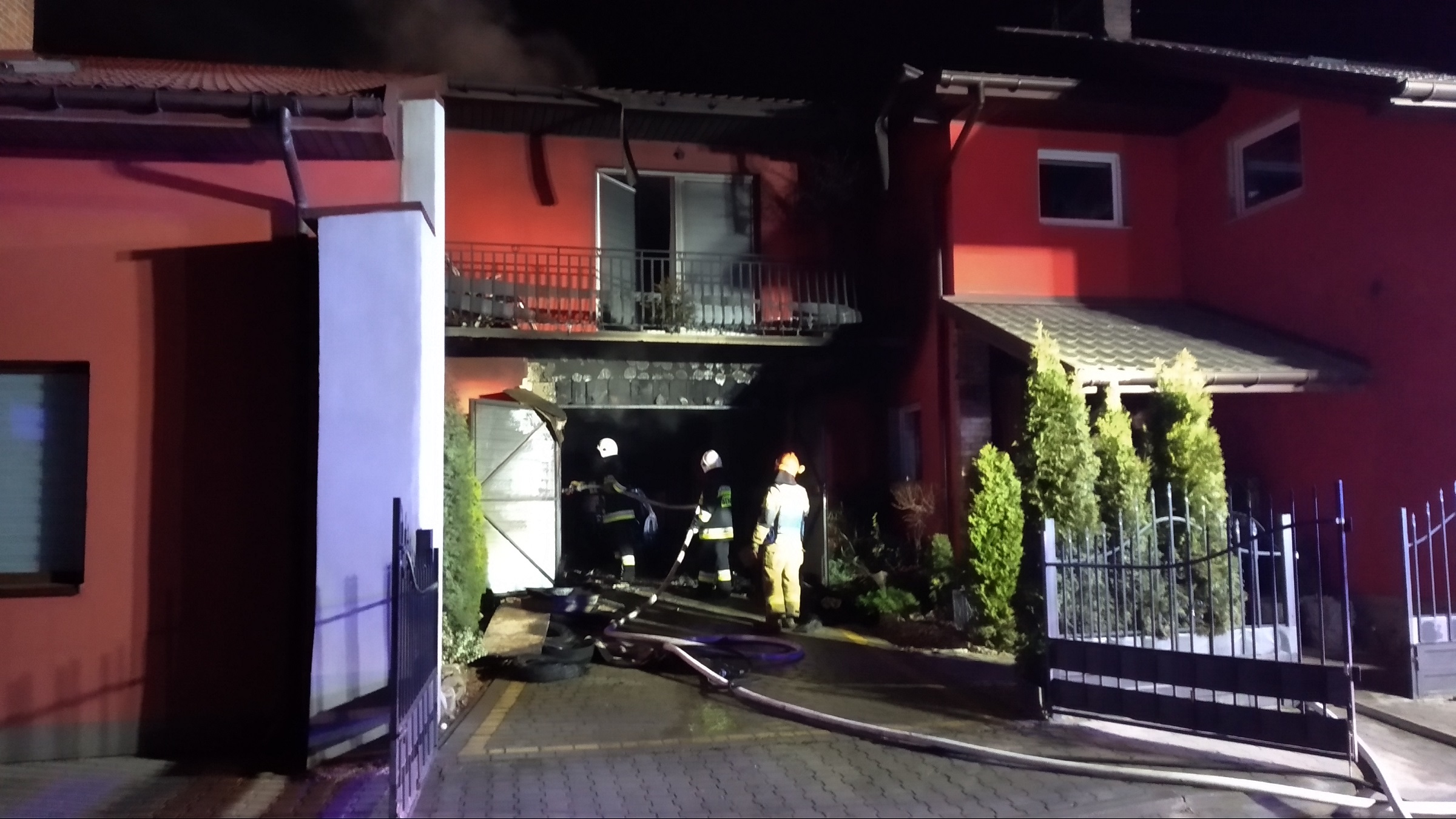 Po dojeździe straży pożarnej na miejsce zdarzenia ustalono, że pożarem objęty jest garaż wraz z samochodem osobowym i budynek gospodarczy oraz zagrożony jest sąsiedni, bezpośrednio przylegający do miejsca zdarzenia, budynek gospodarczy.